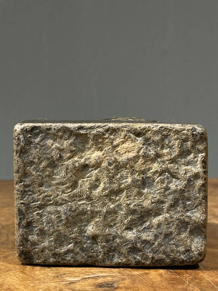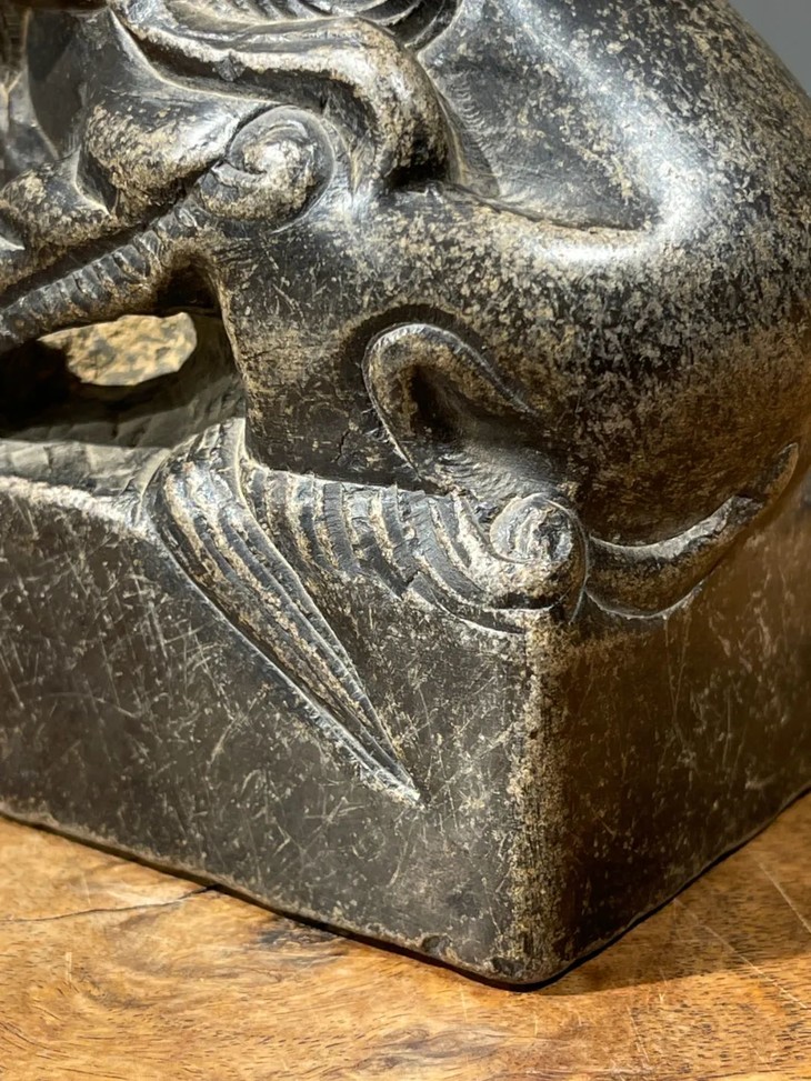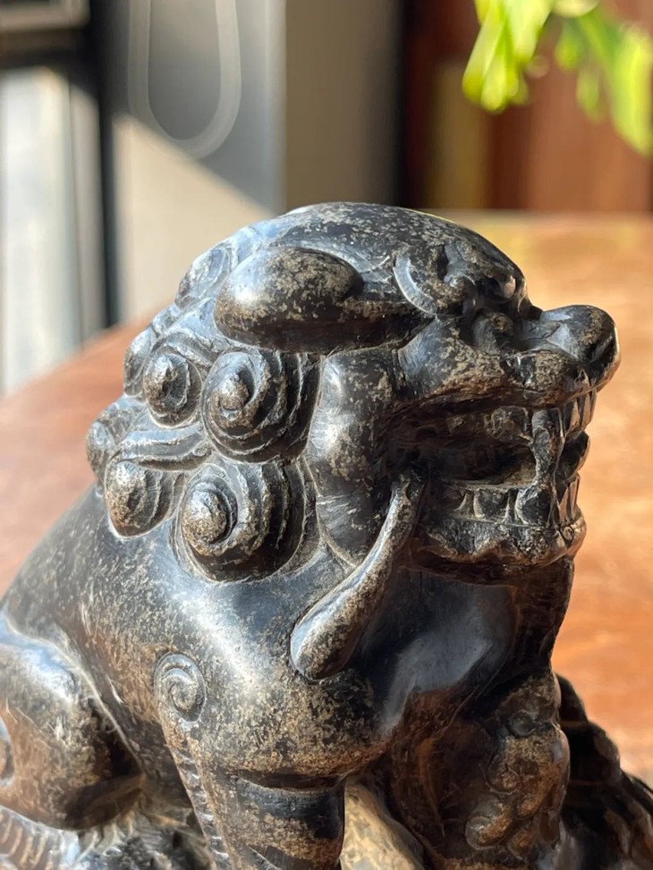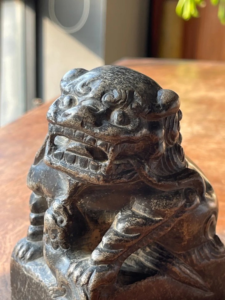 这是一件以青石雕琢而成的子母瑞狮案头摆件,立体圆雕台座上子母嬉戏瑞狮,体态自然生动,母狮左前脚置于昂首嬉戏的幼狮,绣球上,站立方型台座上,镂空雕琢塑型仿生唯妙唯俏,质地坚硬比重高的青石表面包浆浑厚温润,是一件老案头摆设。瑞狮是吉祥兽,所以常用于各种居家摆设。此件青石子母瑞狮案头摆件,除正常使用之表面磨损与边沿小磕伤外,全器包浆醇厚浓郁。局部蒙尘与积垢,可依个人喜好清除表面积垢。尺寸:高:13厘米,长:10厘米,底部长:9.1厘米宽:6.9厘米,重量:1409克。