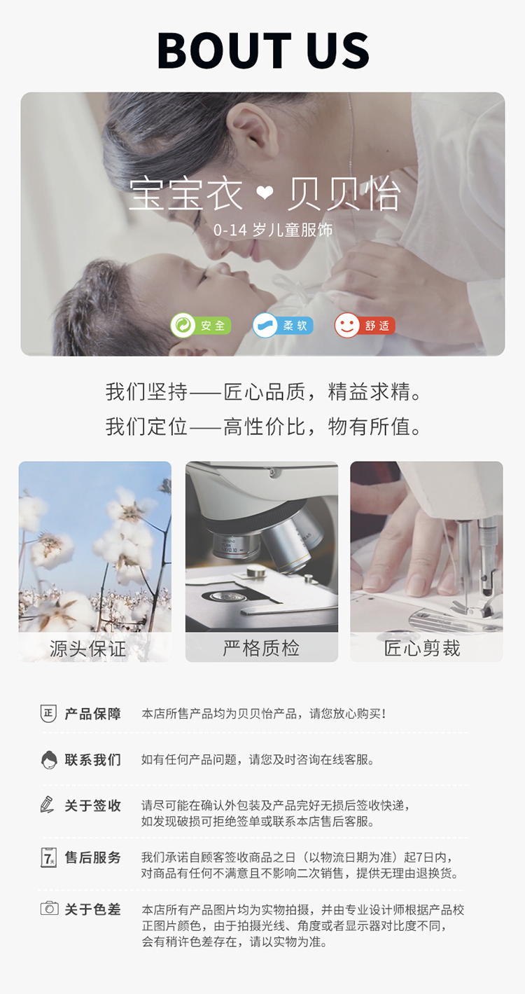 - 贝贝怡专注0-6岁婴幼儿服饰,坚持安全、柔软、舒适的产品理念,为千万中国家庭提供超高品质、安全可靠的婴幼儿服饰产品,妈妈放心,宝宝开心!