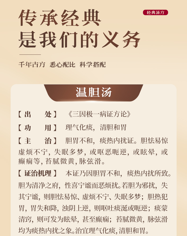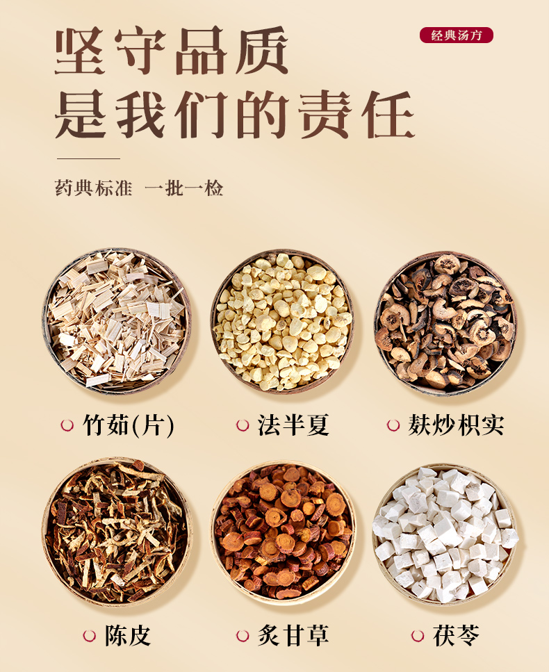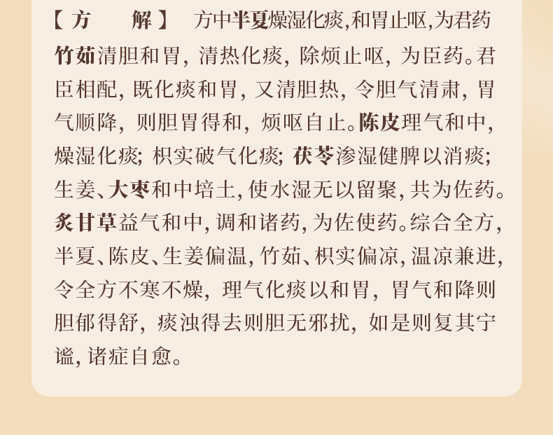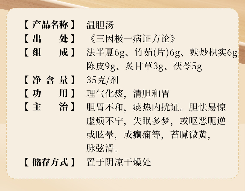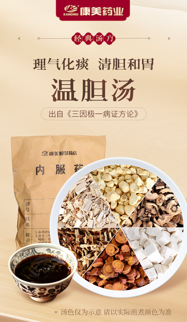 温胆汤35g/剂(法半夏/竹茹/麸炒枳实/陈皮/炙甘草/茯苓) 出自《三因极一病证方论》