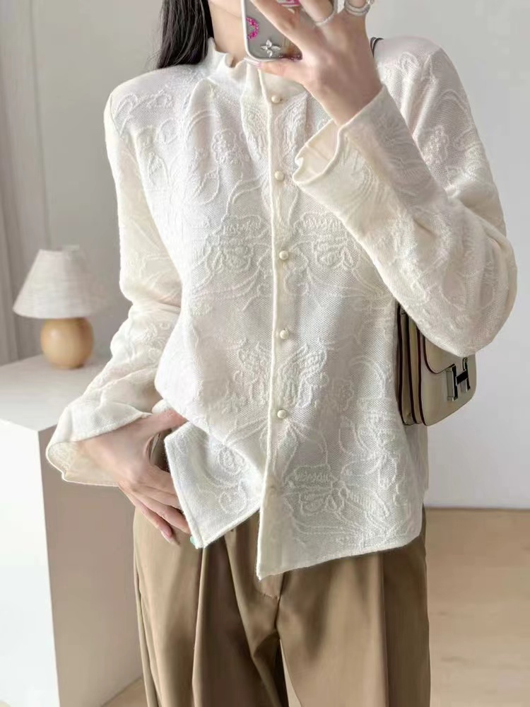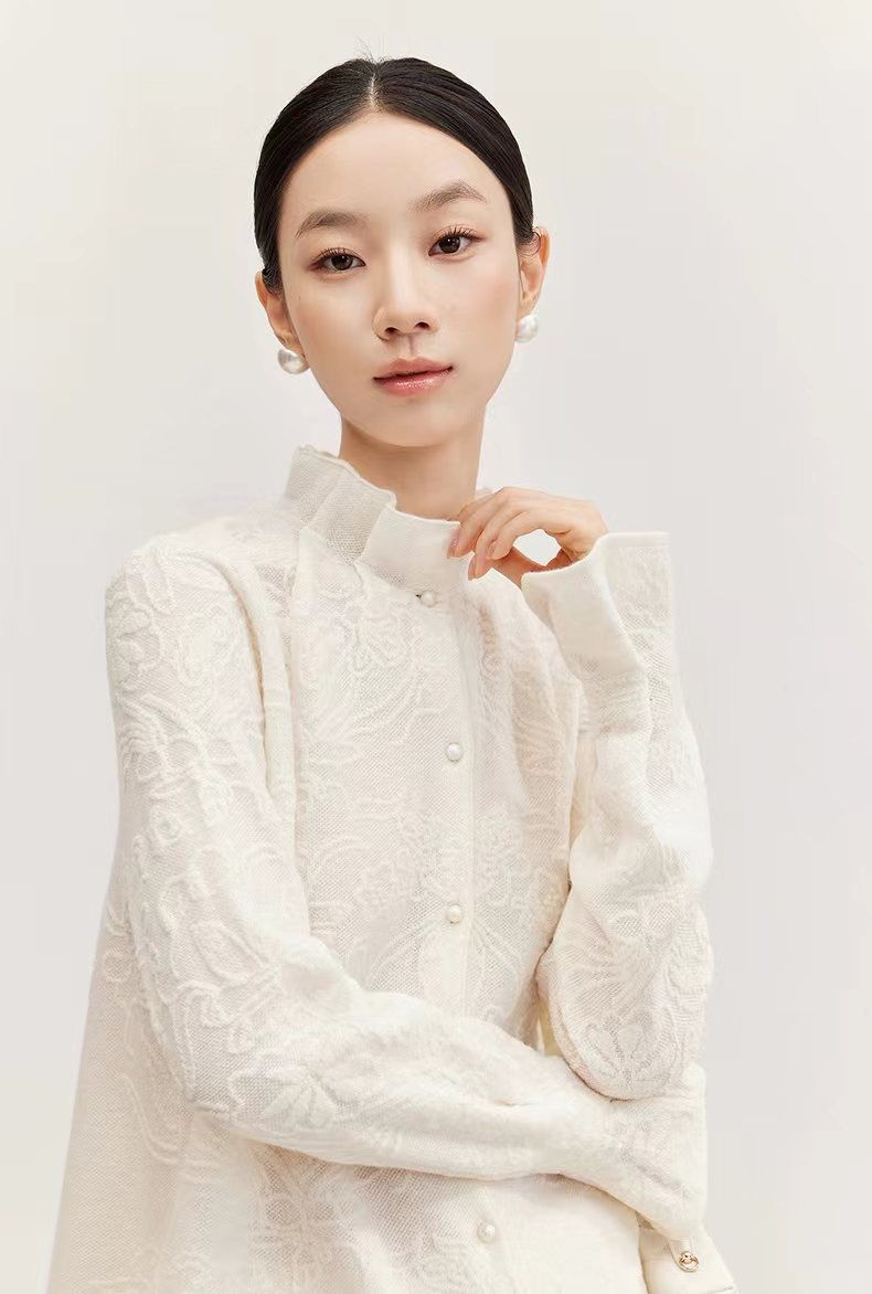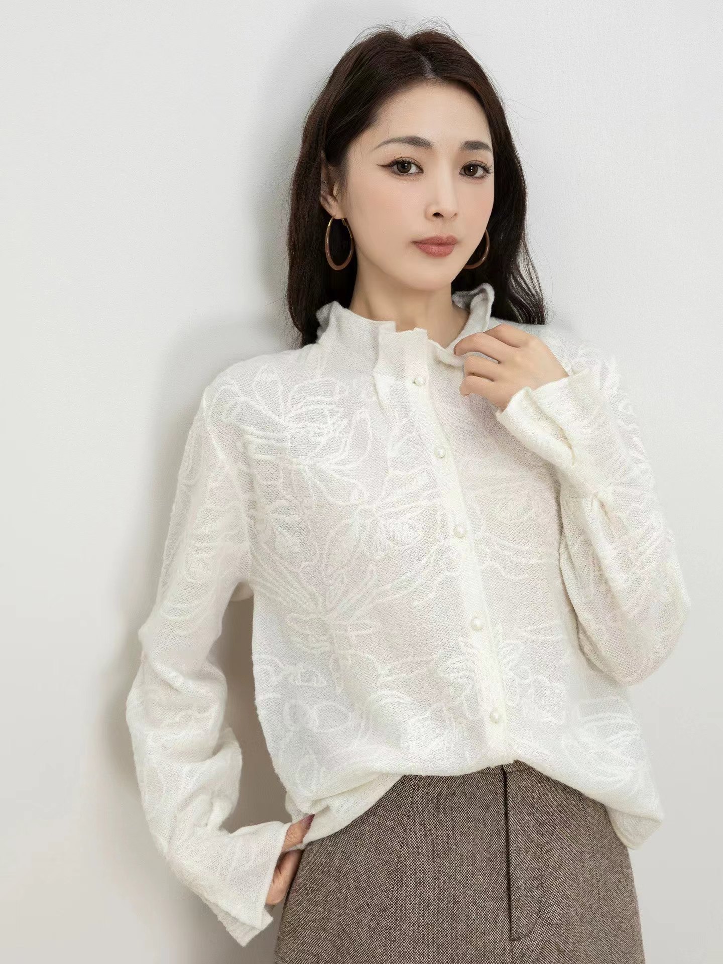 法式气质木耳边半高领立体提花喇叭袖羊毛针织衬衫这件衬衫的版型,我们做了法式木耳边半高领的设计,领子立挺,不会软塌塌地堆在脖子上,修饰脖子,显得人特别挺拔但不会扎皮肤,是很细腻的羊毛,贴肤非常舒服。袖型是微微的喇叭袖,袖口缝制了jing致的荷叶花边。衣身是微收腰的A字剪裁,既保留了衬衫的利落感,又给身体留足了活动空间,整件衣服穿上身,就是那种漫不经心的法式优雅,单穿配白裤子就足够出彩,叠穿在大衣或小香外套里面,更是层次感十足~全身立体提花/边织边钩工艺,面料上的花纹不是印花,而是在织布机上边织边钩出来的立体提花,这种工艺比普通印花耗时多,但能让花纹有凹凸的肌理感,更显糕级,整件衣服从领口到下摆,花纹都是连贯完整的,比纯色衬衫更有层次感!手工定位木耳边/珍珠光泽纽扣,领口木耳边需师傅手工压褶定位,确保每一道褶皱都均匀自然,纽扣我们特别选了珍珠光泽的小圆扣,在不同光线下会有细腻的流光,扣眼做了加固,拿起就穿,穿了就美,细节处处见心思!这就是一件能从秋天穿到春天,能从职场穿到约会的万能内搭,让你在需要脱下外套的室内场合,依然能保持从头到脚的得体与优雅~