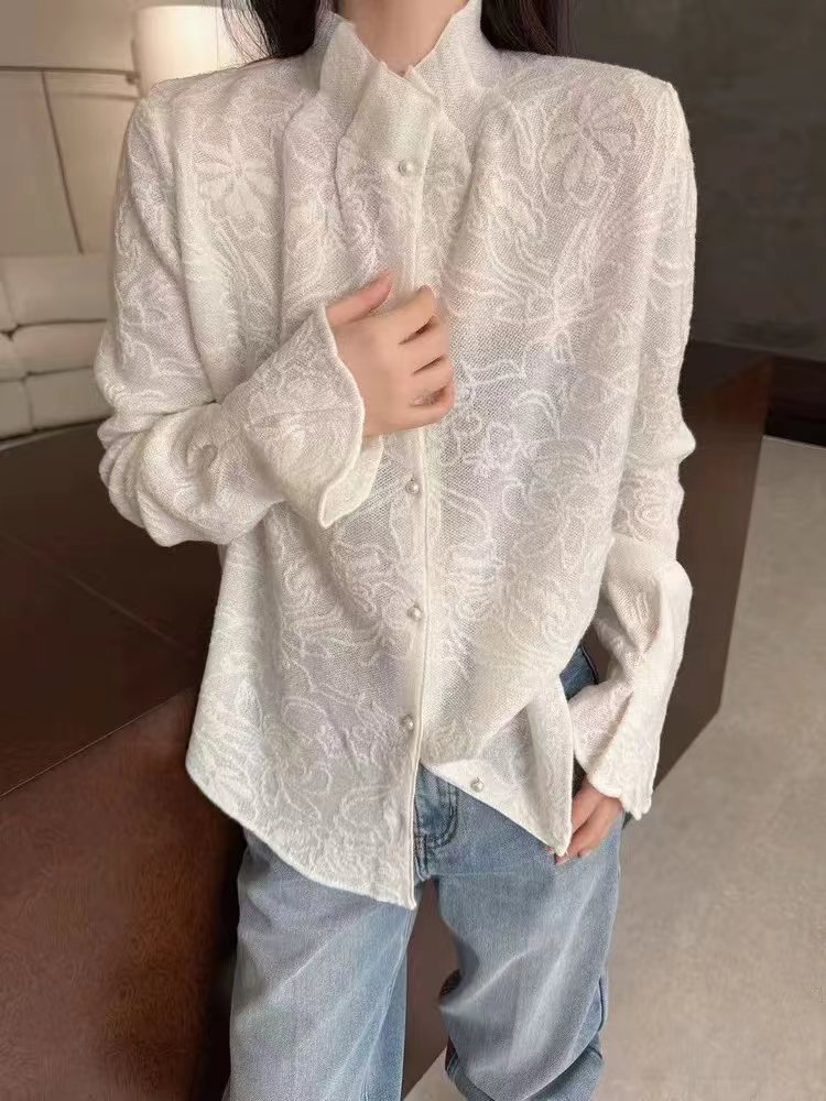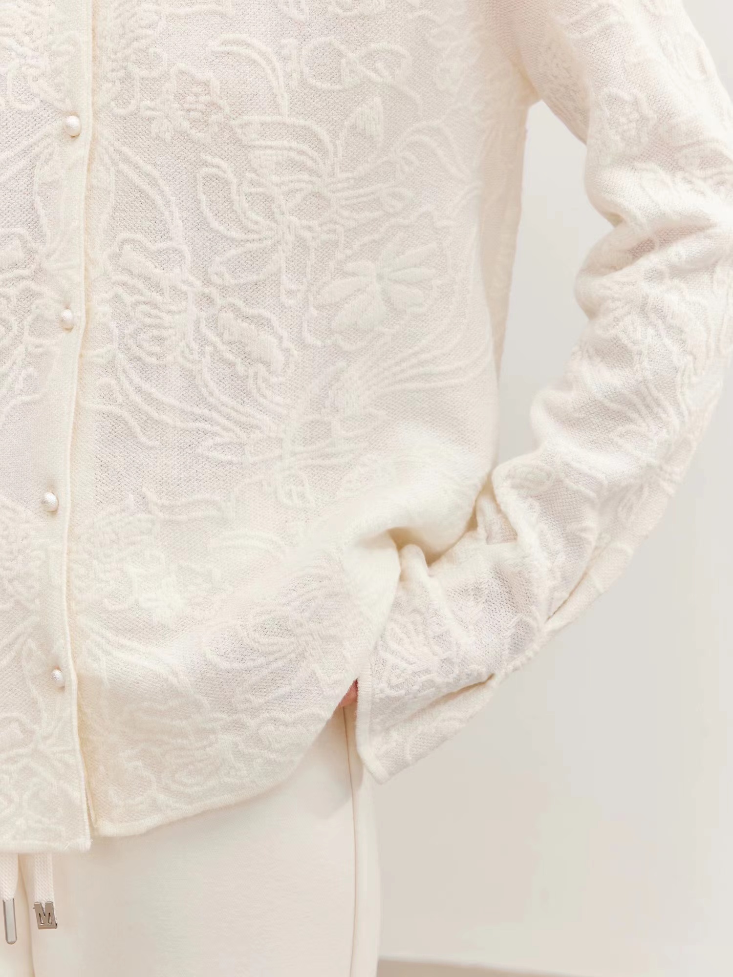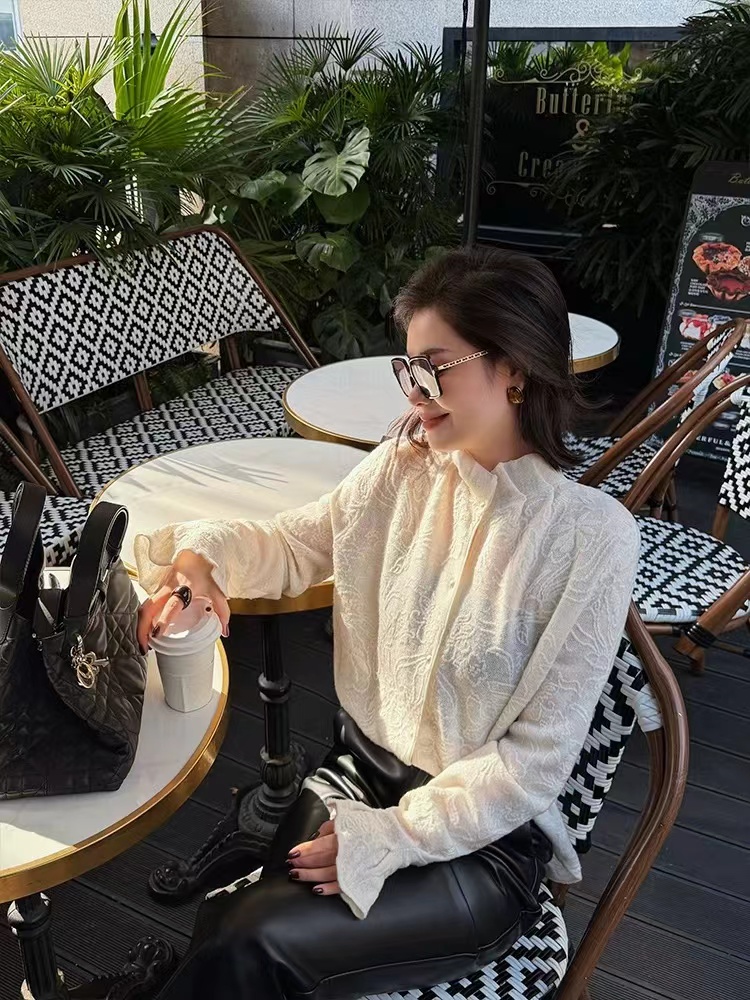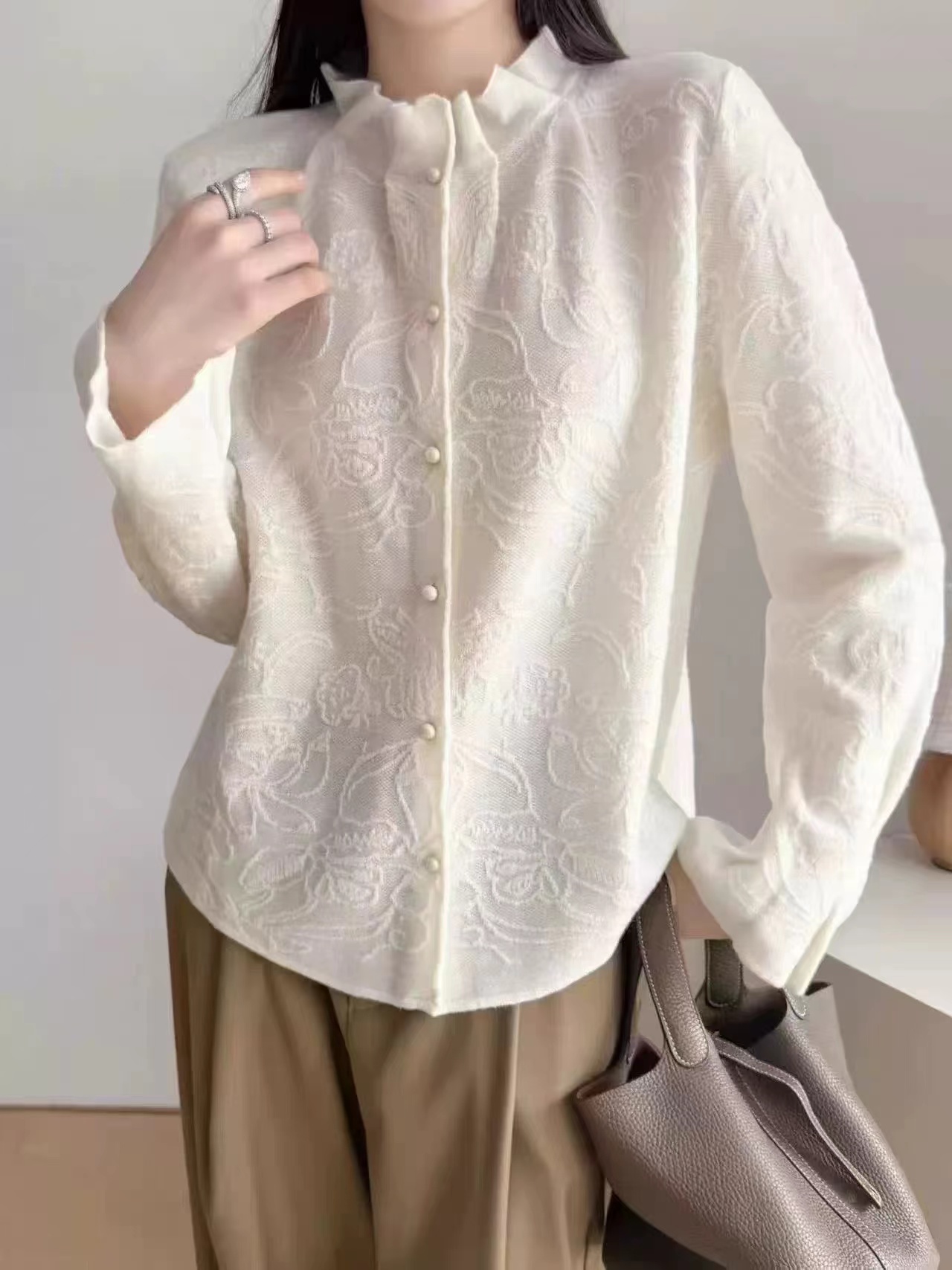 法式气质木耳边半高领立体提花喇叭袖羊毛针织衬衫这件衬衫的版型,我们做了法式木耳边半高领的设计,领子立挺,不会软塌塌地堆在脖子上,修饰脖子,显得人特别挺拔但不会扎皮肤,是很细腻的羊毛,贴肤非常舒服。袖型是微微的喇叭袖,袖口缝制了jing致的荷叶花边。衣身是微收腰的A字剪裁,既保留了衬衫的利落感,又给身体留足了活动空间,整件衣服穿上身,就是那种漫不经心的法式优雅,单穿配白裤子就足够出彩,叠穿在大衣或小香外套里面,更是层次感十足~全身立体提花/边织边钩工艺,面料上的花纹不是印花,而是在织布机上边织边钩出来的立体提花,这种工艺比普通印花耗时多,但能让花纹有凹凸的肌理感,更显糕级,整件衣服从领口到下摆,花纹都是连贯完整的,比纯色衬衫更有层次感!手工定位木耳边/珍珠光泽纽扣,领口木耳边需师傅手工压褶定位,确保每一道褶皱都均匀自然,纽扣我们特别选了珍珠光泽的小圆扣,在不同光线下会有细腻的流光,扣眼做了加固,拿起就穿,穿了就美,细节处处见心思!这就是一件能从秋天穿到春天,能从职场穿到约会的万能内搭,让你在需要脱下外套的室内场合,依然能保持从头到脚的得体与优雅~