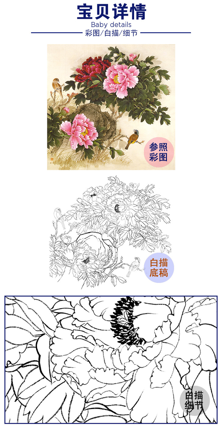 竖幅工笔花鸟白描底稿-牡丹鸽子-李晓明-A133