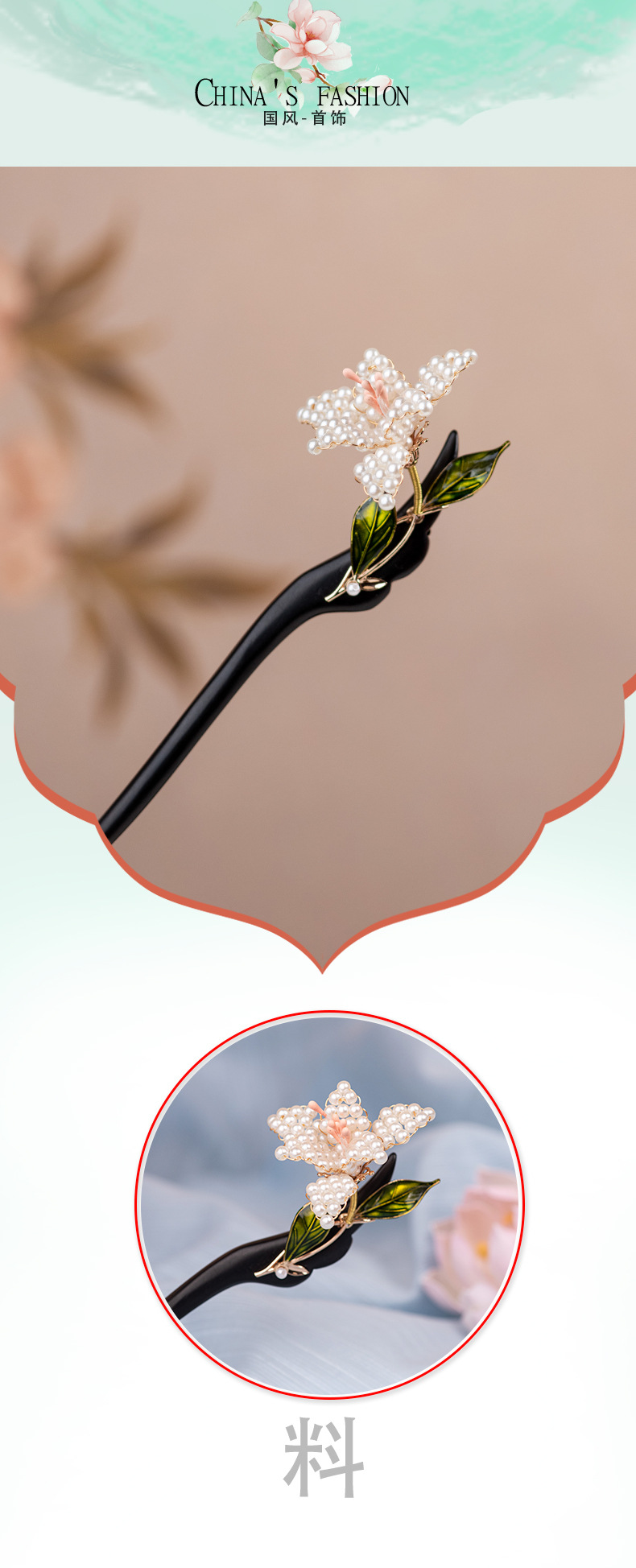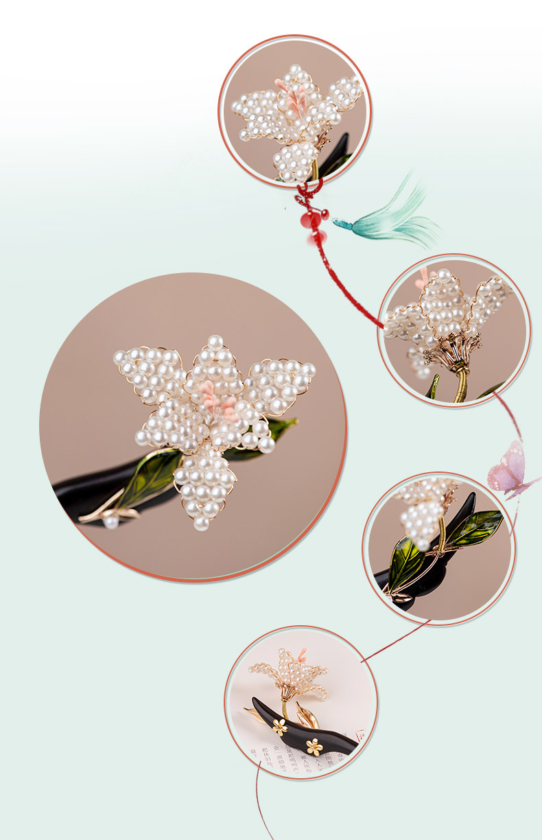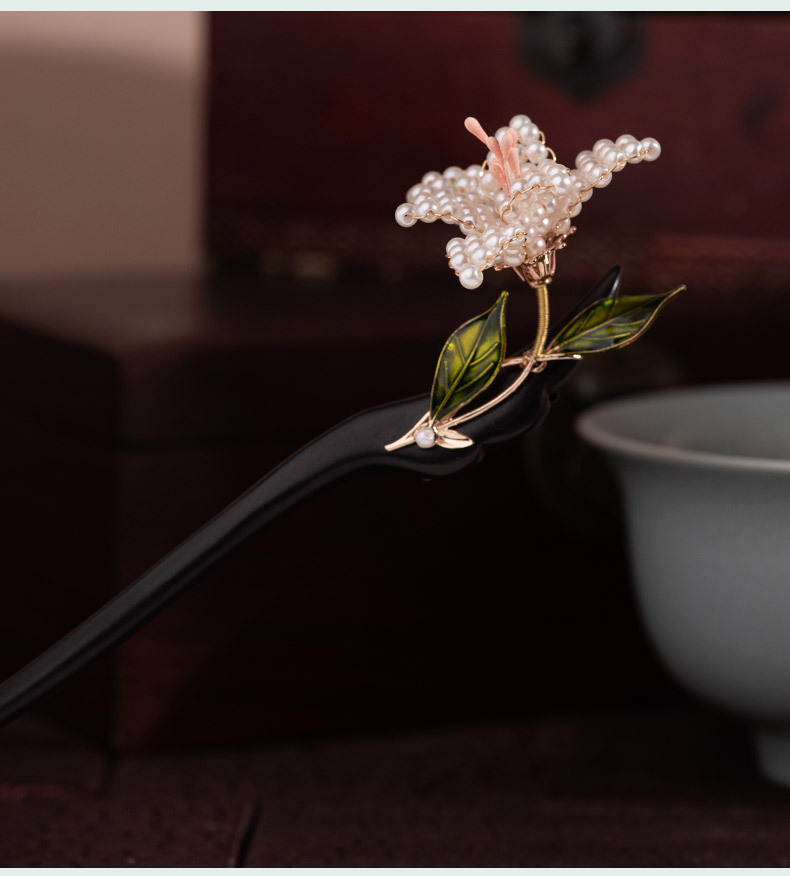 JGL新中式檀木发簪女古风汉服旗袍簪子珍珠花朵发簪双面设计立体发钗