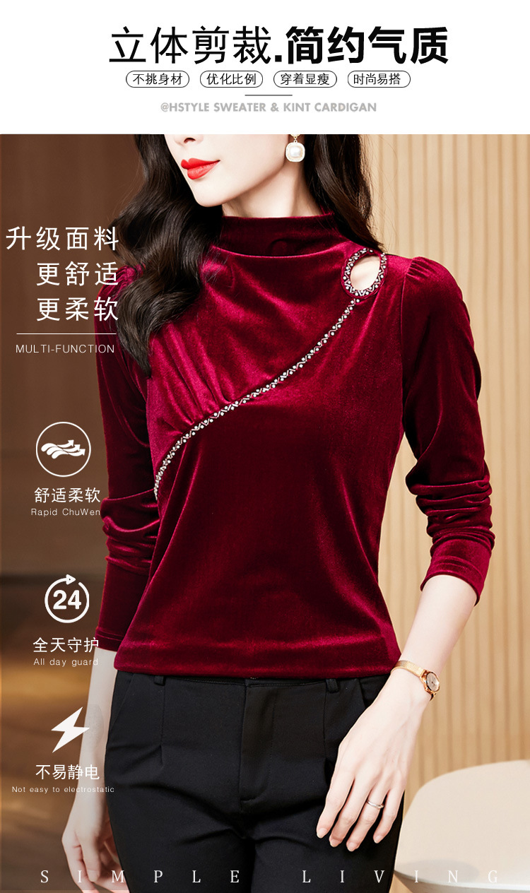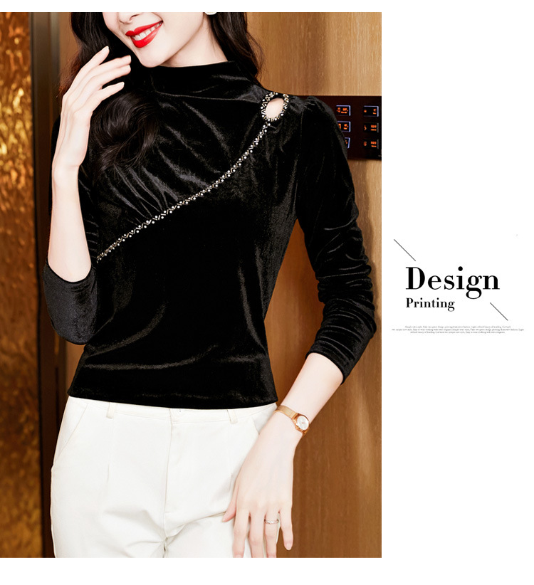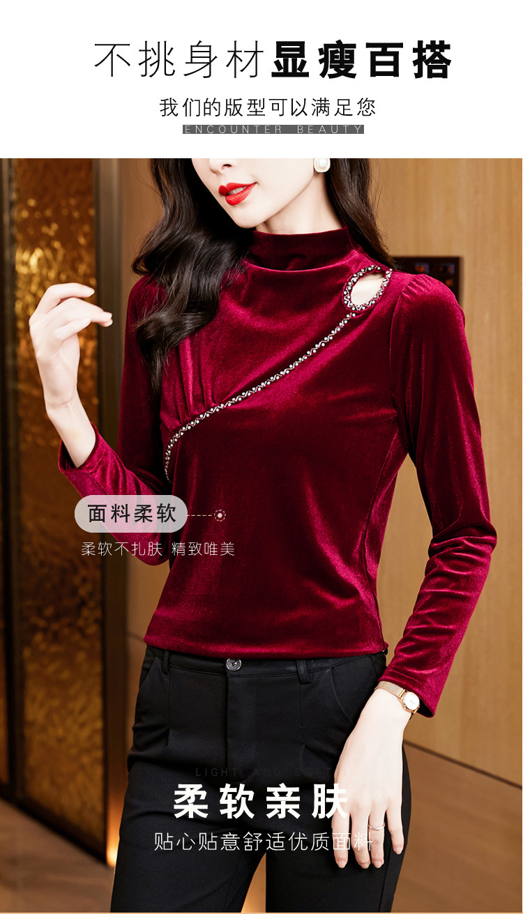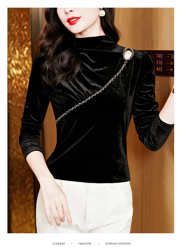 KQL-E37M2712气质百搭高领镂空钉珠丝绒长袖打底衫修身显瘦T恤女