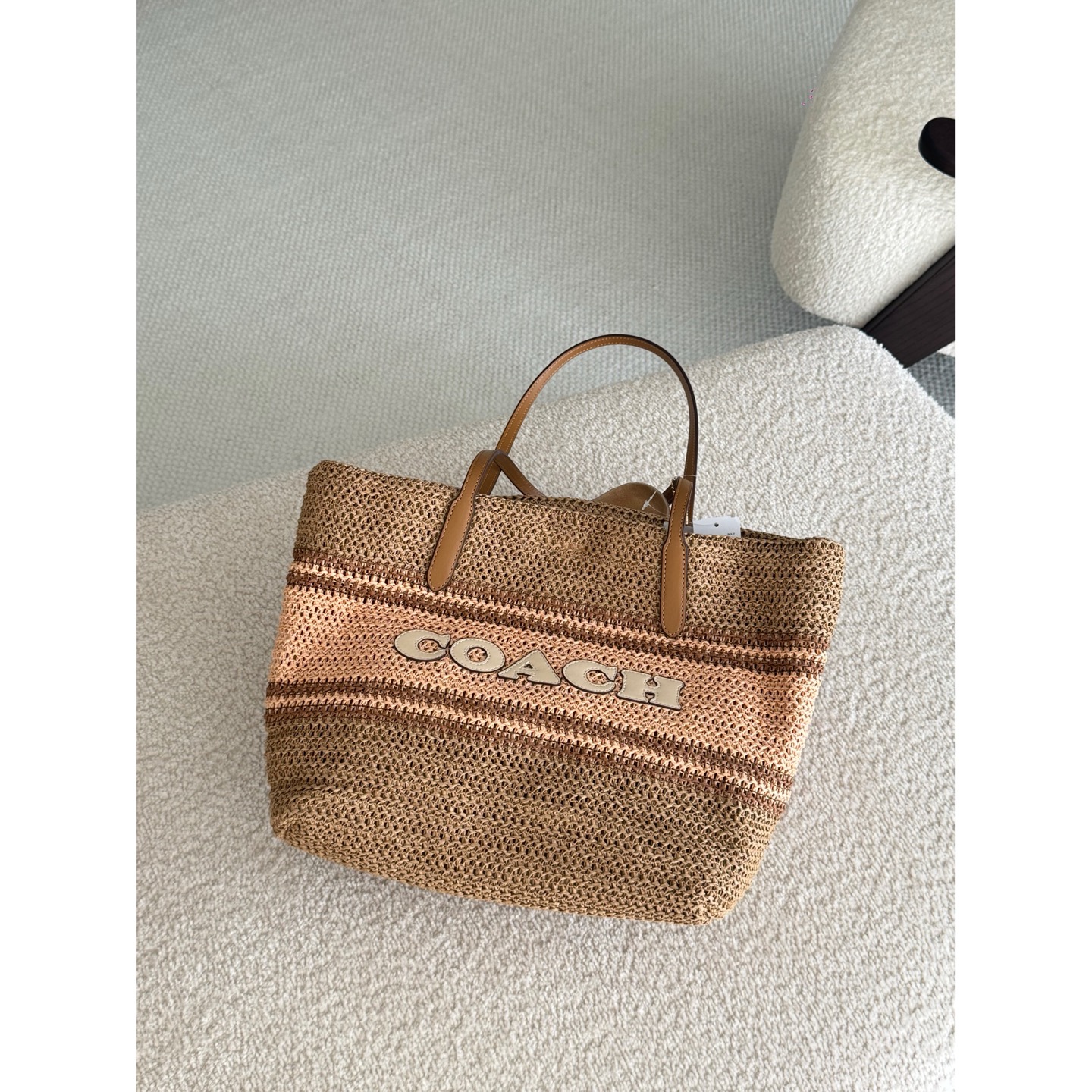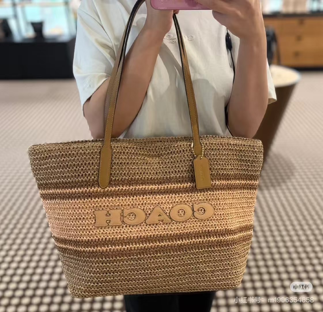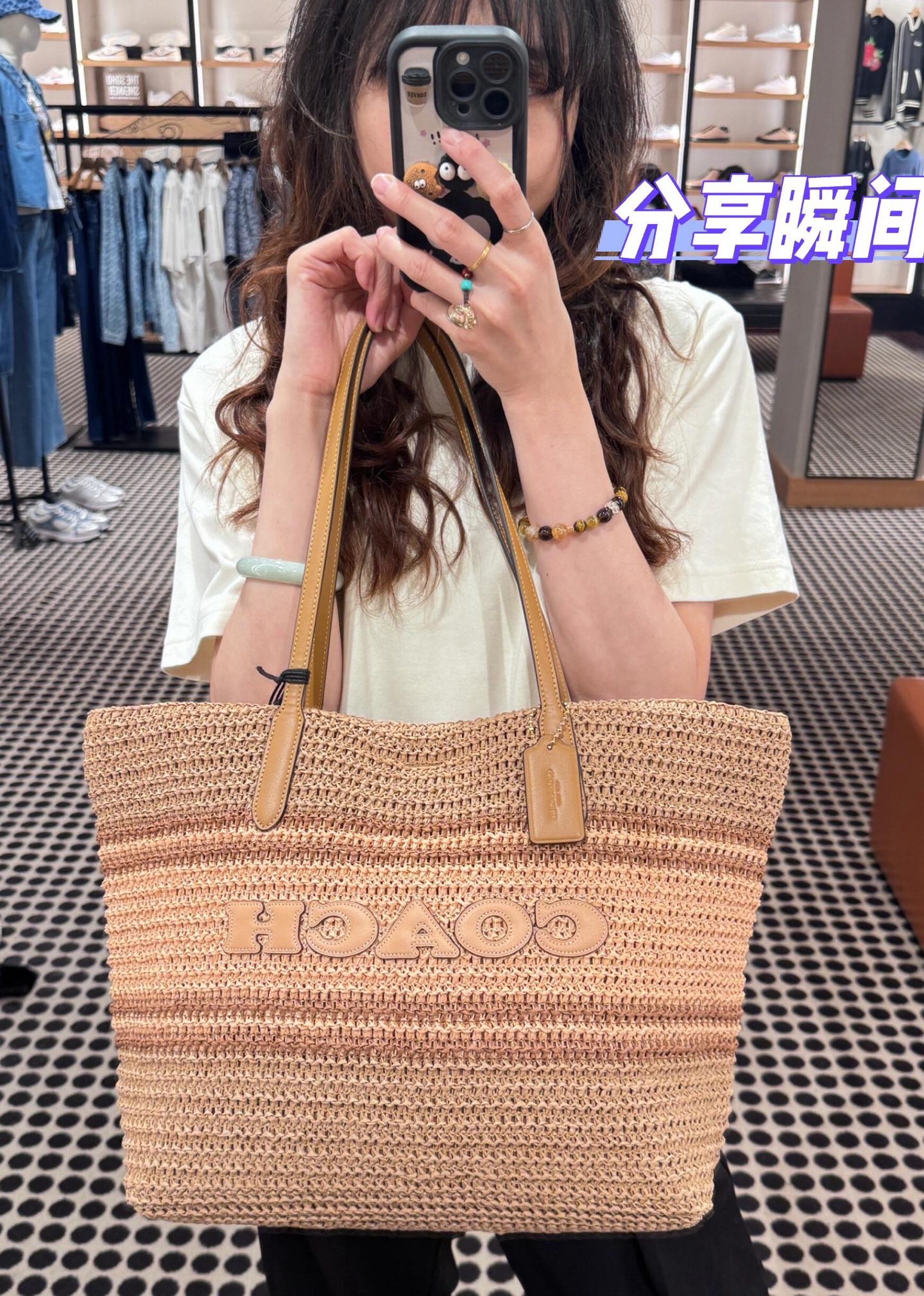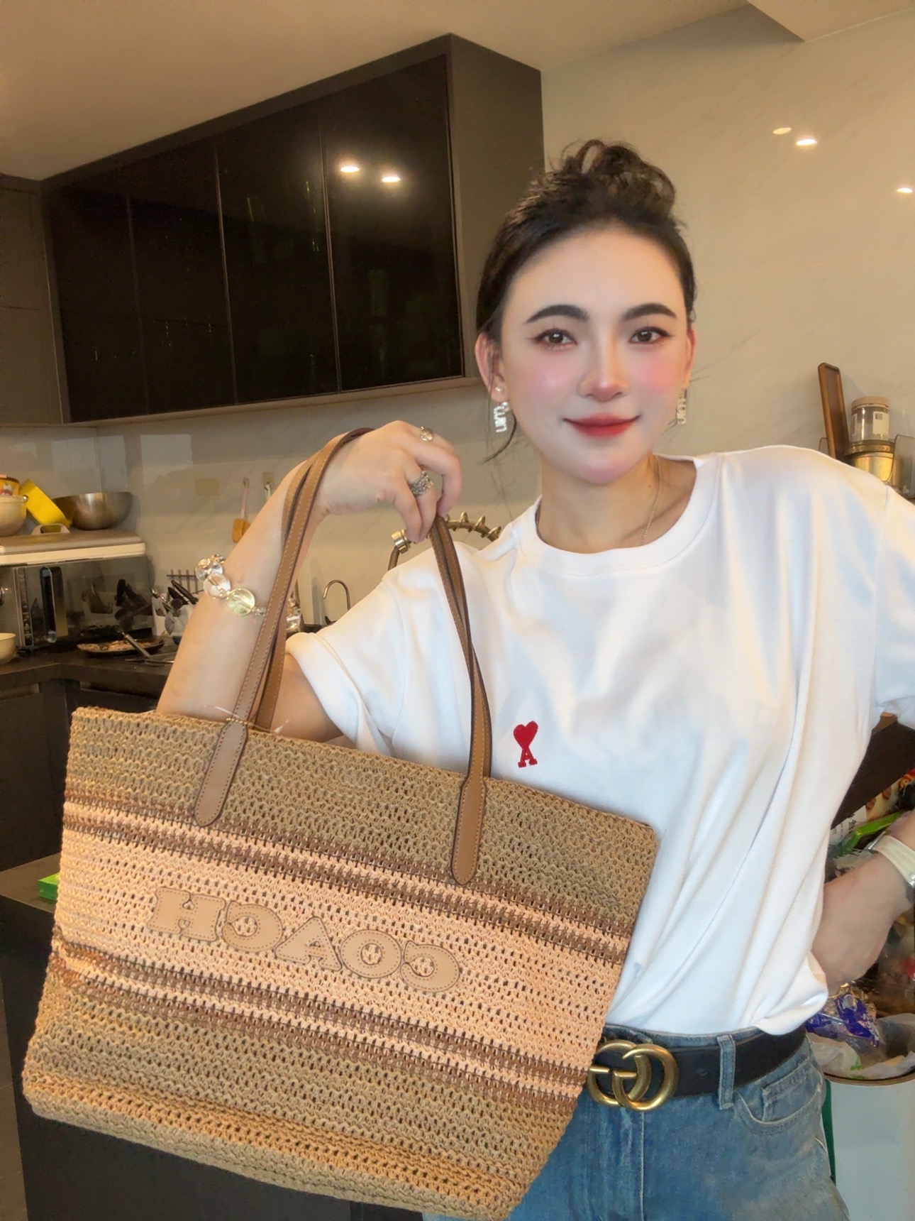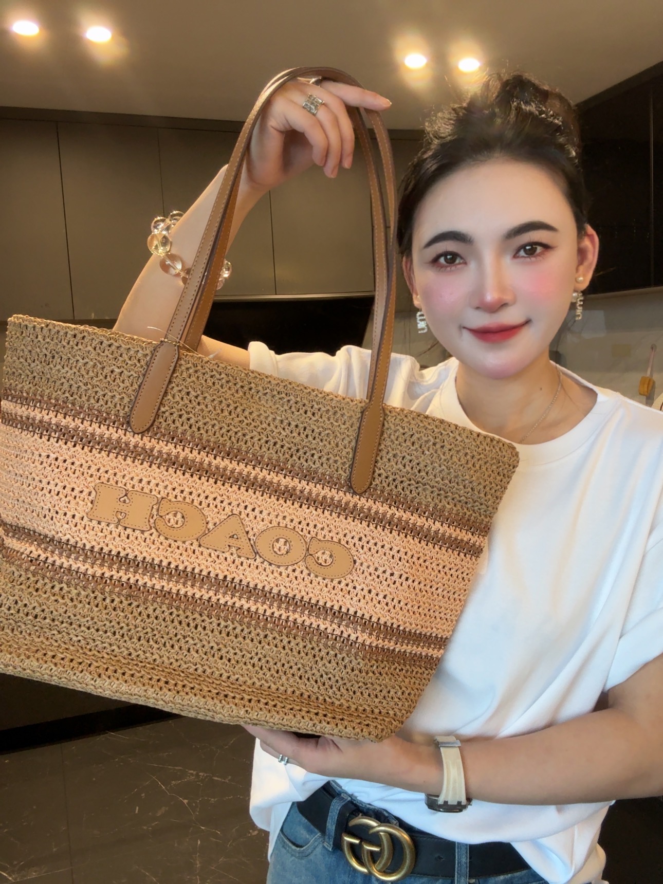 Coa&ch拉菲草编托特包,纯老鼠 保真‼️ 渠环保编织,精致机织一体成型多色拼接,大容量托特包,春夏必备的新款价格也非常友好!纯正的马达加斯加拉菲亚草➕纯手工传统打造】唯有最顶级的拉菲亚草才能在编艺师的手中成为一件完美的艺术品!(纯天然拉菲草➕纯手工传统缝纫缝合,每一只都是独一无二的存在! 其筛选过程很严格(拉菲亚树叶材质中,必须挑选最上乘的80%,确保材质颜色统一质感柔韧);其手工很繁复(编织一个,拉菲亚包包需要一位纯熟手工制包师48小时的宝贵时光)它将传统手工艺和前卫摩登的时尚元素解构重组,不亚于制作一件精美的珠宝!!!所以,它呈现的是返璞归真的自然之美:肉眼感受这回归我们小时候最初本心的自然之作!看到这样的美物,如何能让人不心生欢喜?
