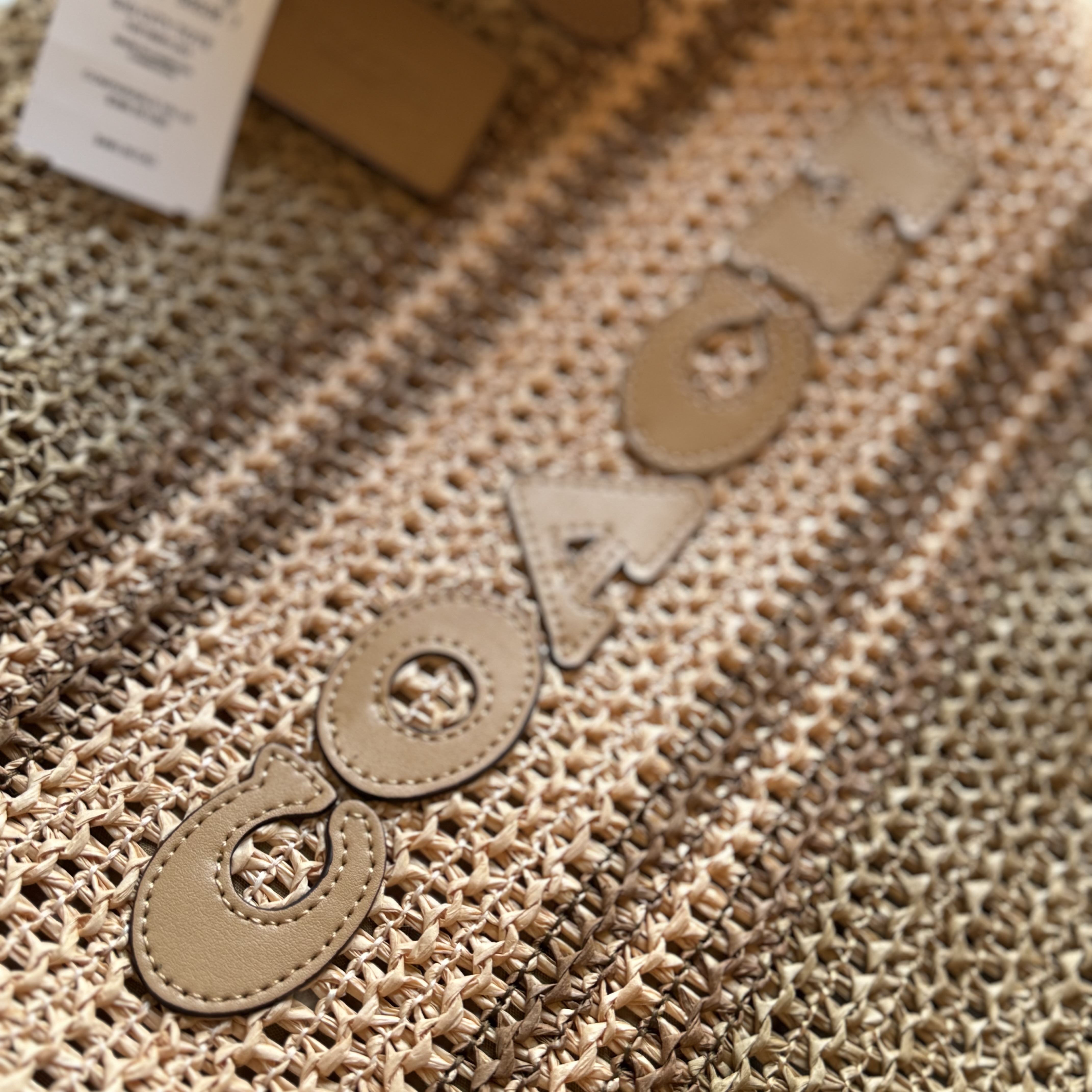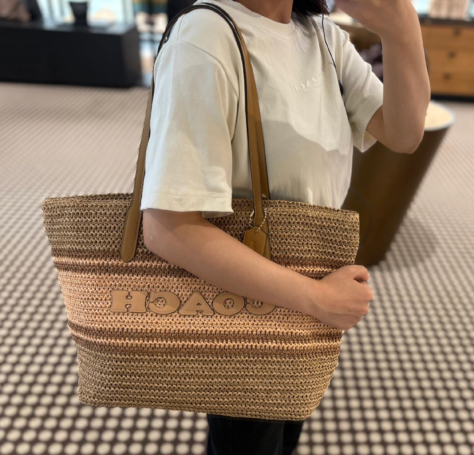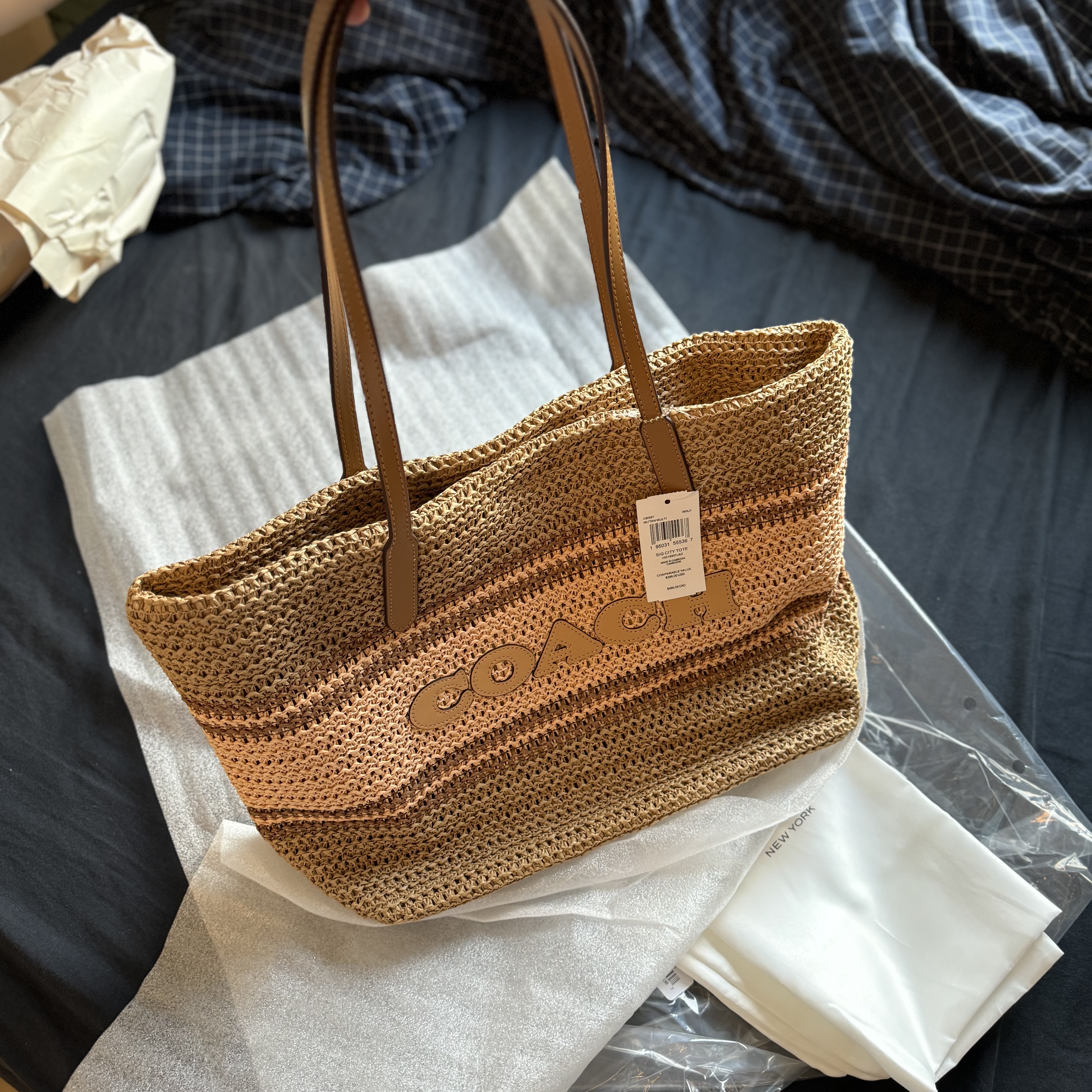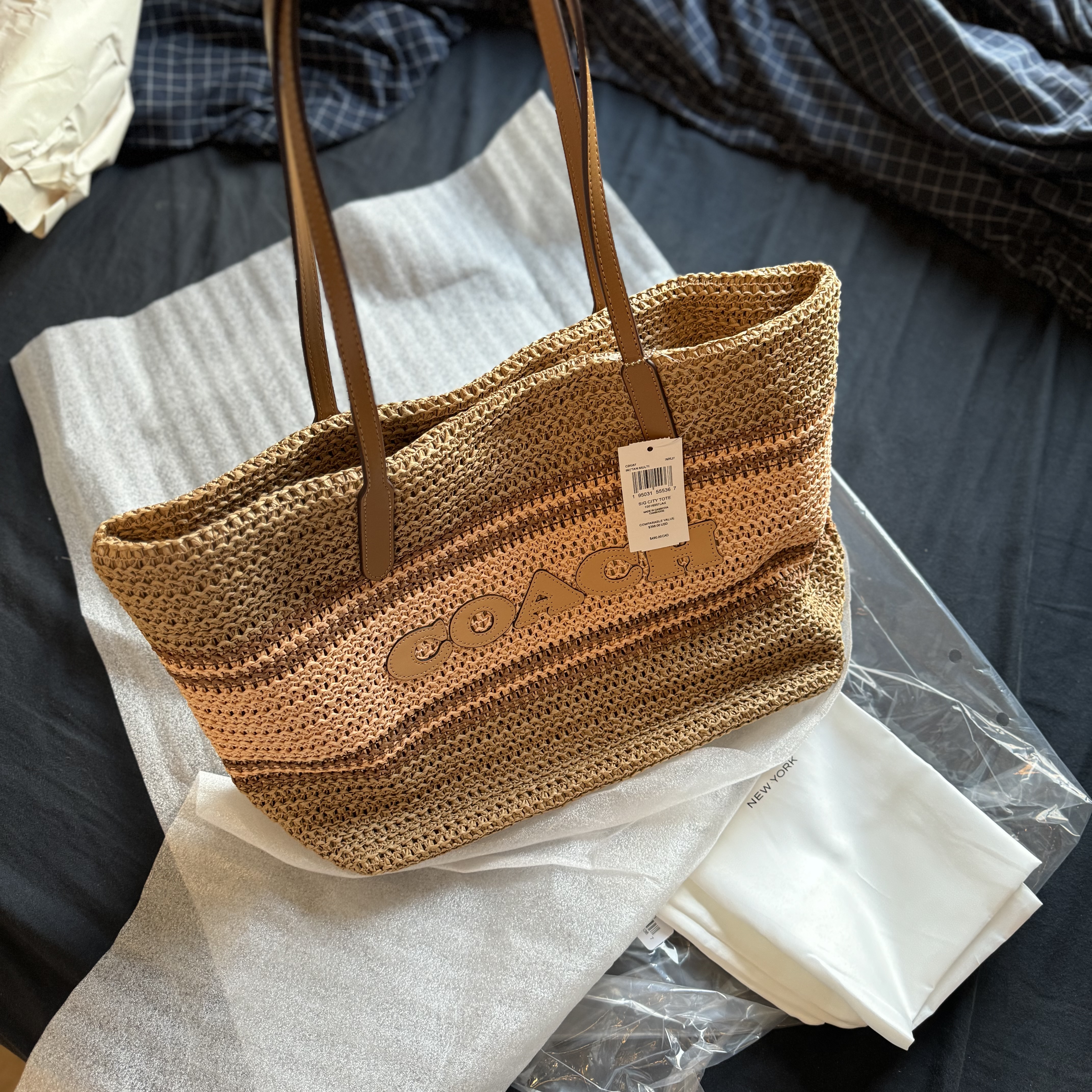 Coa&ch拉菲草编托特包,纯老鼠 保真‼️ 渠环保编织,精致机织一体成型多色拼接,大容量托特包,春夏必备的新款价格也非常友好!纯正的马达加斯加拉菲亚草➕纯手工传统打造】唯有最顶级的拉菲亚草才能在编艺师的手中成为一件完美的艺术品!(纯天然拉菲草➕纯手工传统缝纫缝合,每一只都是独一无二的存在! 其筛选过程很严格(拉菲亚树叶材质中,必须挑选最上乘的80%,确保材质颜色统一质感柔韧);其手工很繁复(编织一个,拉菲亚包包需要一位纯熟手工制包师48小时的宝贵时光)它将传统手工艺和前卫摩登的时尚元素解构重组,不亚于制作一件精美的珠宝!!!所以,它呈现的是返璞归真的自然之美:肉眼感受这回归我们小时候最初本心的自然之作!看到这样的美物,如何能让人不心生欢喜?
