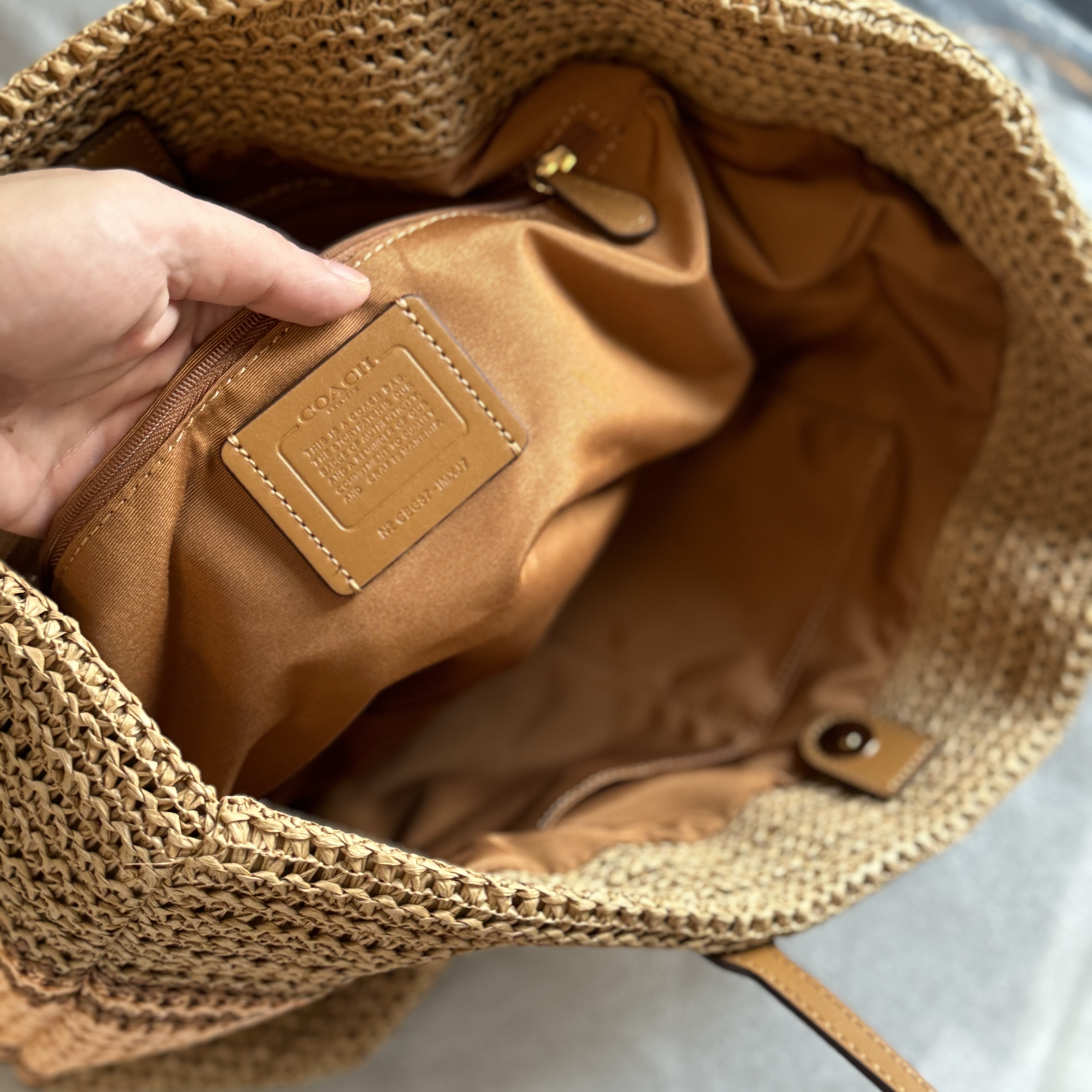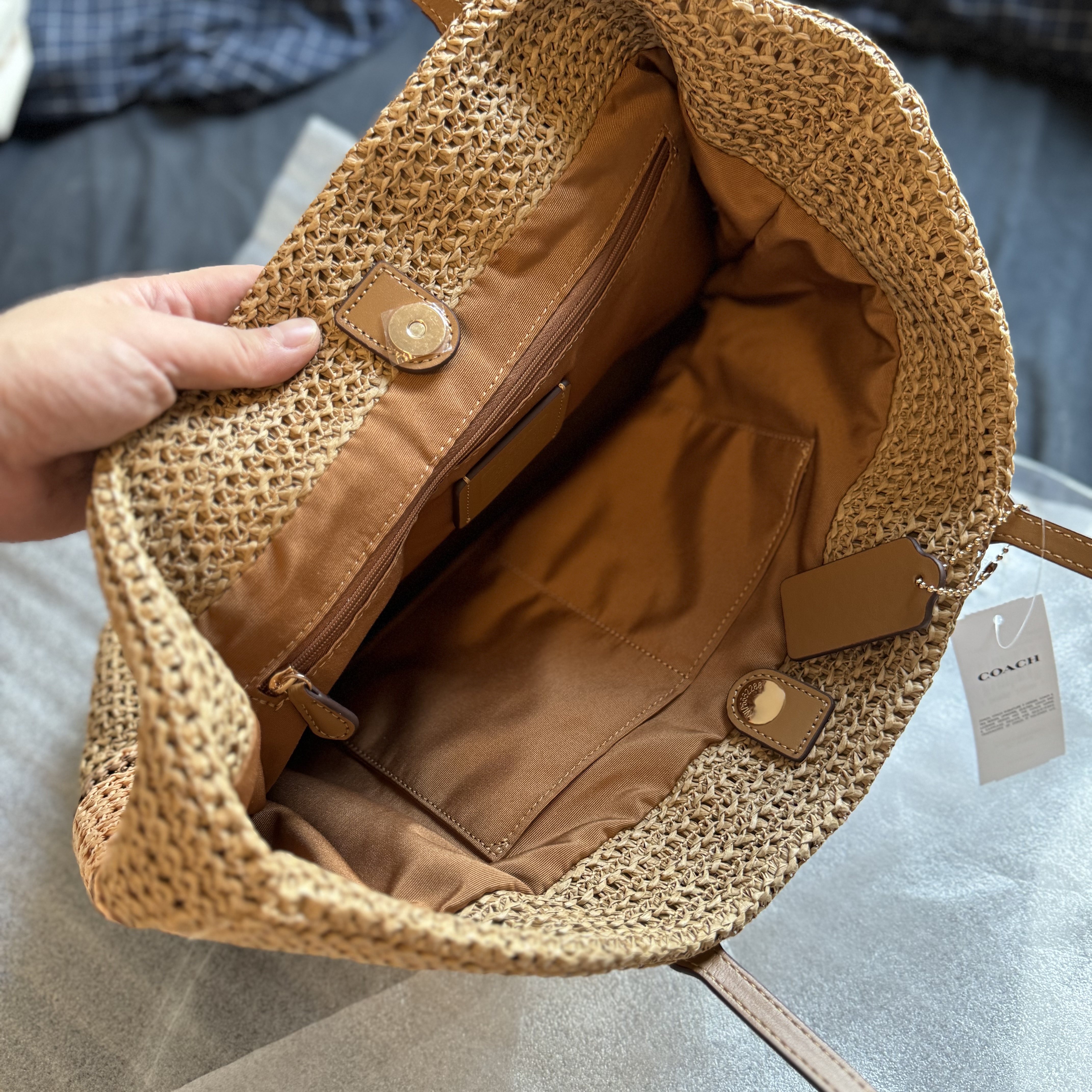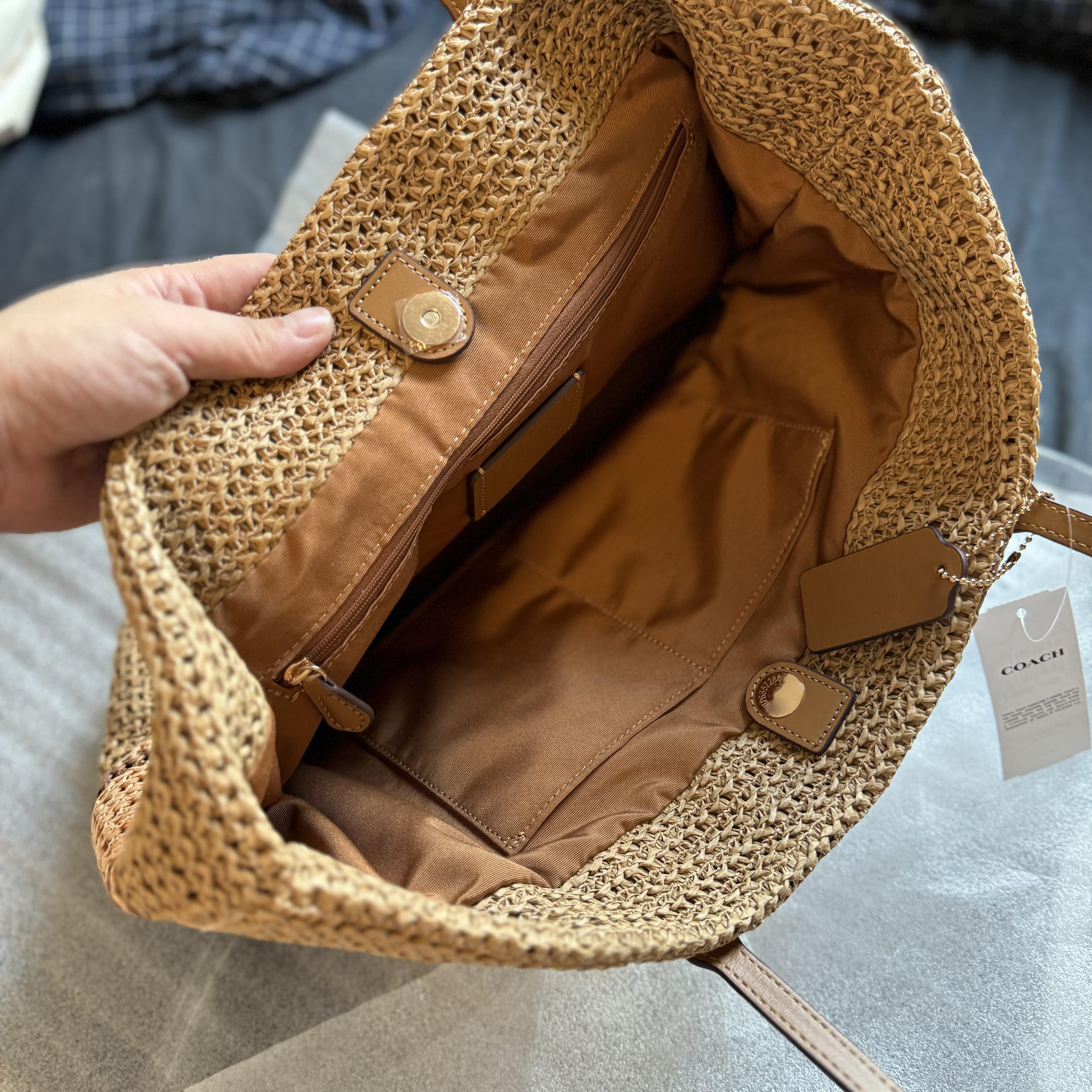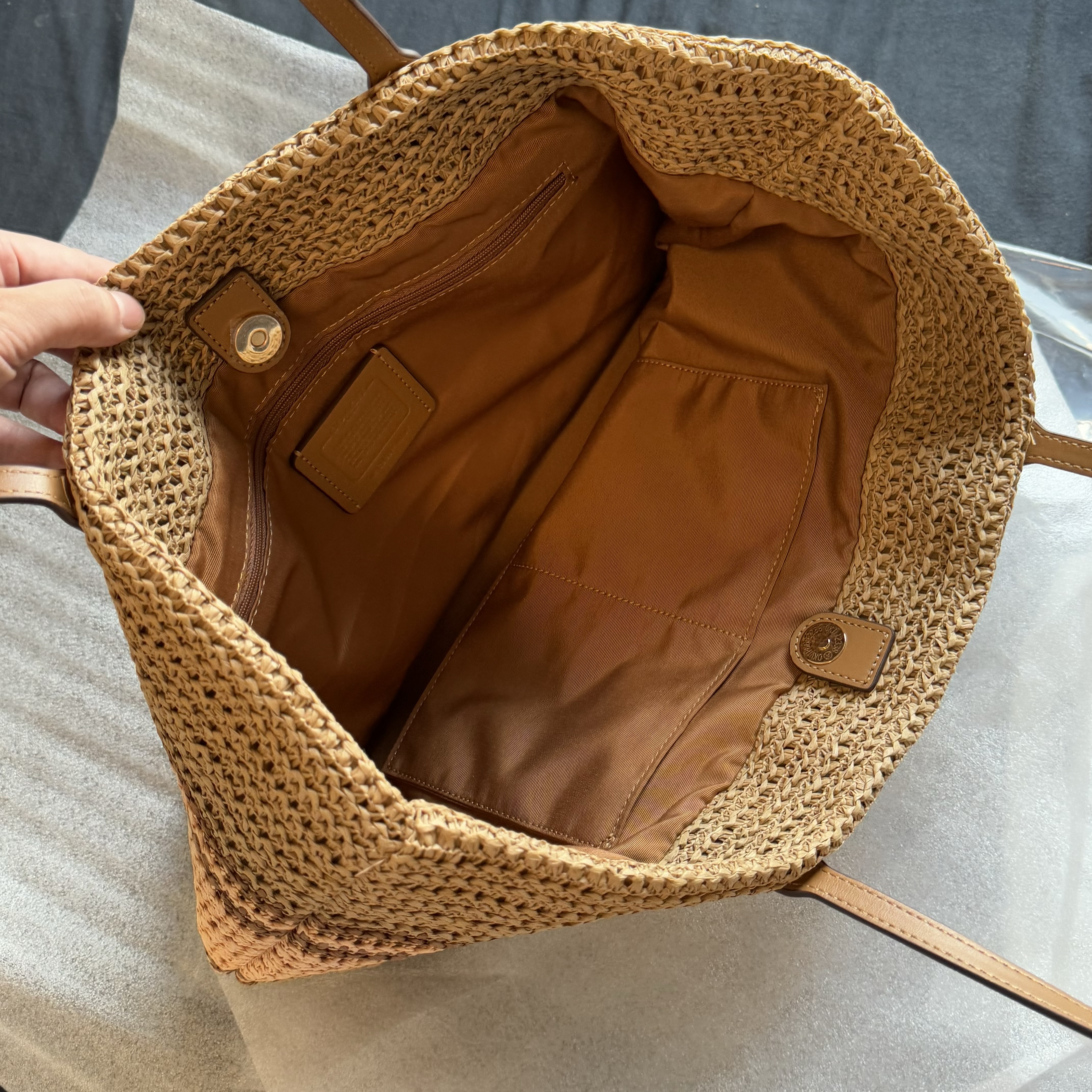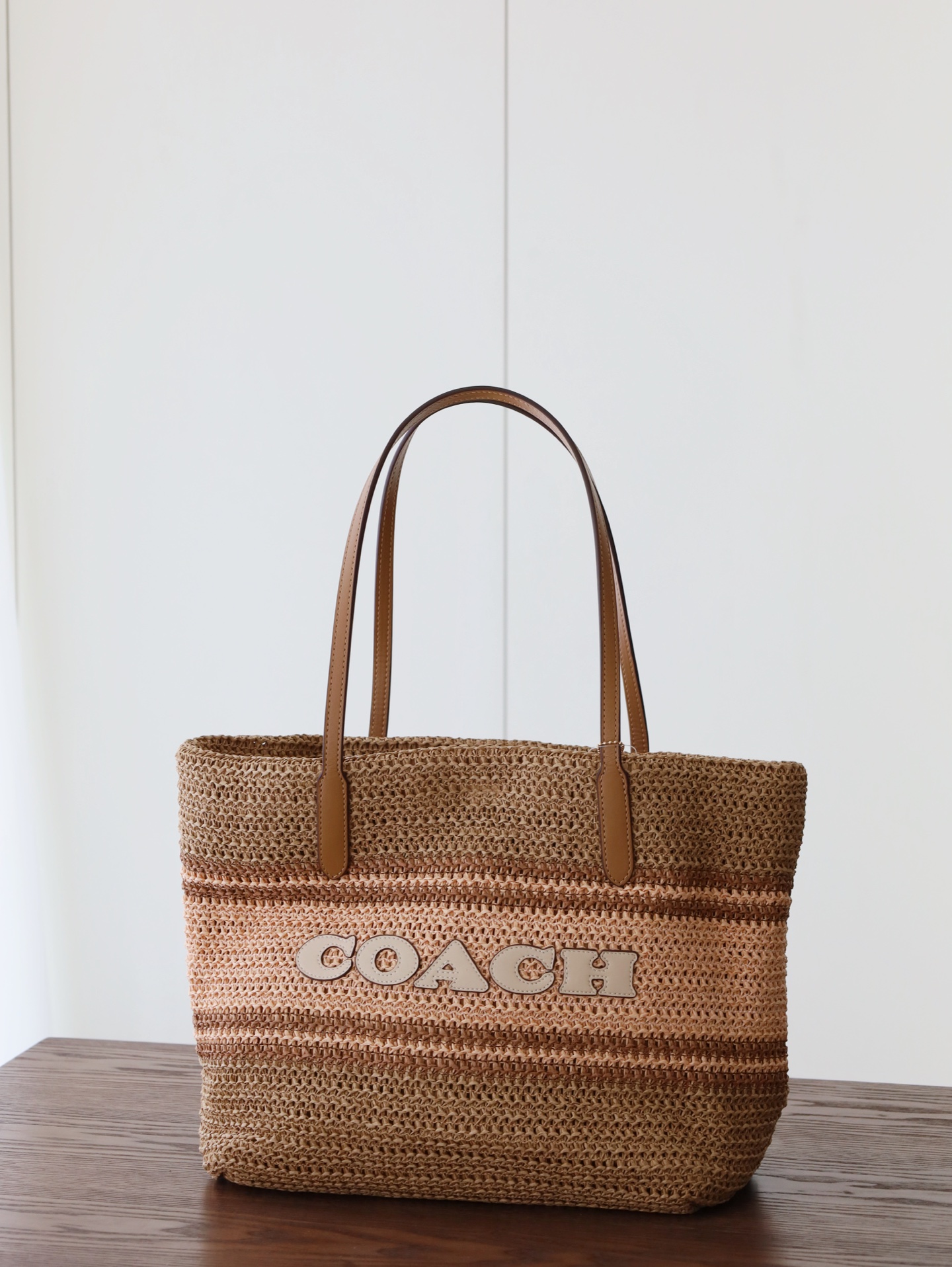 Coa&ch拉菲草编托特包,纯老鼠 保真‼️ 渠环保编织,精致机织一体成型多色拼接,大容量托特包,春夏必备的新款价格也非常友好!纯正的马达加斯加拉菲亚草➕纯手工传统打造】唯有最顶级的拉菲亚草才能在编艺师的手中成为一件完美的艺术品!(纯天然拉菲草➕纯手工传统缝纫缝合,每一只都是独一无二的存在! 其筛选过程很严格(拉菲亚树叶材质中,必须挑选最上乘的80%,确保材质颜色统一质感柔韧);其手工很繁复(编织一个,拉菲亚包包需要一位纯熟手工制包师48小时的宝贵时光)它将传统手工艺和前卫摩登的时尚元素解构重组,不亚于制作一件精美的珠宝!!!所以,它呈现的是返璞归真的自然之美:肉眼感受这回归我们小时候最初本心的自然之作!看到这样的美物,如何能让人不心生欢喜?