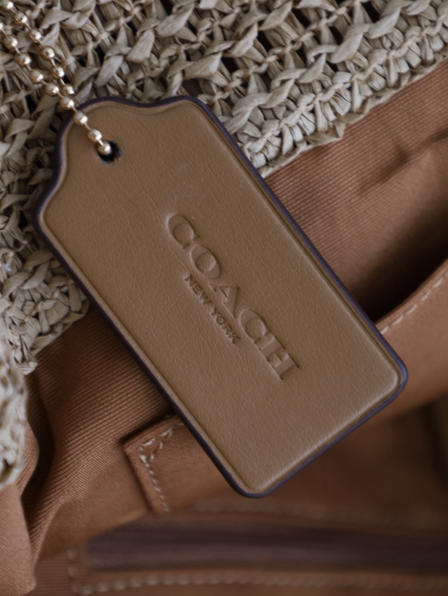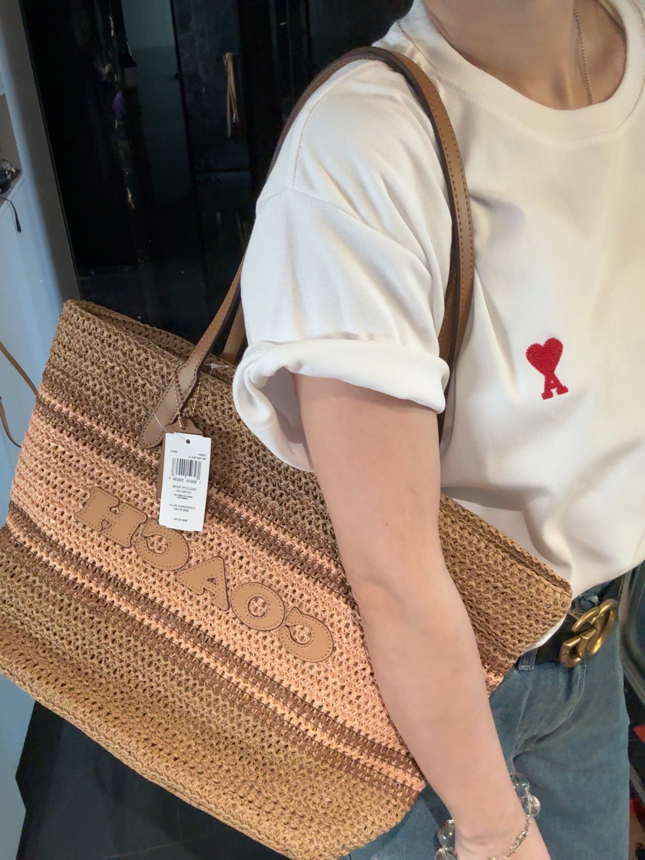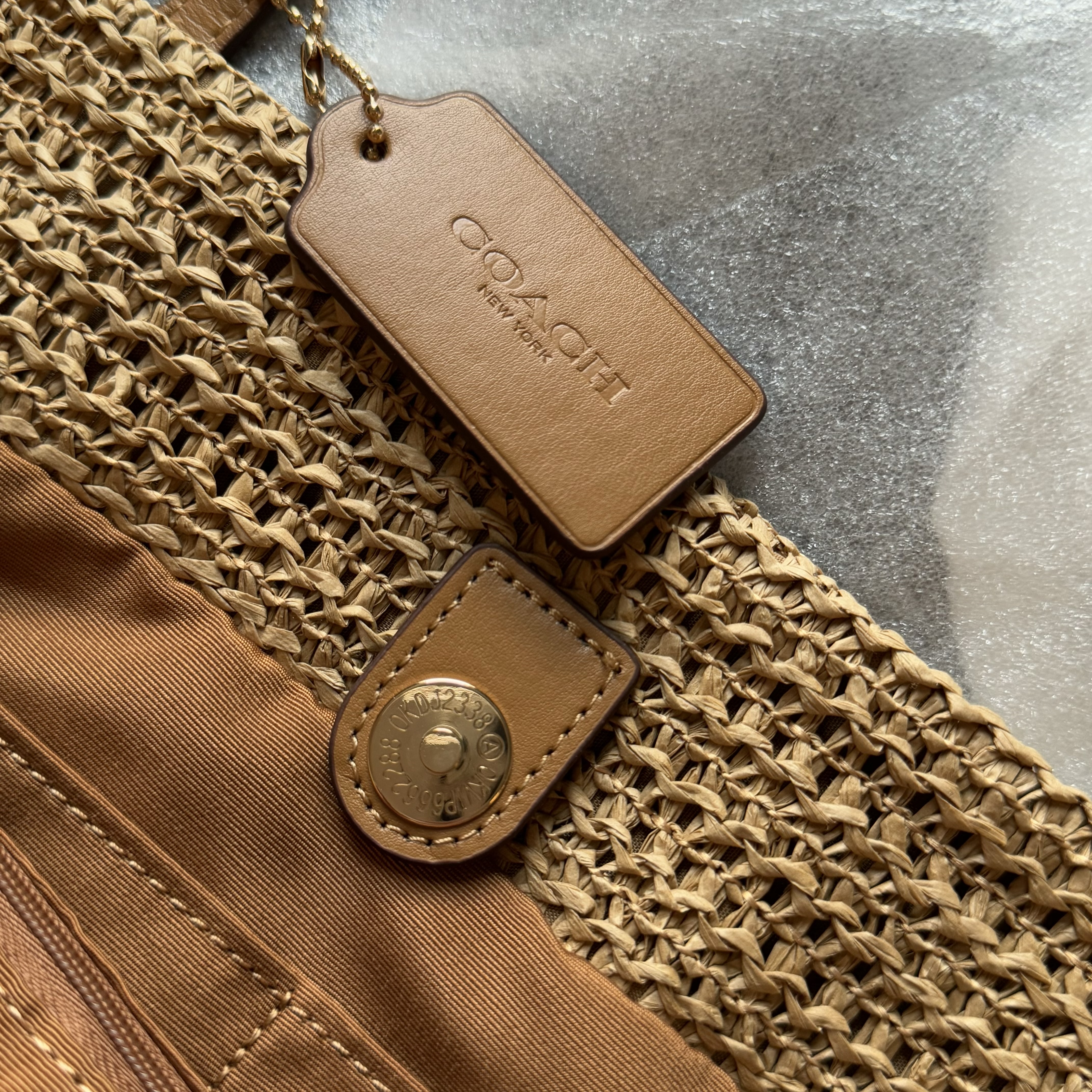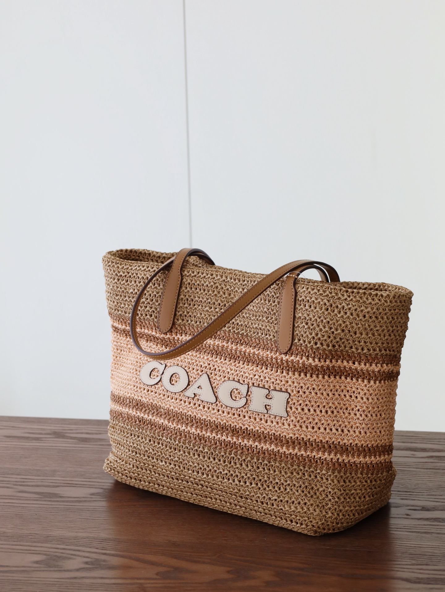Coa&ch拉菲草编托特包,纯老鼠 保真‼️ 渠环保编织,精致机织一体成型多色拼接,大容量托特包,春夏必备的新款价格也非常友好!纯正的马达加斯加拉菲亚草➕纯手工传统打造】唯有最顶级的拉菲亚草才能在编艺师的手中成为一件完美的艺术品!(纯天然拉菲草➕纯手工传统缝纫缝合,每一只都是独一无二的存在! 其筛选过程很严格(拉菲亚树叶材质中,必须挑选最上乘的80%,确保材质颜色统一质感柔韧);其手工很繁复(编织一个,拉菲亚包包需要一位纯熟手工制包师48小时的宝贵时光)它将传统手工艺和前卫摩登的时尚元素解构重组,不亚于制作一件精美的珠宝!!!所以,它呈现的是返璞归真的自然之美:肉眼感受这回归我们小时候最初本心的自然之作!看到这样的美物,如何能让人不心生欢喜?