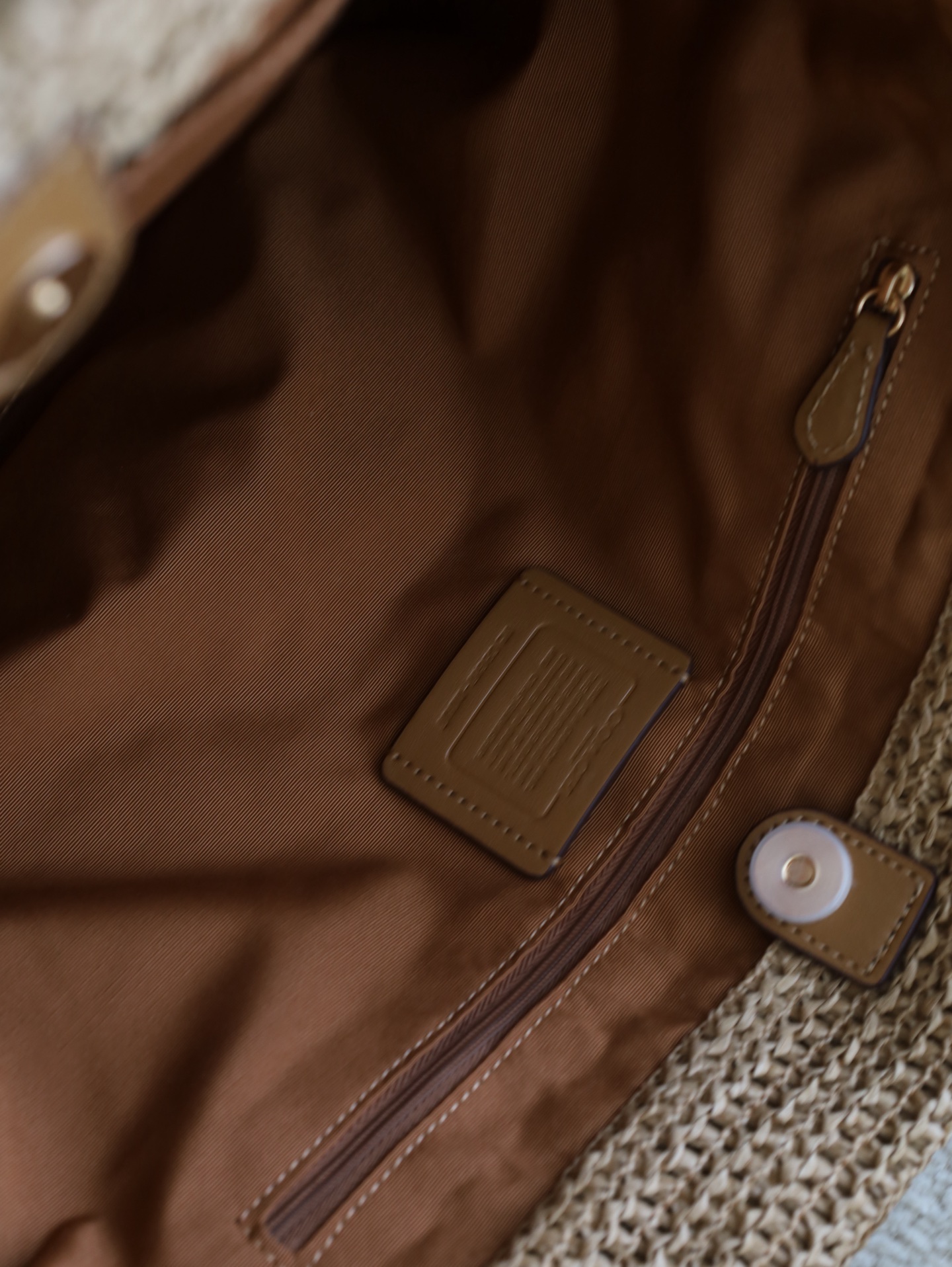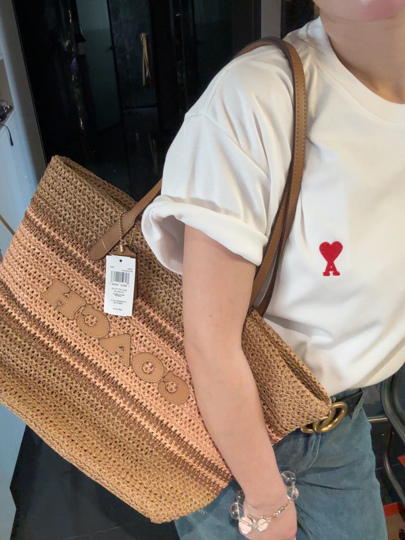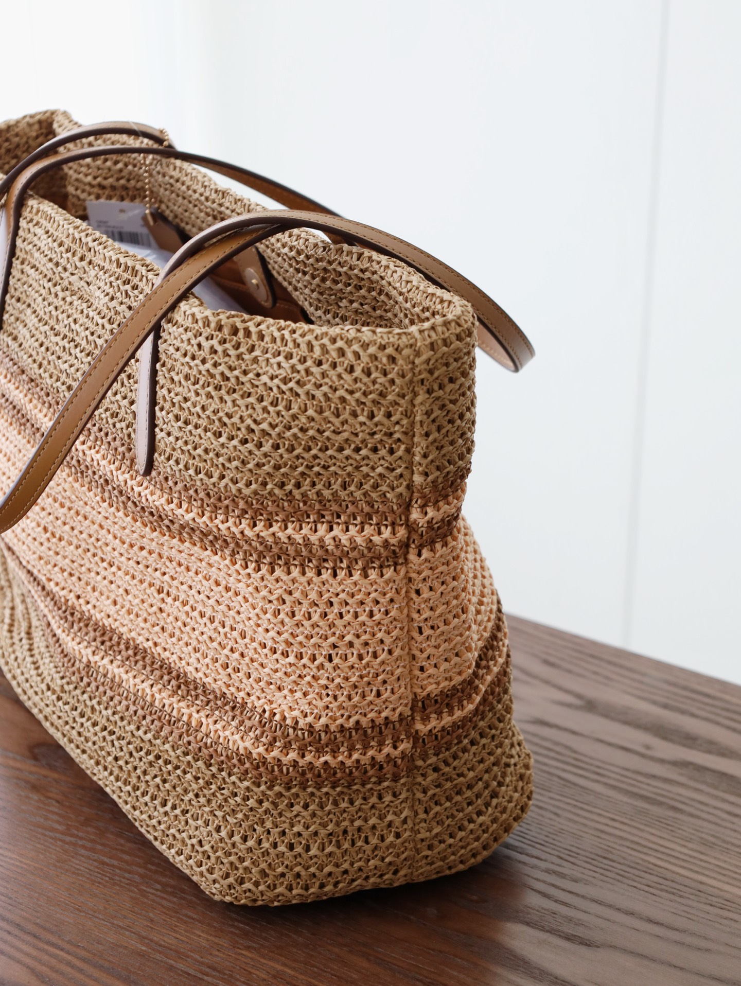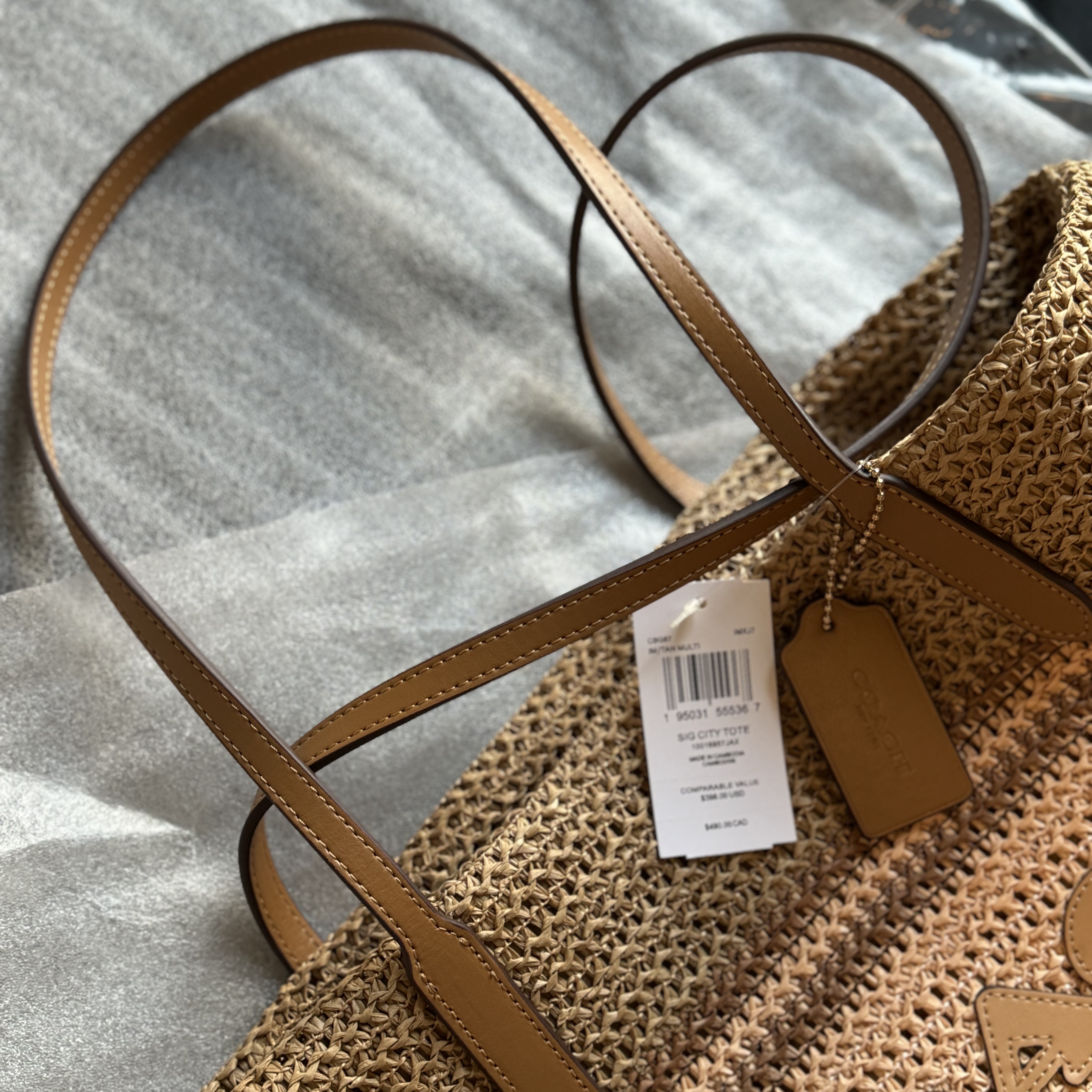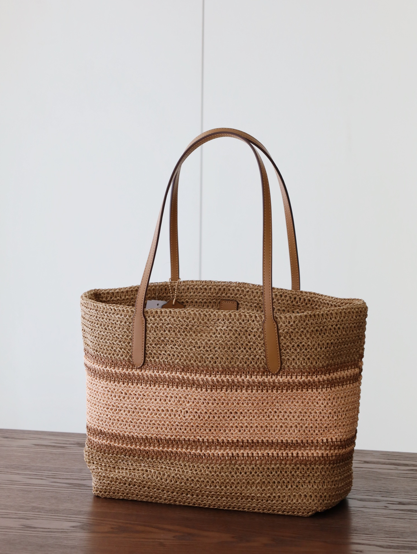 Coa&ch拉菲草编托特包,纯老鼠 保真‼️ 渠环保编织,精致机织一体成型多色拼接,大容量托特包,春夏必备的新款价格也非常友好!纯正的马达加斯加拉菲亚草➕纯手工传统打造】唯有最顶级的拉菲亚草才能在编艺师的手中成为一件完美的艺术品!(纯天然拉菲草➕纯手工传统缝纫缝合,每一只都是独一无二的存在! 其筛选过程很严格(拉菲亚树叶材质中,必须挑选最上乘的80%,确保材质颜色统一质感柔韧);其手工很繁复(编织一个,拉菲亚包包需要一位纯熟手工制包师48小时的宝贵时光)它将传统手工艺和前卫摩登的时尚元素解构重组,不亚于制作一件精美的珠宝!!!所以,它呈现的是返璞归真的自然之美:肉眼感受这回归我们小时候最初本心的自然之作!看到这样的美物,如何能让人不心生欢喜?