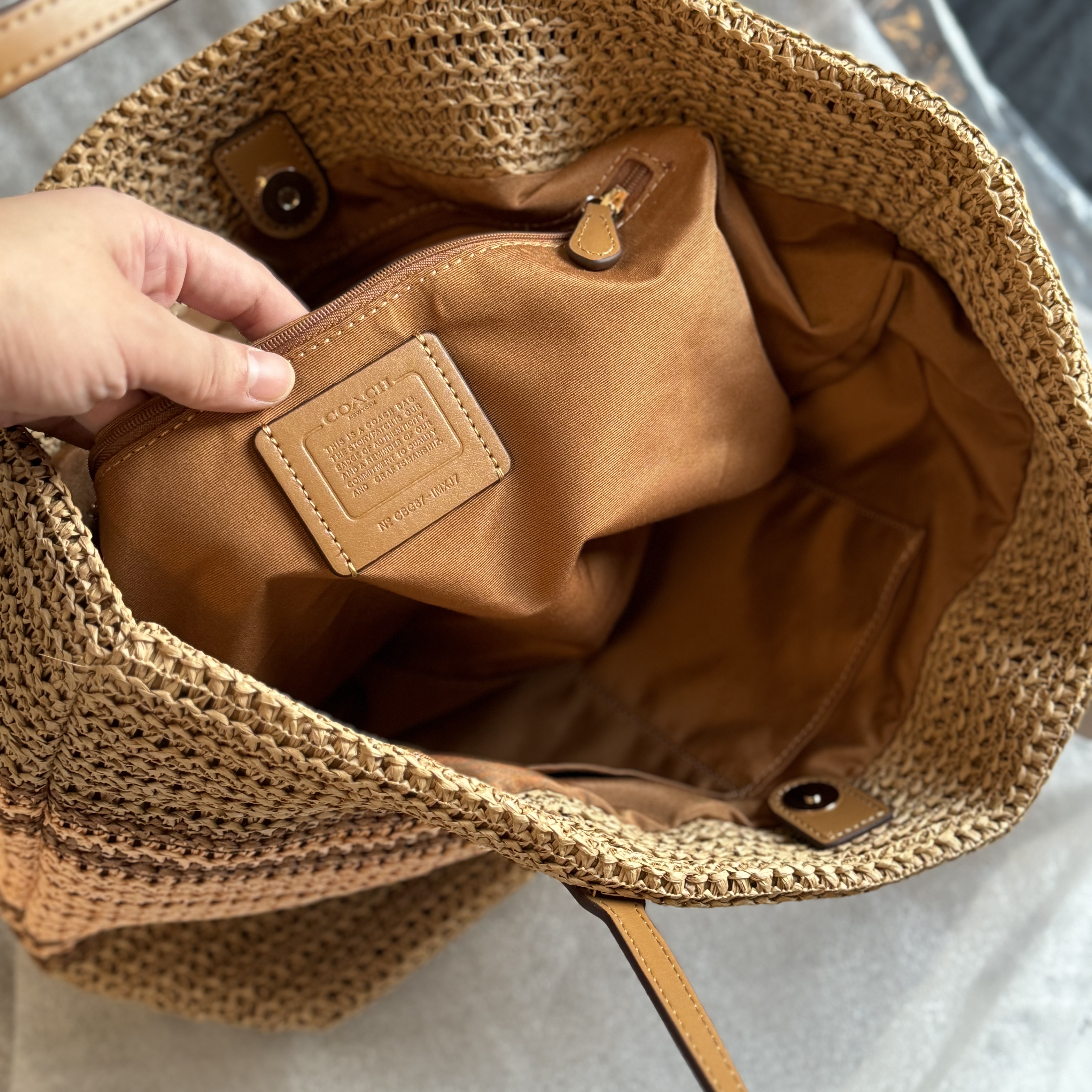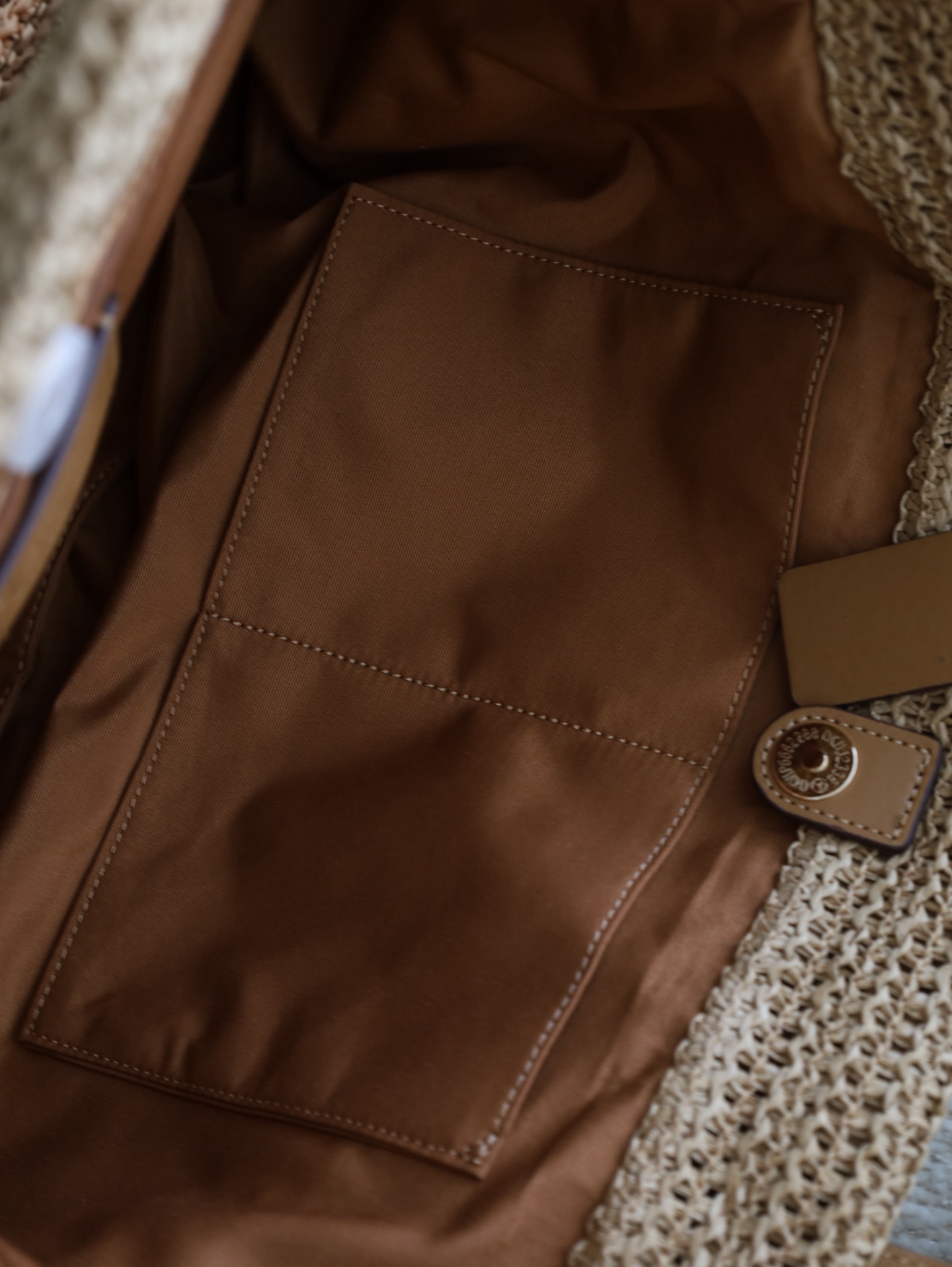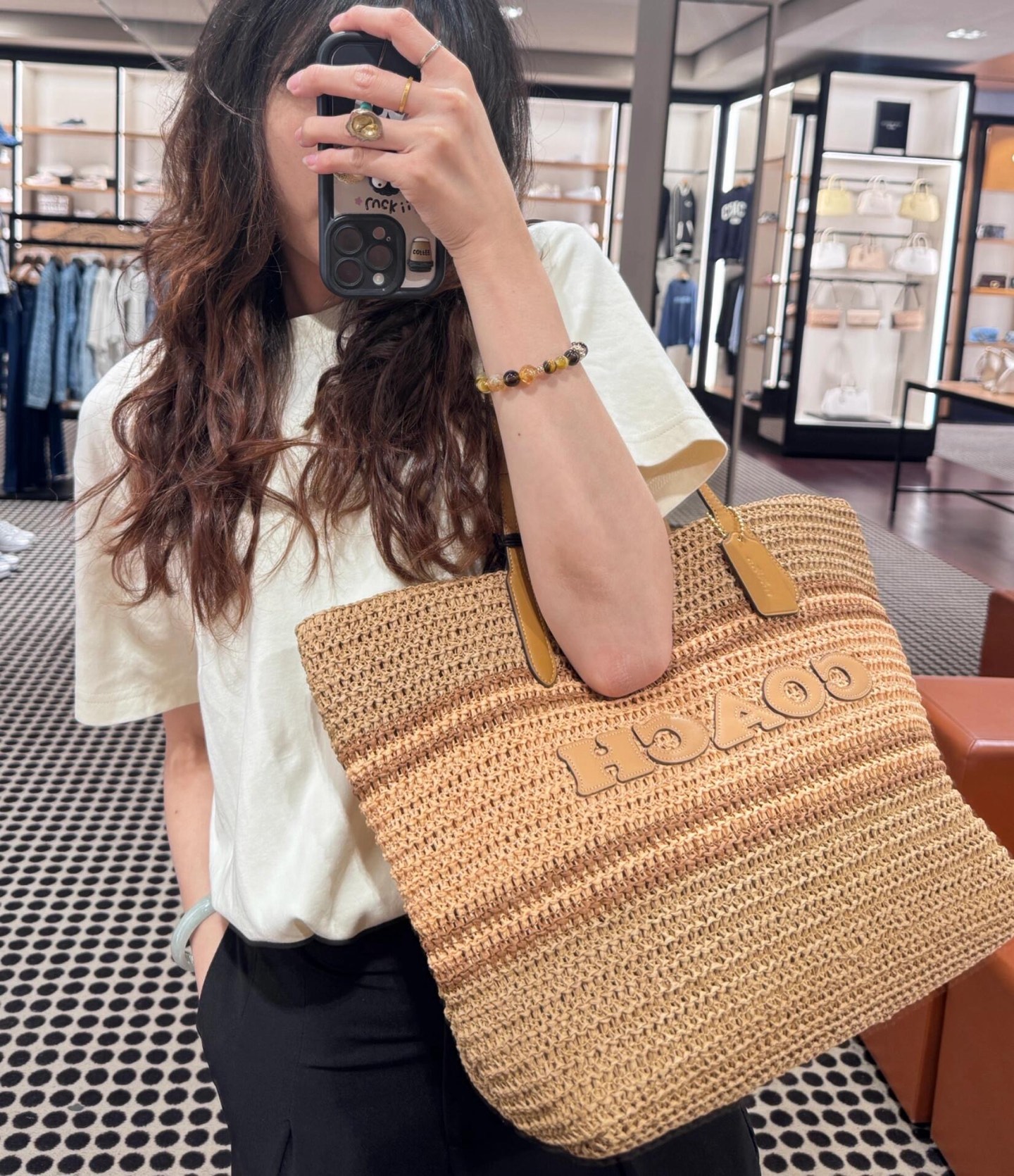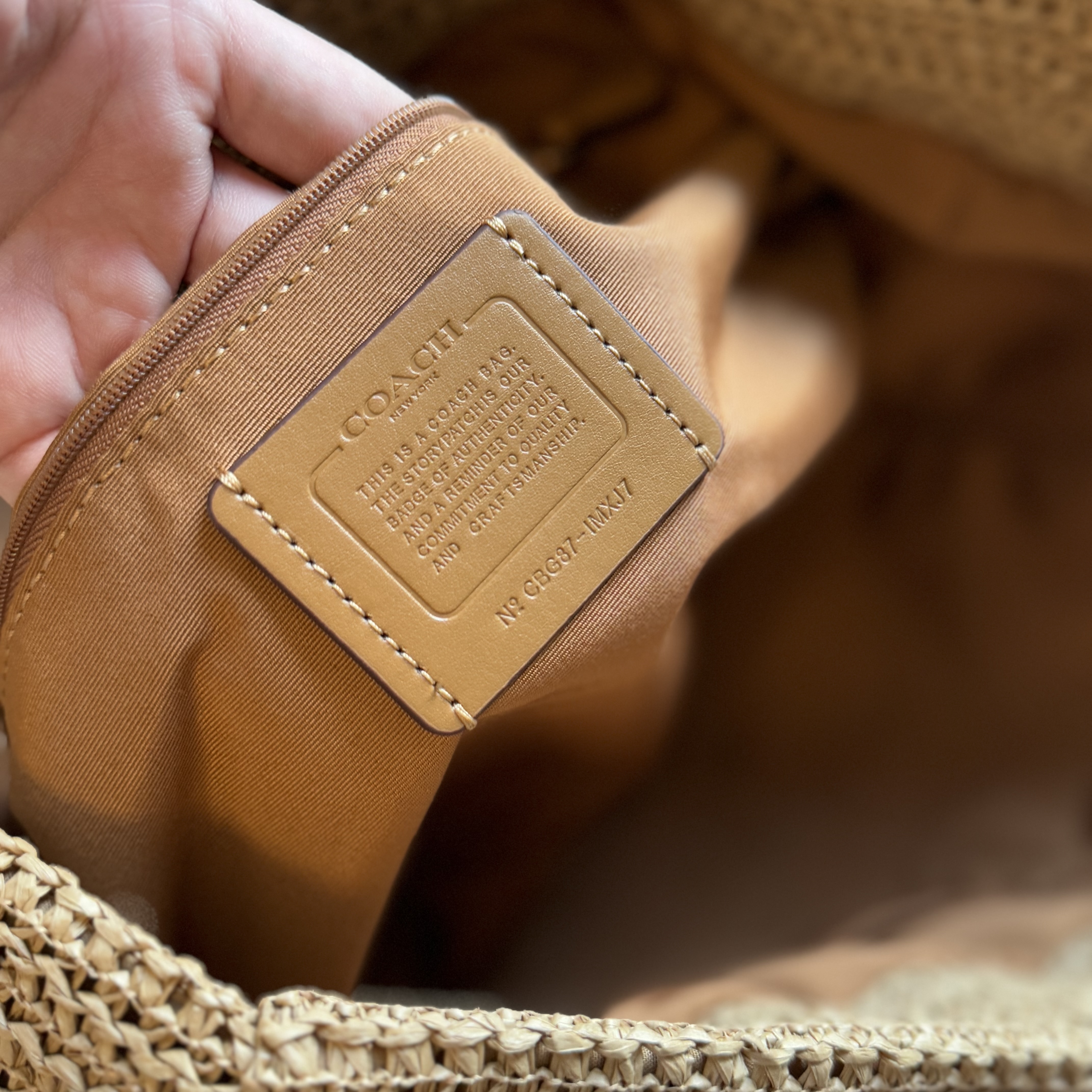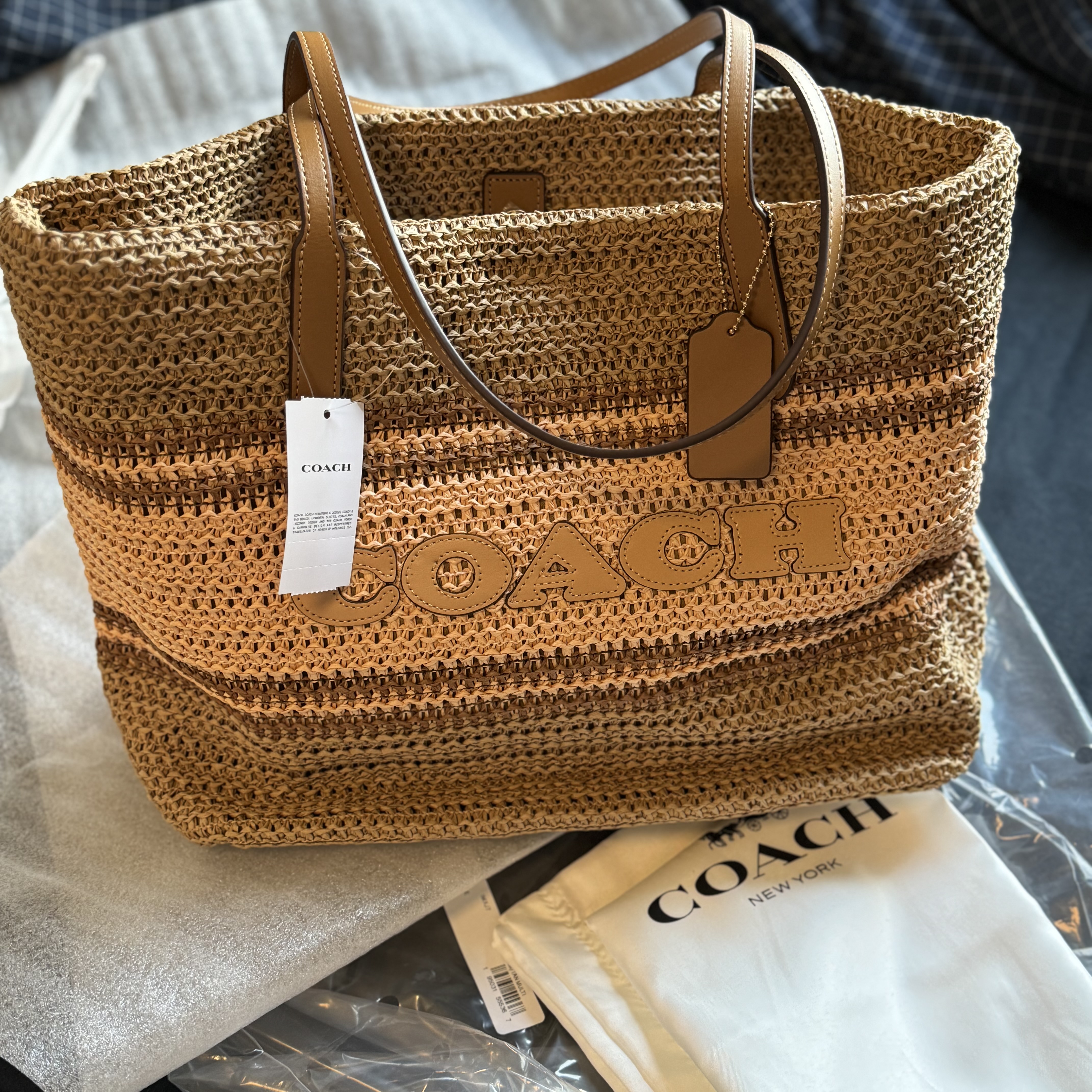 Coa&ch拉菲草编托特包,纯老鼠 保真‼️ 渠环保编织,精致机织一体成型多色拼接,大容量托特包,春夏必备的新款价格也非常友好!纯正的马达加斯加拉菲亚草➕纯手工传统打造】唯有最顶级的拉菲亚草才能在编艺师的手中成为一件完美的艺术品!(纯天然拉菲草➕纯手工传统缝纫缝合,每一只都是独一无二的存在! 其筛选过程很严格(拉菲亚树叶材质中,必须挑选最上乘的80%,确保材质颜色统一质感柔韧);其手工很繁复(编织一个,拉菲亚包包需要一位纯熟手工制包师48小时的宝贵时光)它将传统手工艺和前卫摩登的时尚元素解构重组,不亚于制作一件精美的珠宝!!!所以,它呈现的是返璞归真的自然之美:肉眼感受这回归我们小时候最初本心的自然之作!看到这样的美物,如何能让人不心生欢喜?
