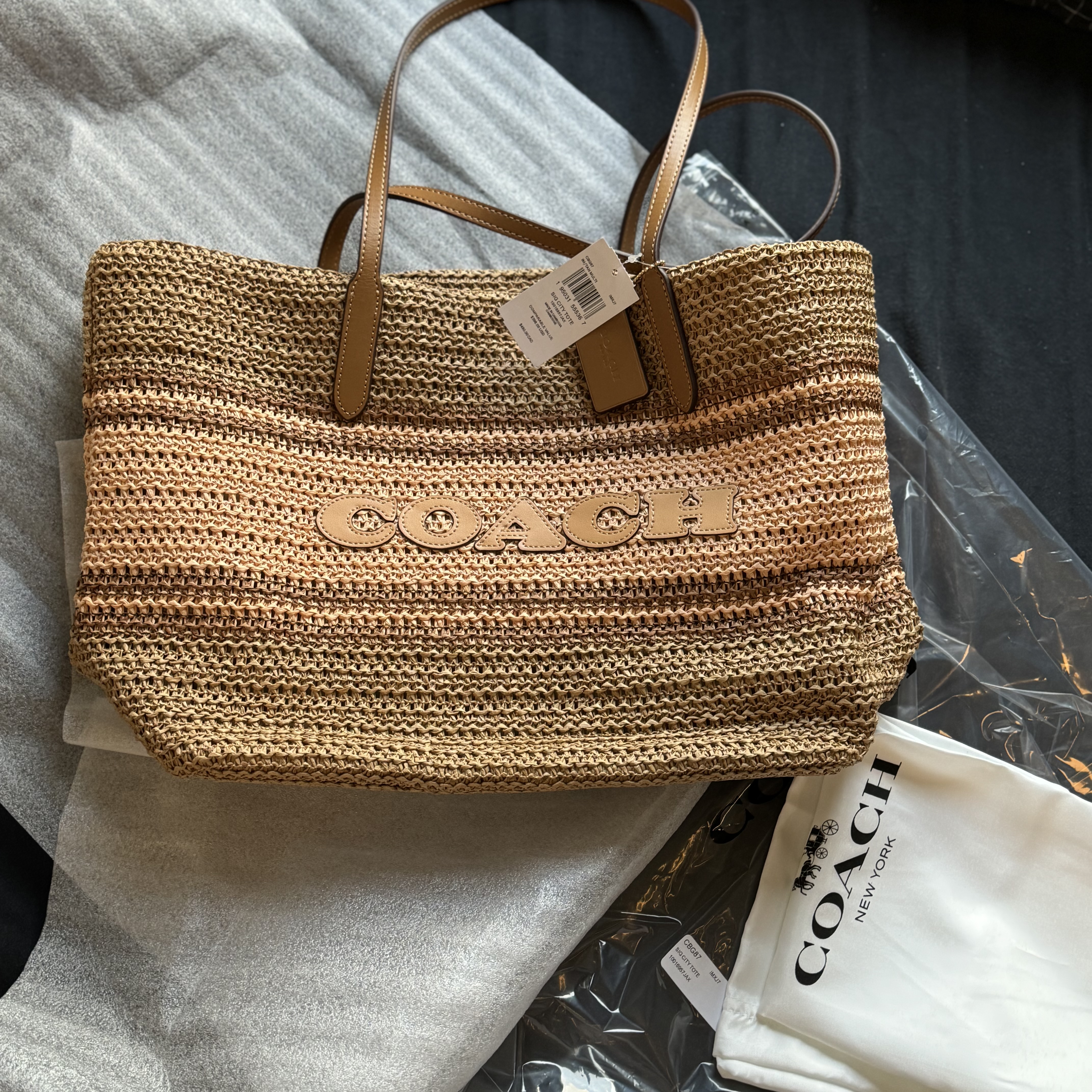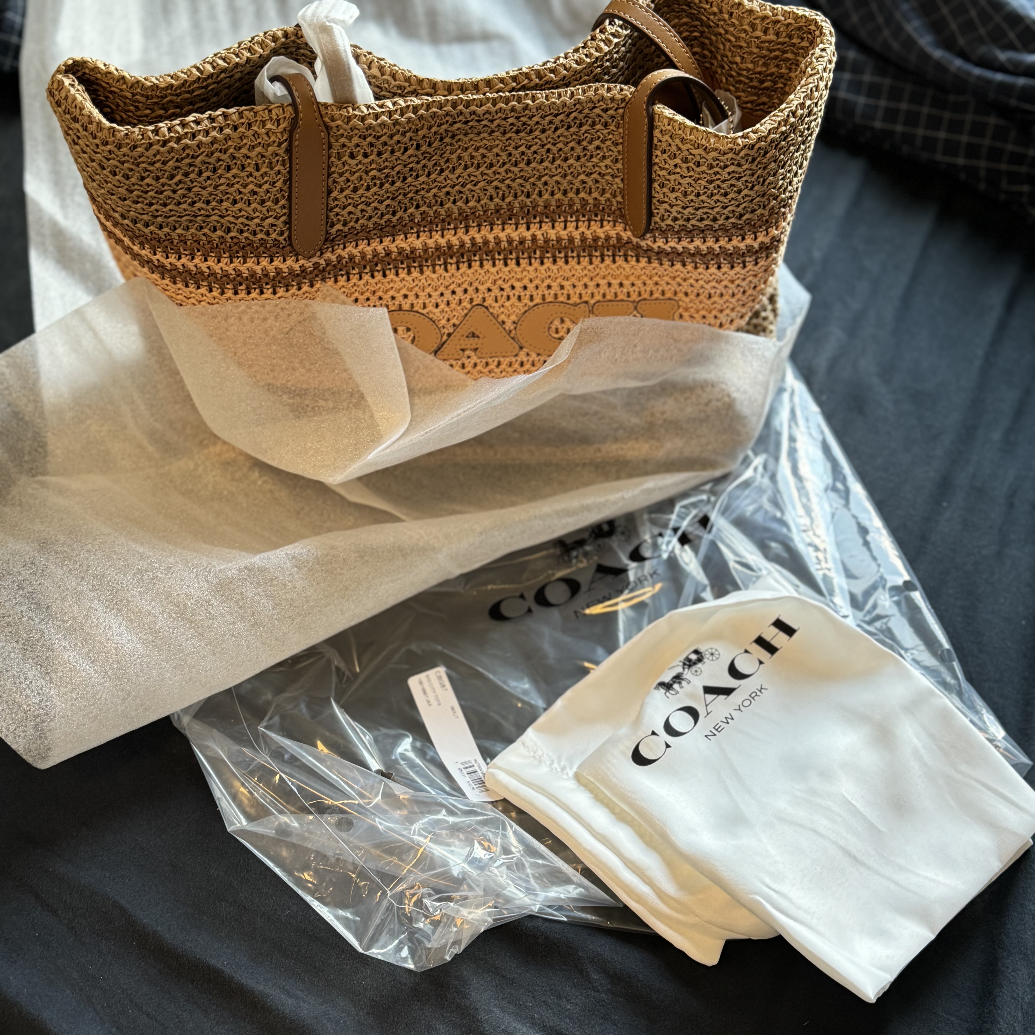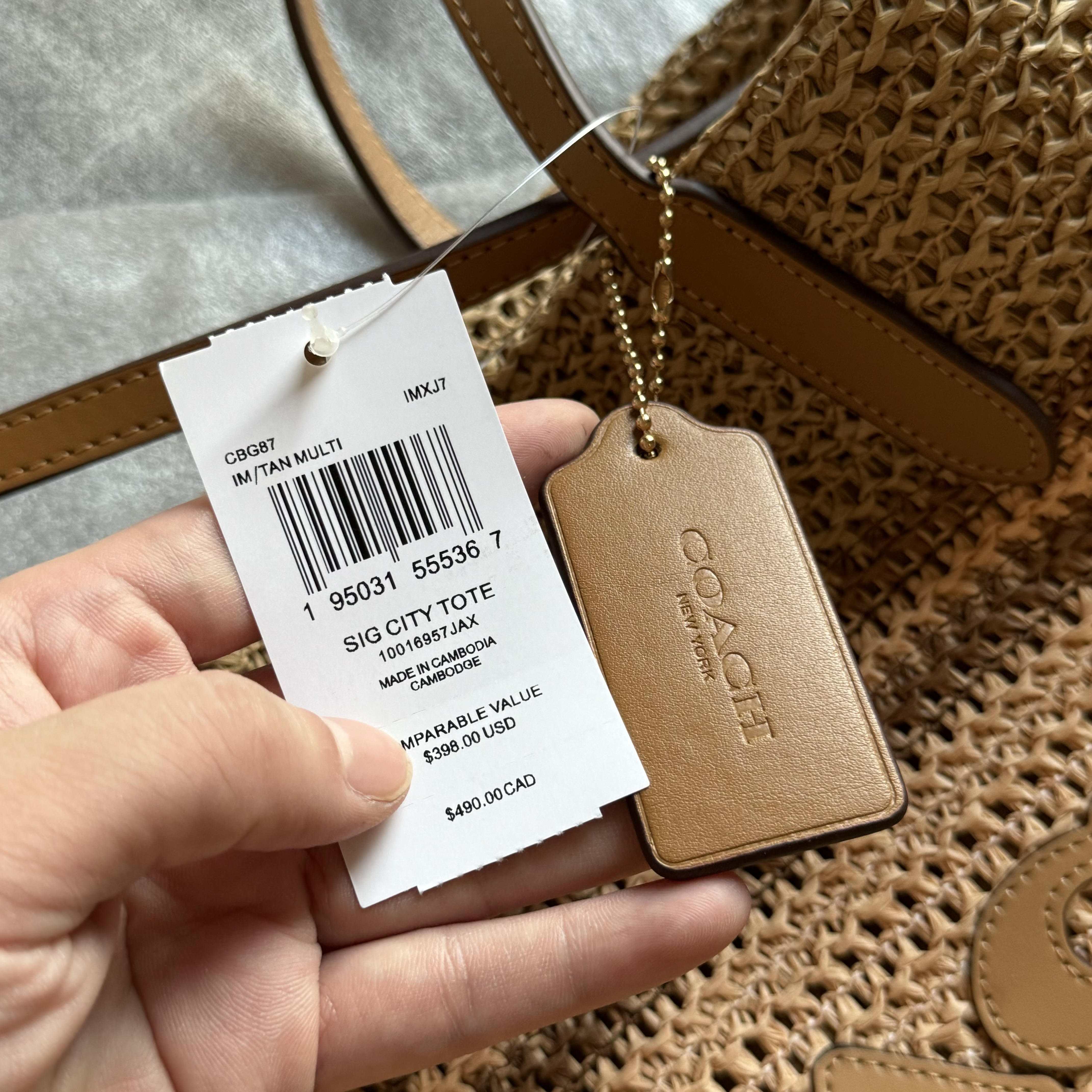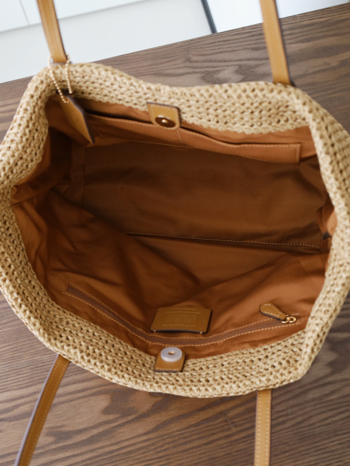 Coa&ch拉菲草编托特包,纯老鼠 保真‼️ 渠环保编织,精致机织一体成型多色拼接,大容量托特包,春夏必备的新款价格也非常友好!纯正的马达加斯加拉菲亚草➕纯手工传统打造】唯有最顶级的拉菲亚草才能在编艺师的手中成为一件完美的艺术品!(纯天然拉菲草➕纯手工传统缝纫缝合,每一只都是独一无二的存在! 其筛选过程很严格(拉菲亚树叶材质中,必须挑选最上乘的80%,确保材质颜色统一质感柔韧);其手工很繁复(编织一个,拉菲亚包包需要一位纯熟手工制包师48小时的宝贵时光)它将传统手工艺和前卫摩登的时尚元素解构重组,不亚于制作一件精美的珠宝!!!所以,它呈现的是返璞归真的自然之美:肉眼感受这回归我们小时候最初本心的自然之作!看到这样的美物,如何能让人不心生欢喜?