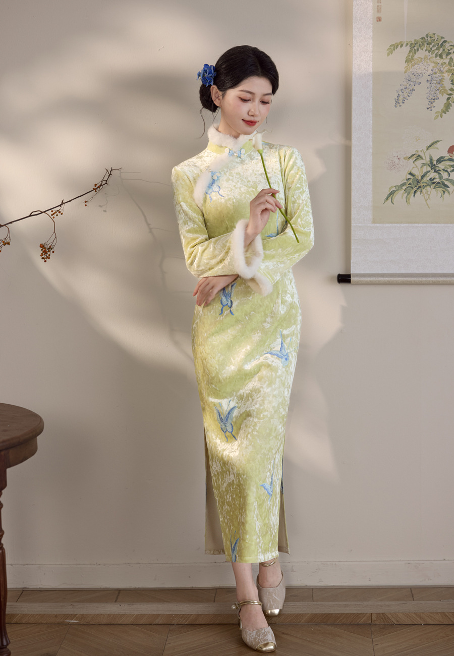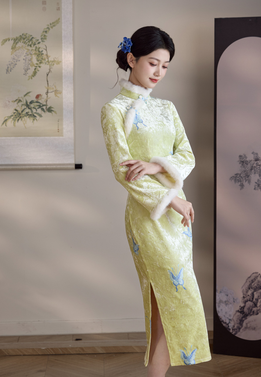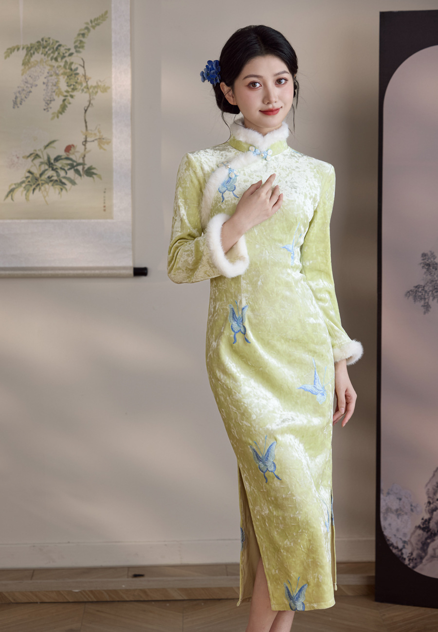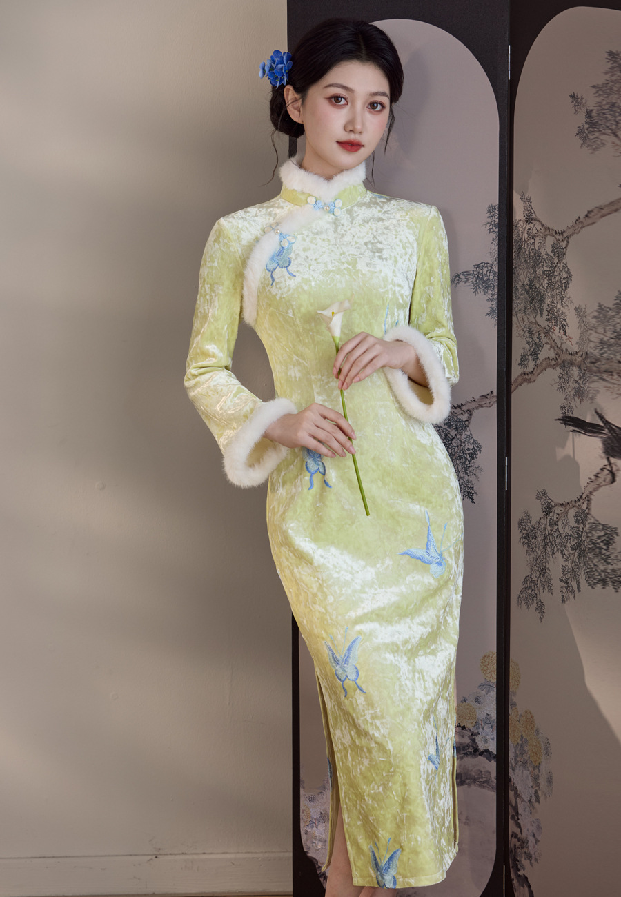 MYJ 刺绣加绒加厚国风新中式长袖改良旗袍复古