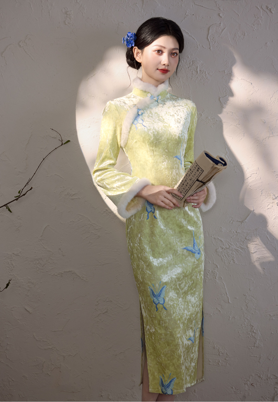 MYJ 刺绣加绒加厚国风新中式长袖改良旗袍复古 商品图0