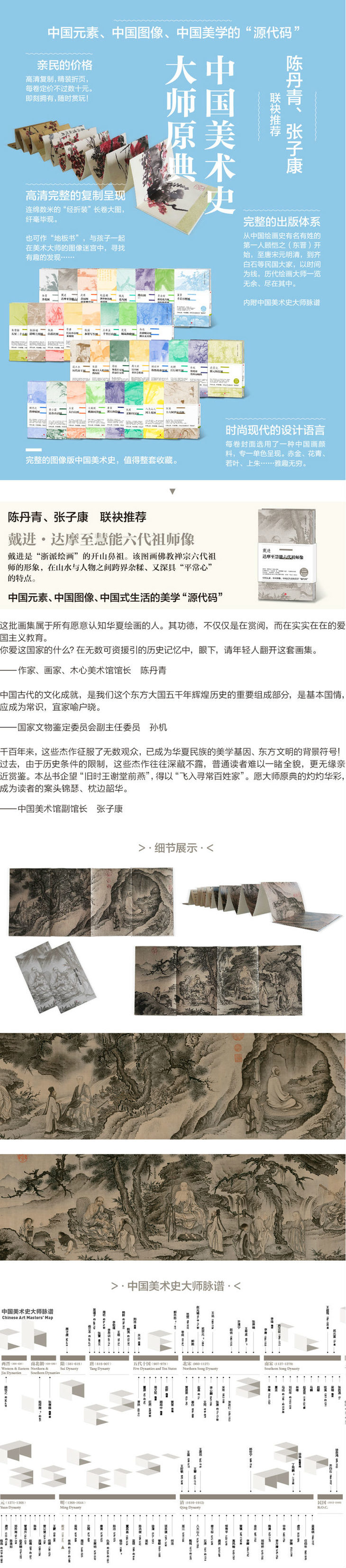 《中国美术史·大师原典:戴进·达摩至慧能六代祖师像》图中设色画佛教禅宗六代祖师的形象,有初祖达摩、二祖神光、三祖僧璨、四祖道信、五祖弘忍、六祖惠能。六组人物之间以岩石、泉水、苍松、古柏相连,并装点佛教圣地。戴进的人物画有工笔和粗笔两种面貌。此画师法刘松年、李唐,工细严谨,人物神态生动,线条劲练,转折顿挫中有流畅洒脱之致,并师承南宋院体的典型风格,笔墨技法具有深厚功力,为其工笔人物画的代表作。