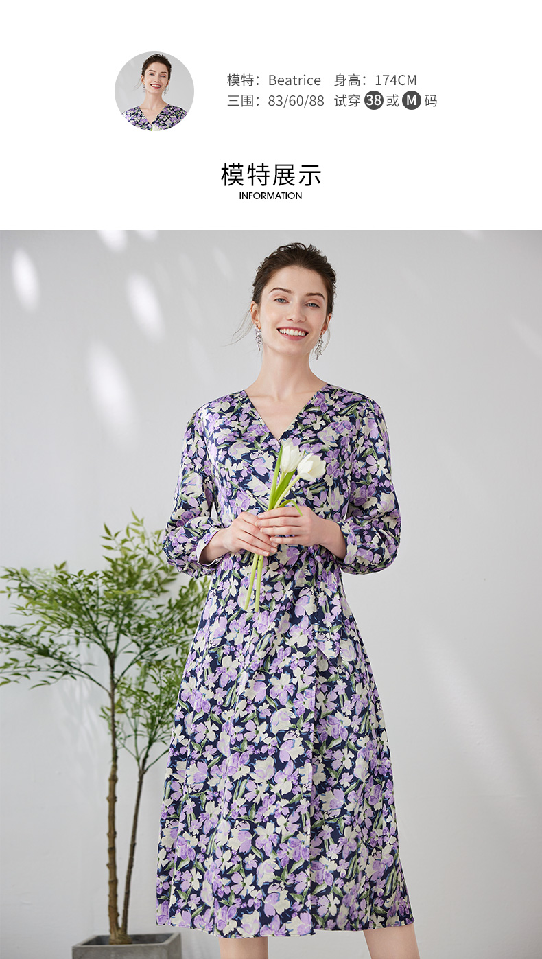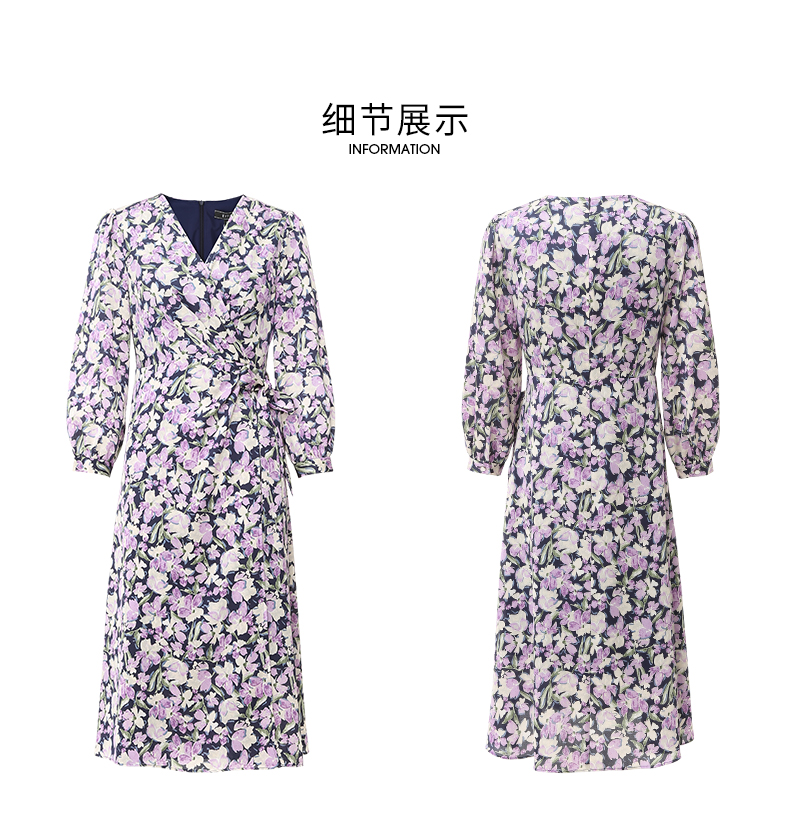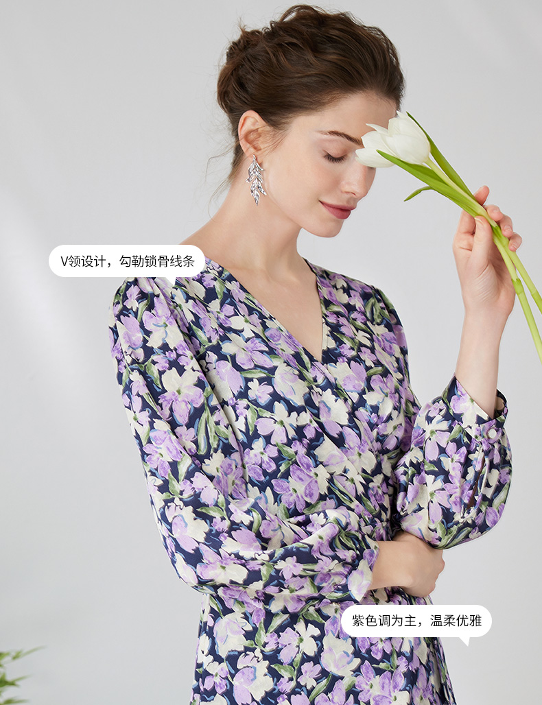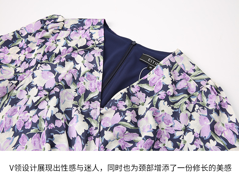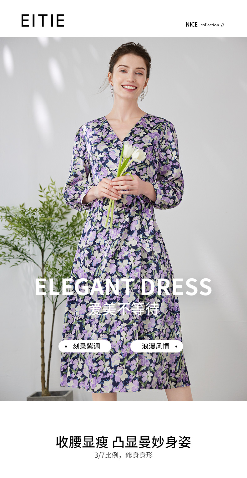 EITIE爱特爱法式优雅气质V领收腰紫色印花a字连衣裙春季新款A2407313