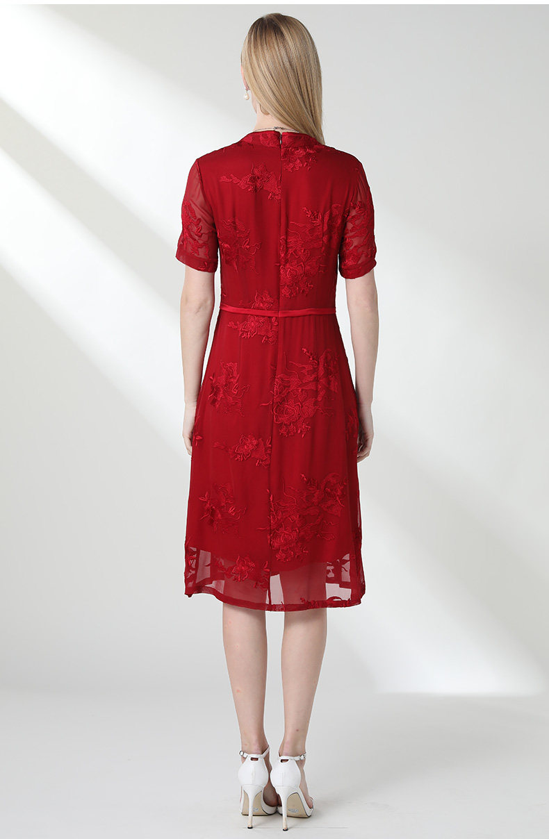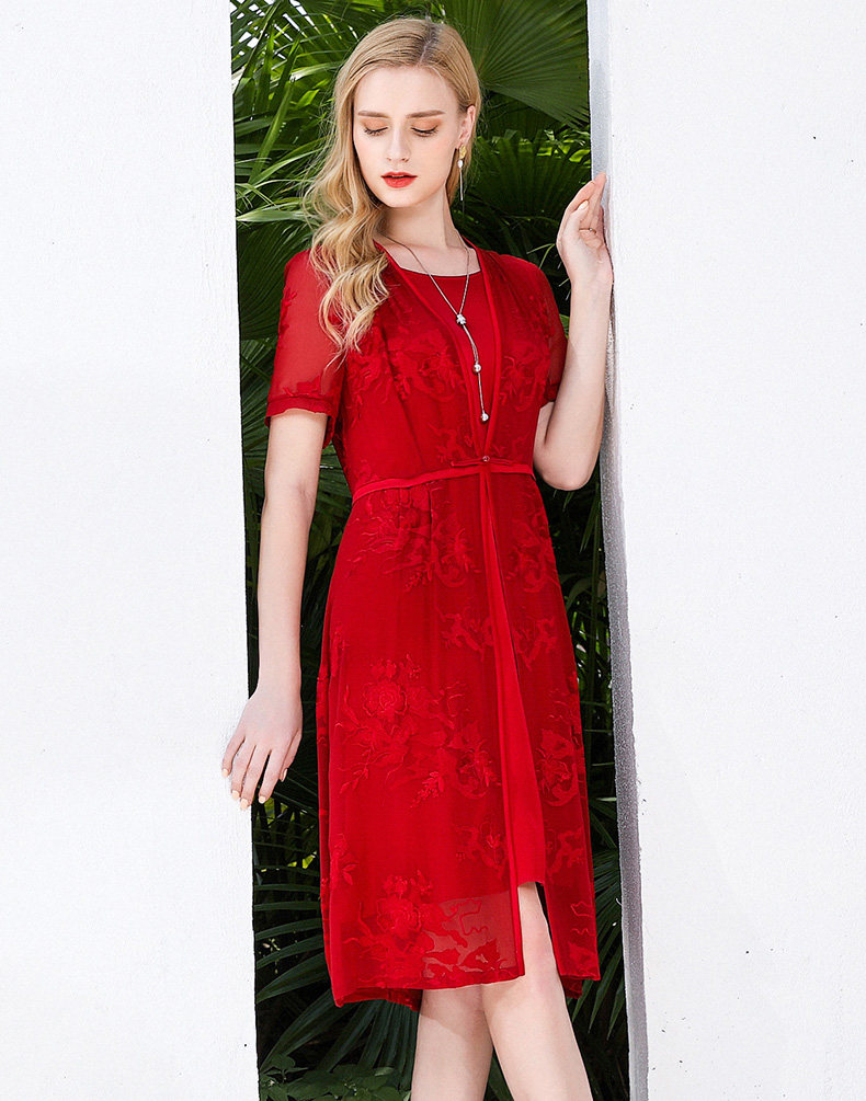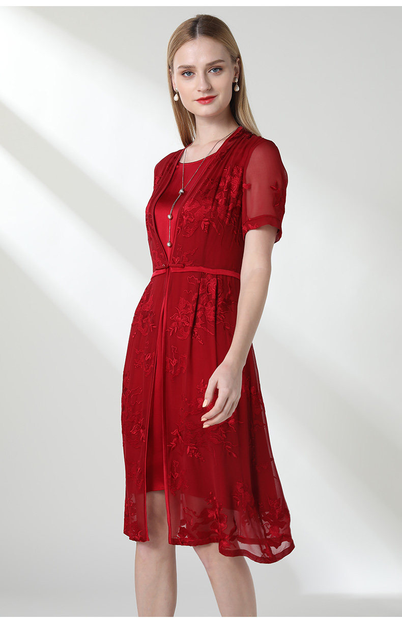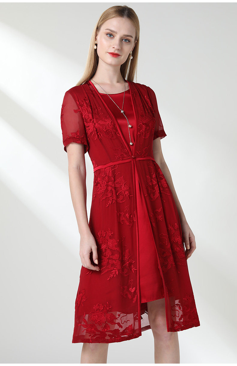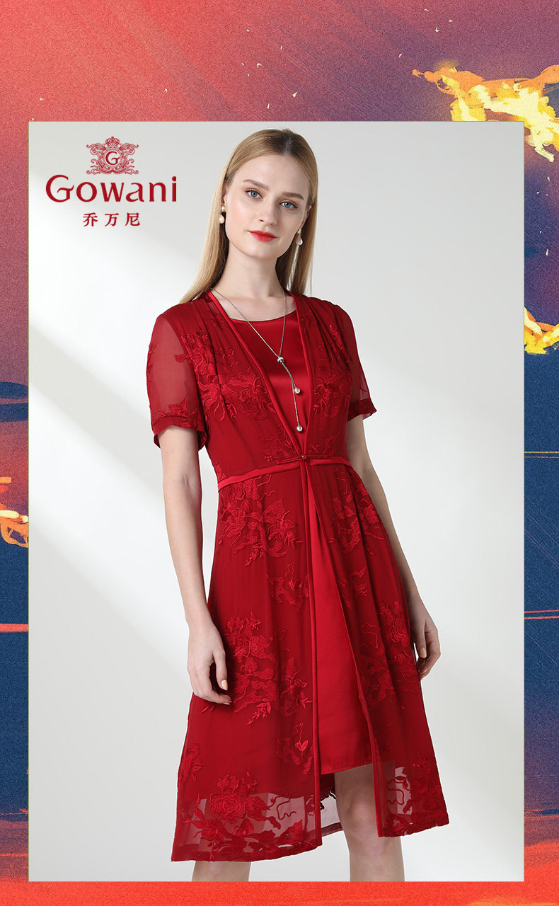 乔万尼夏红装喜宴假两件刺绣修身收腰真丝桑蚕丝连衣裙女EN2E551