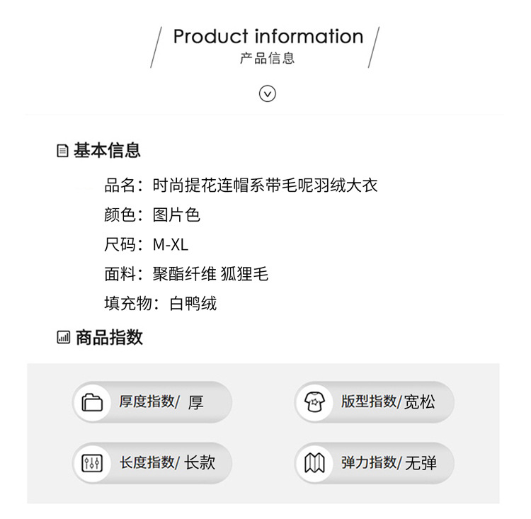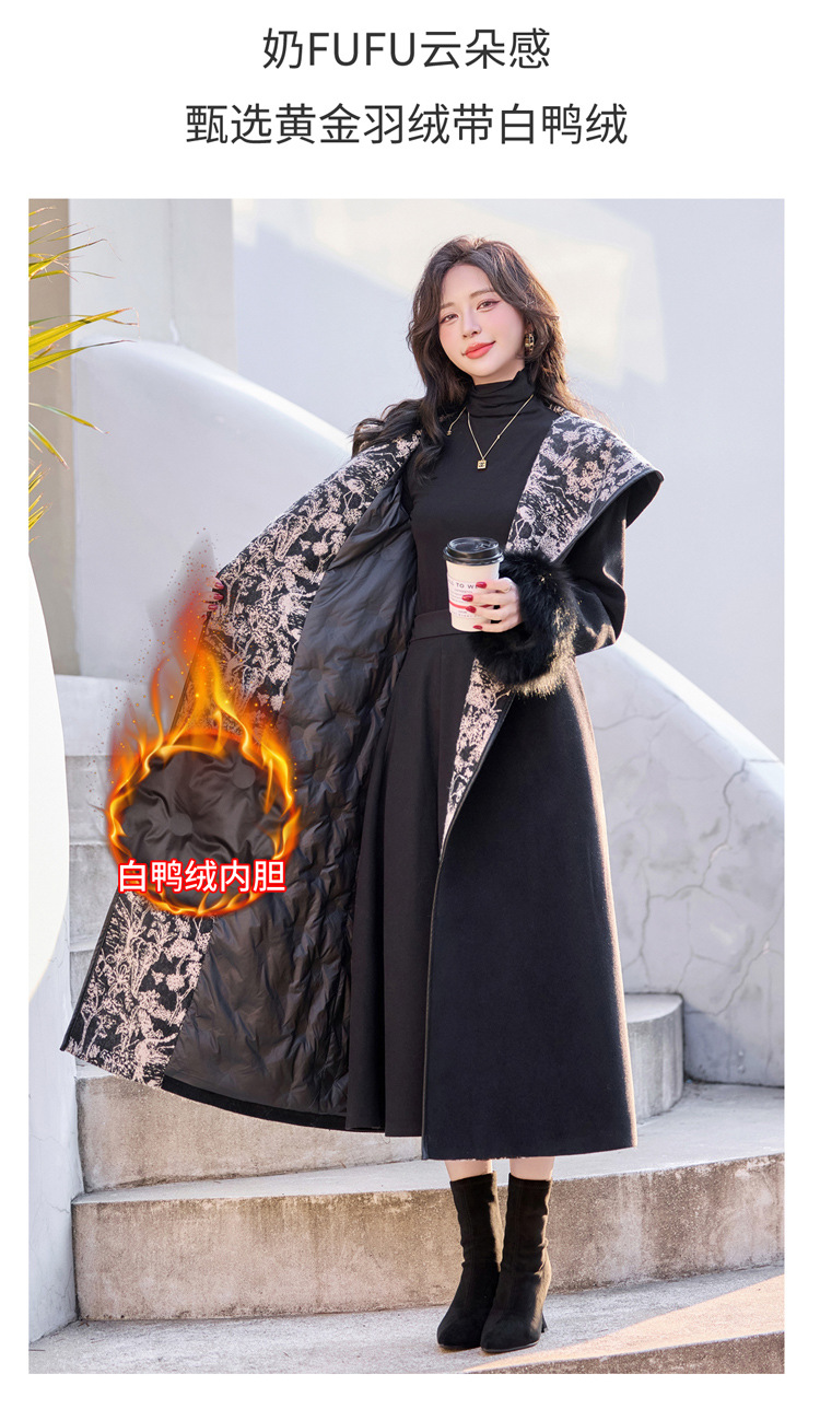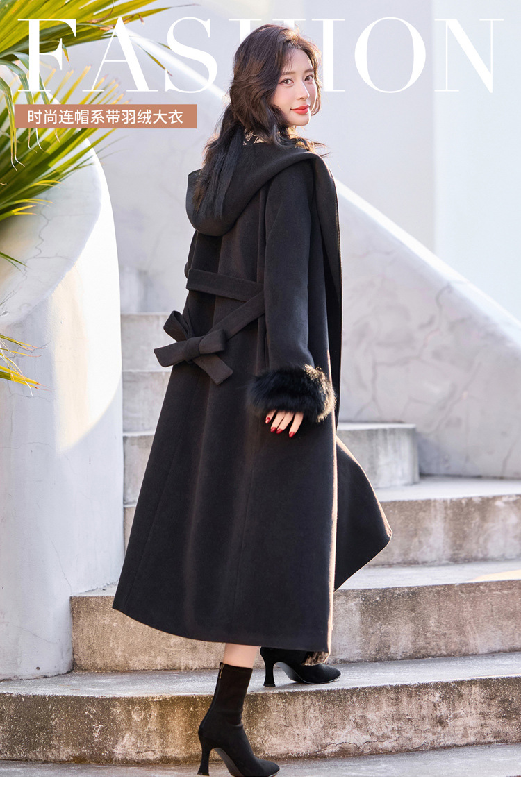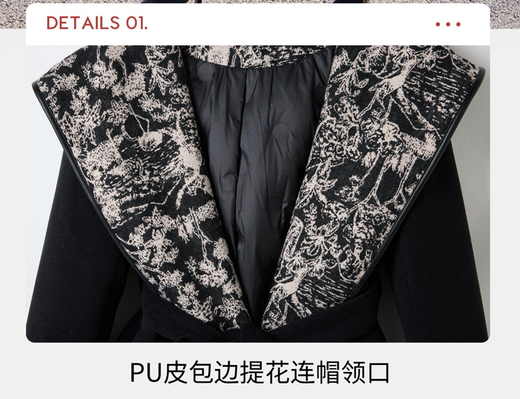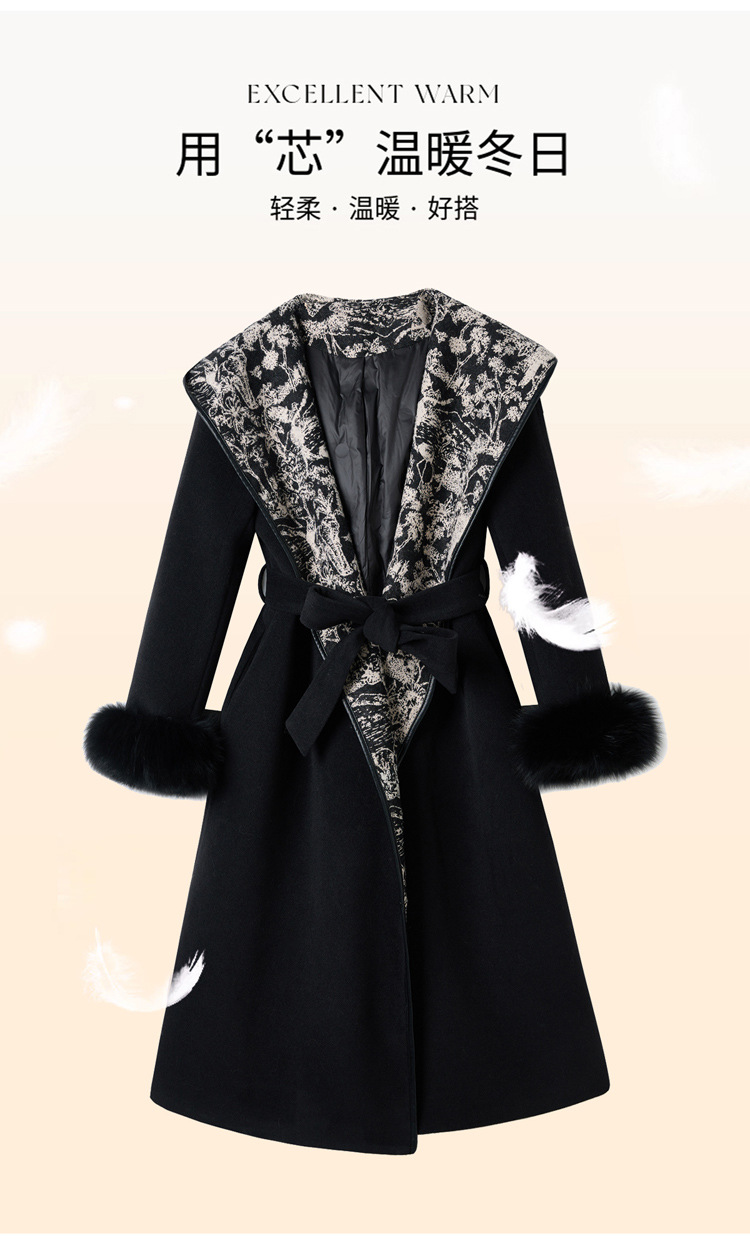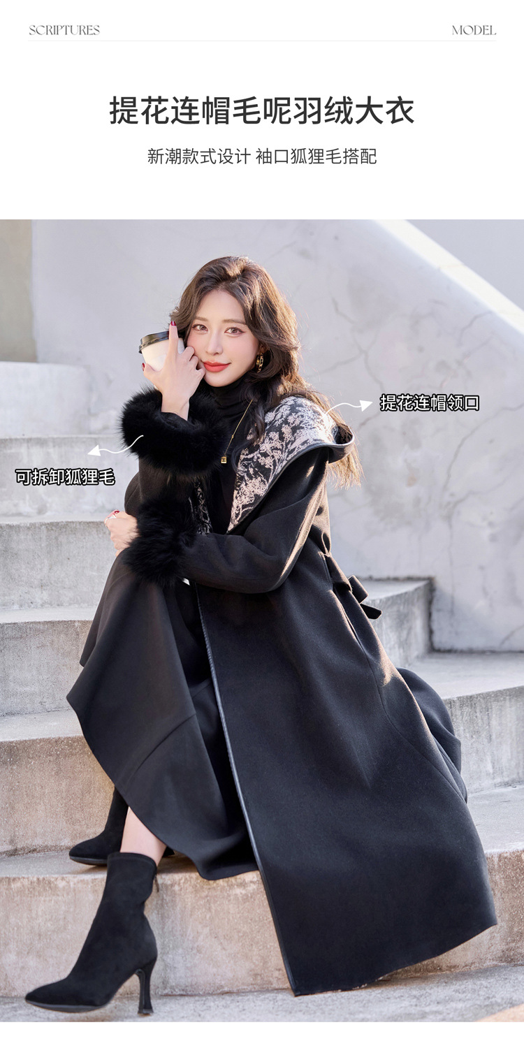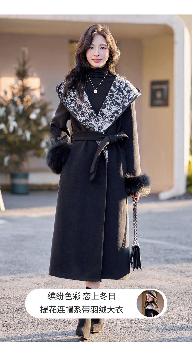 提花连帽毛呢羽绒大衣,中长款收腰系带轻奢外套YJLY8506A