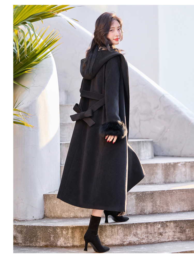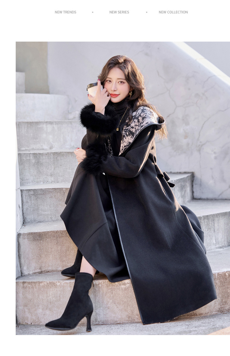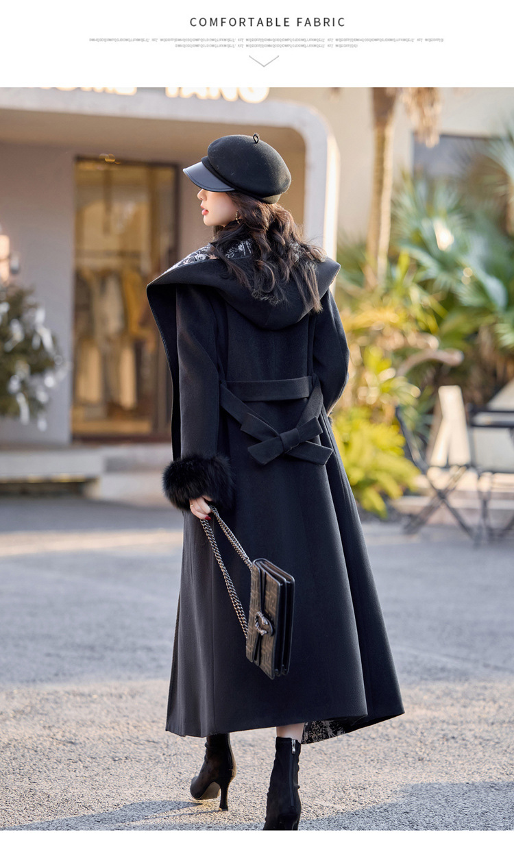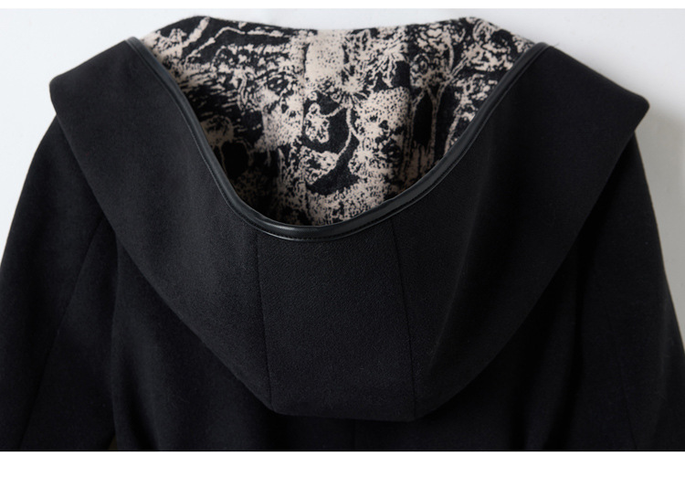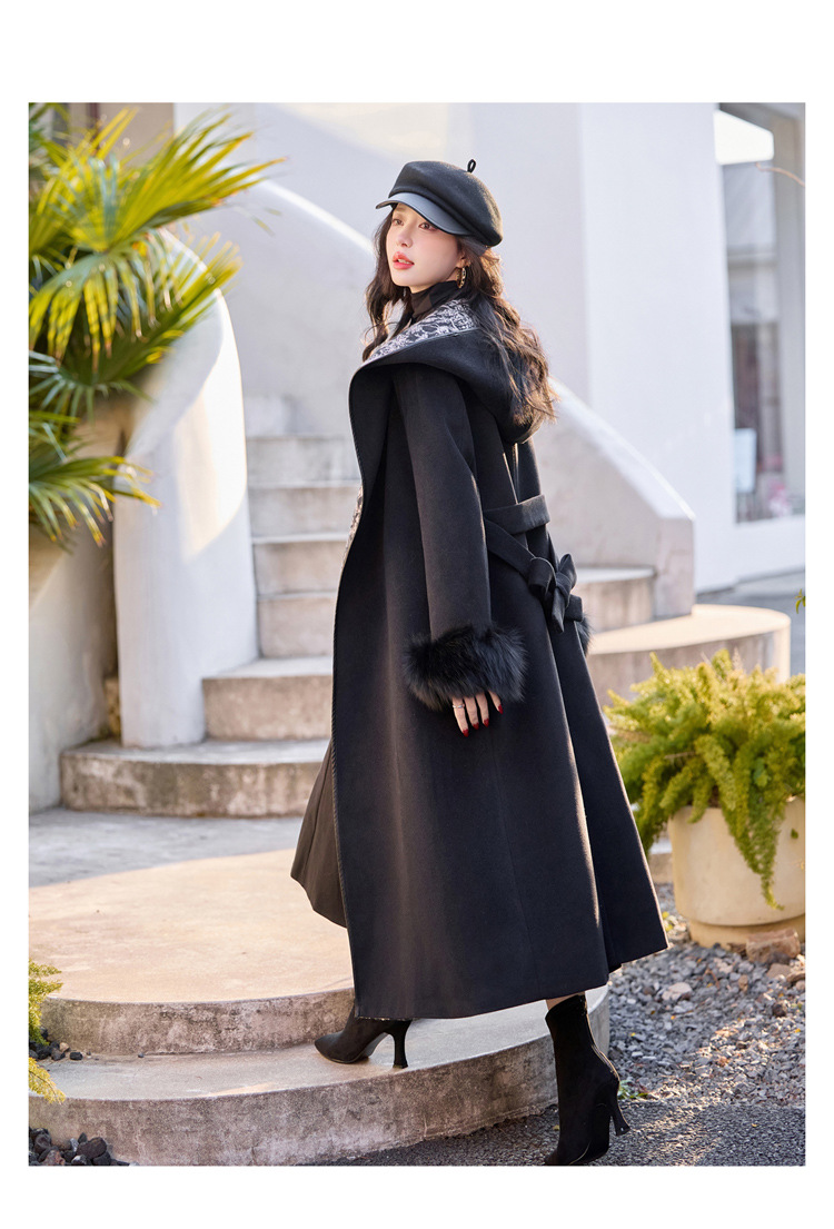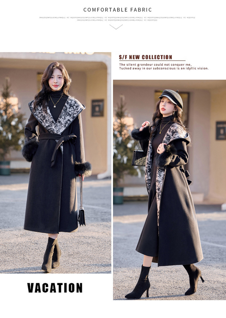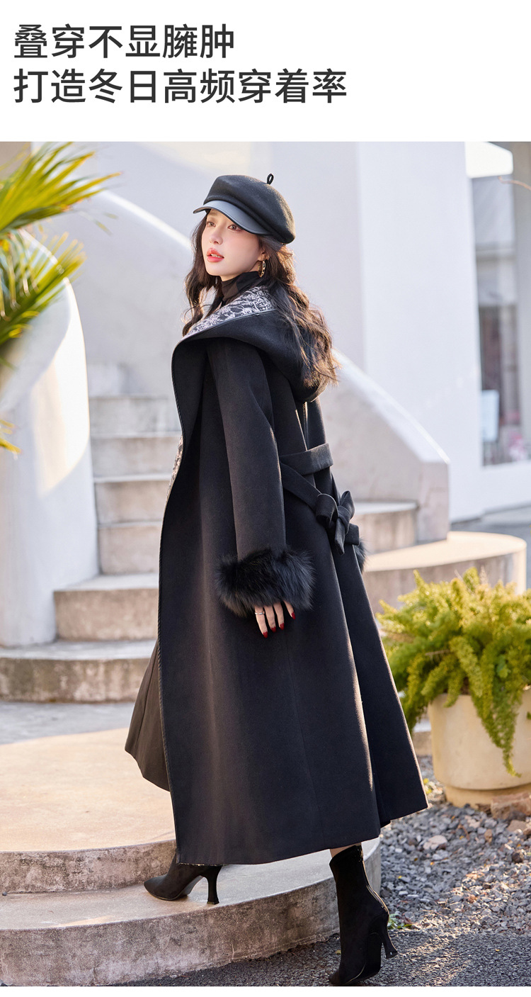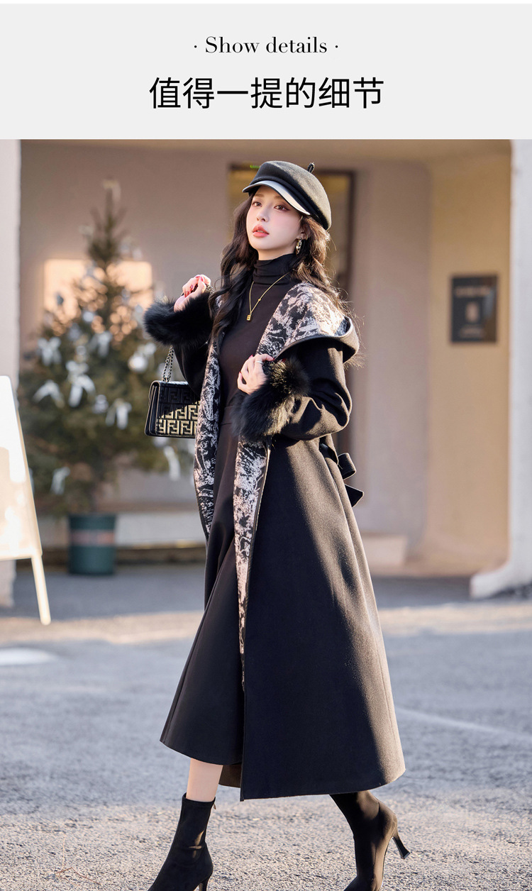 提花连帽毛呢羽绒大衣,中长款收腰系带轻奢外套YJLY8506A