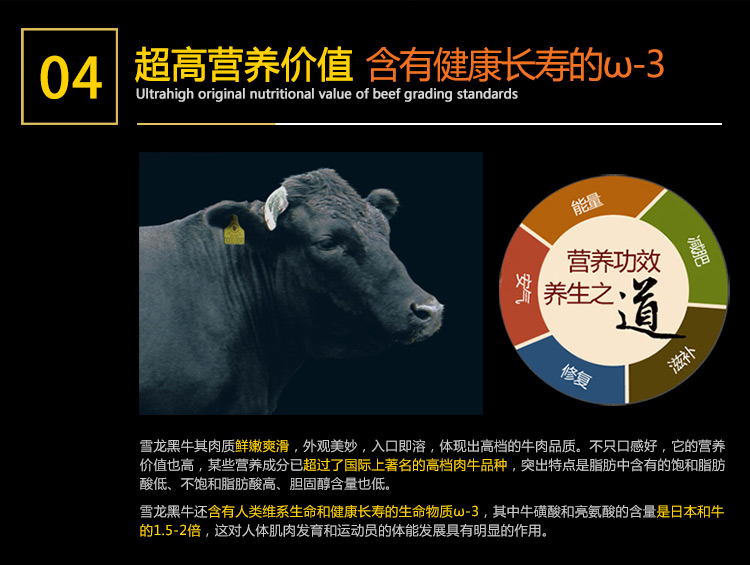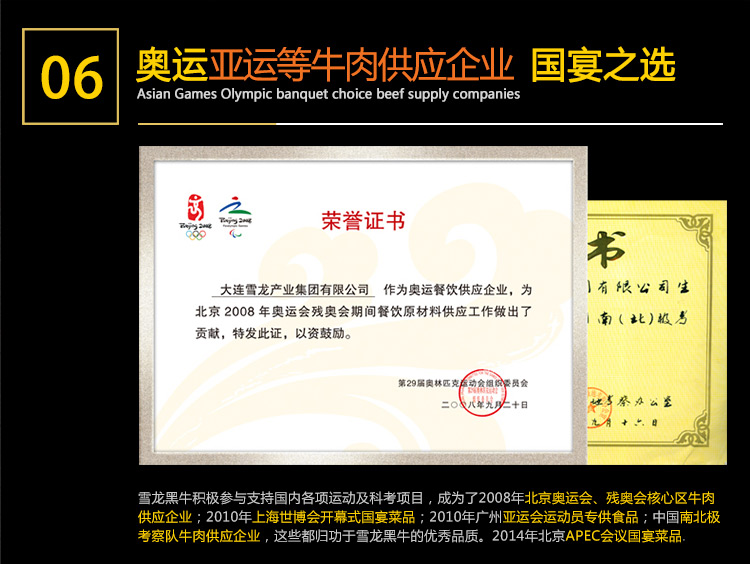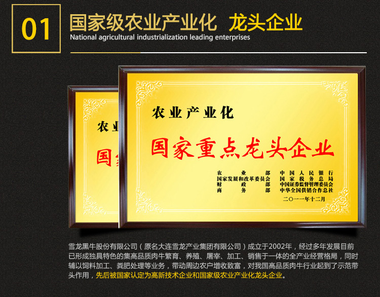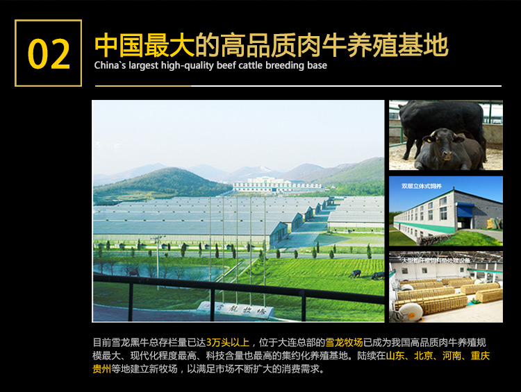 欢迎光临雪龙黑牛国宴、奥运会、国亚会、世博官方指定供货商,国宴全球首脑吃过的肉,奥运运动健儿吃过的肉 ,不仅口感好,营养价值也高,饱和脂肪酸低、不饱和脂肪酸高、胆固醇含量低。老人吃,入口化,好消化;青年吃,心欢喜,增力气;儿童吃,味道好,忘不掉。是营养型、保健型的高品质牛肉。回头客、好评率高达99.9%,还望老客户能帮忙分享美食,您们的力量是无穷大,让中国最高端牛肉走入千家万户!