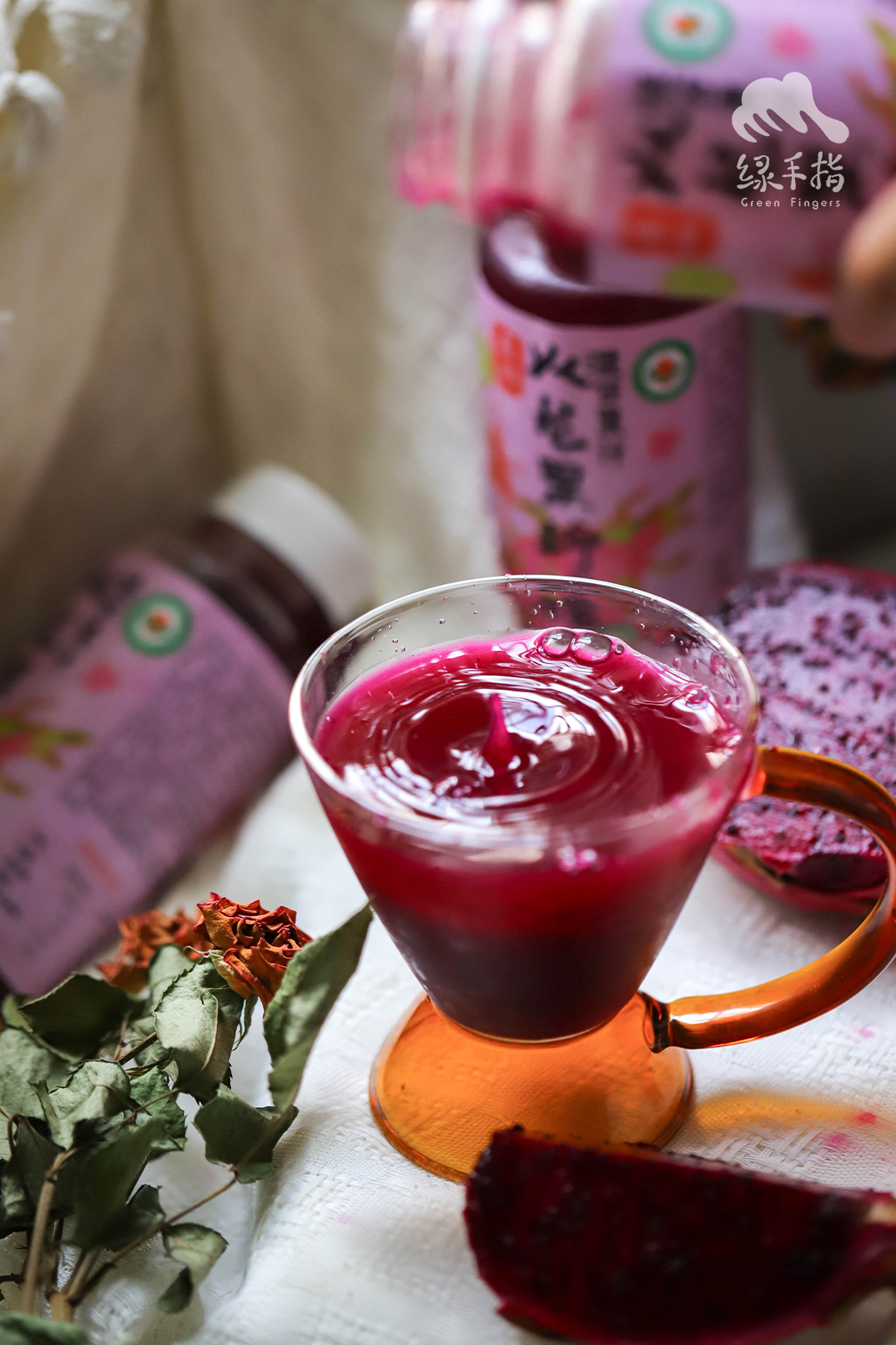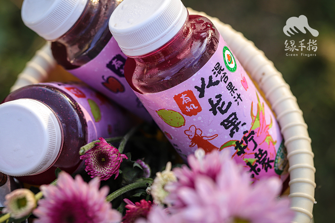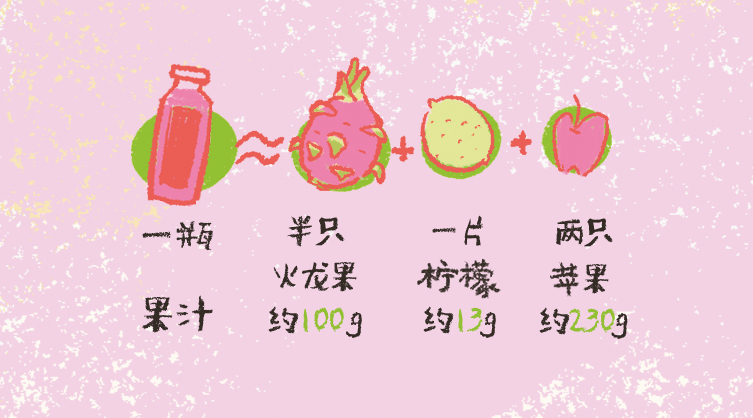每一瓶果汁需使用半个火龙果、一小片柠檬,和两只苹果,颜色红艳,口感酸酸甜甜。