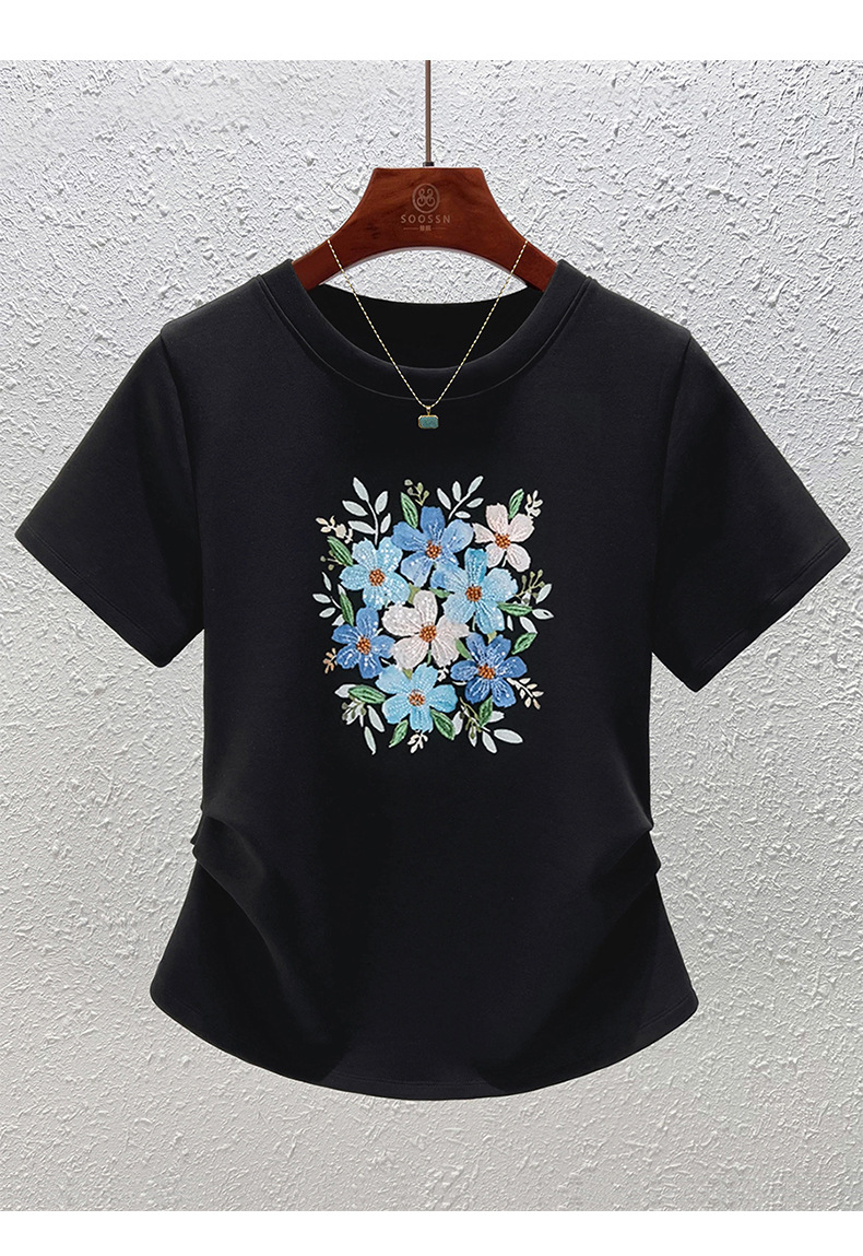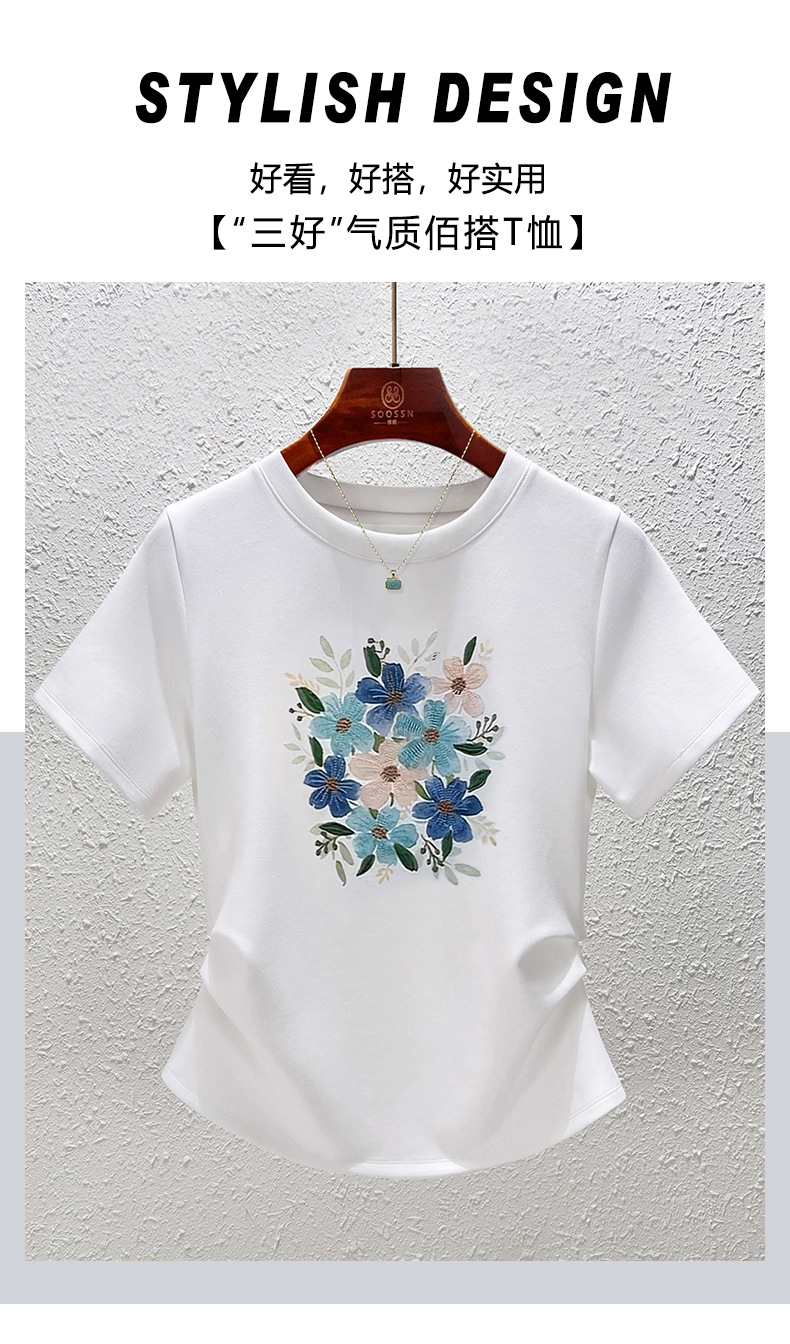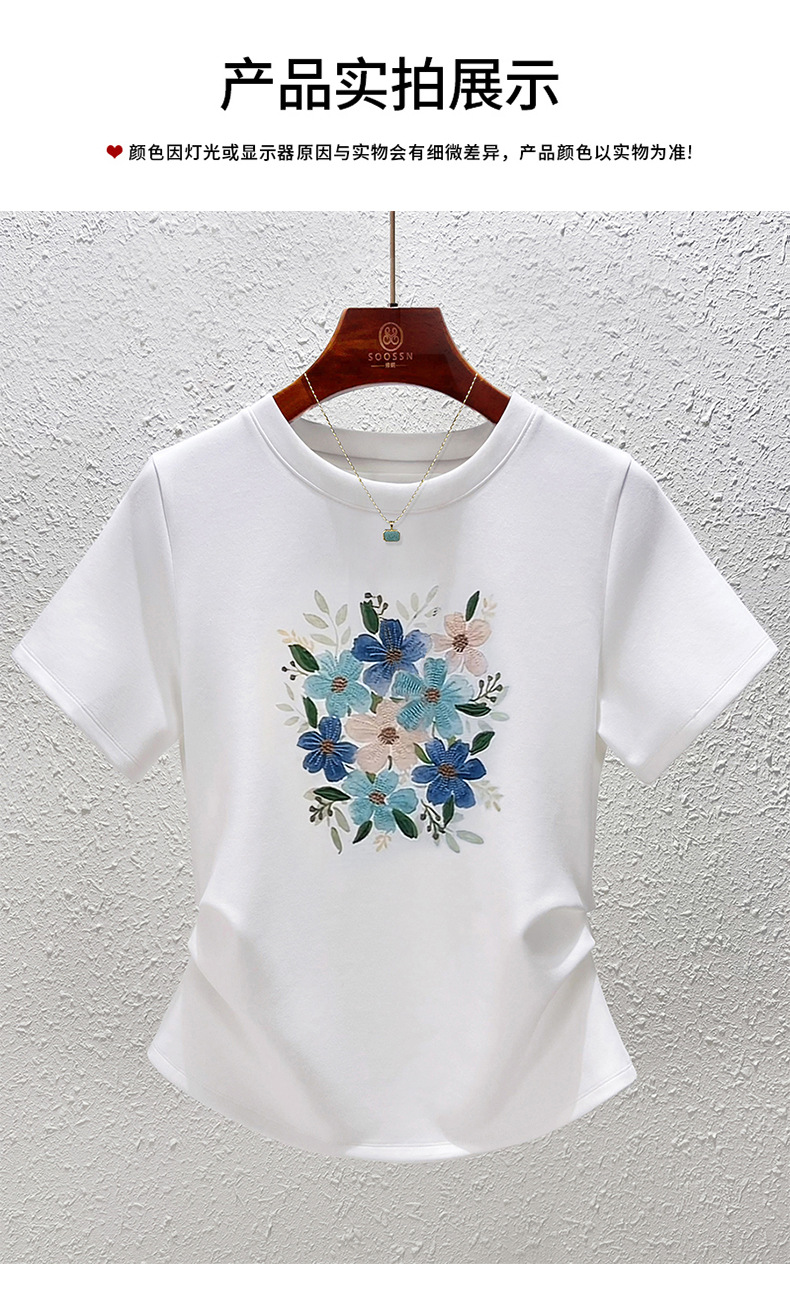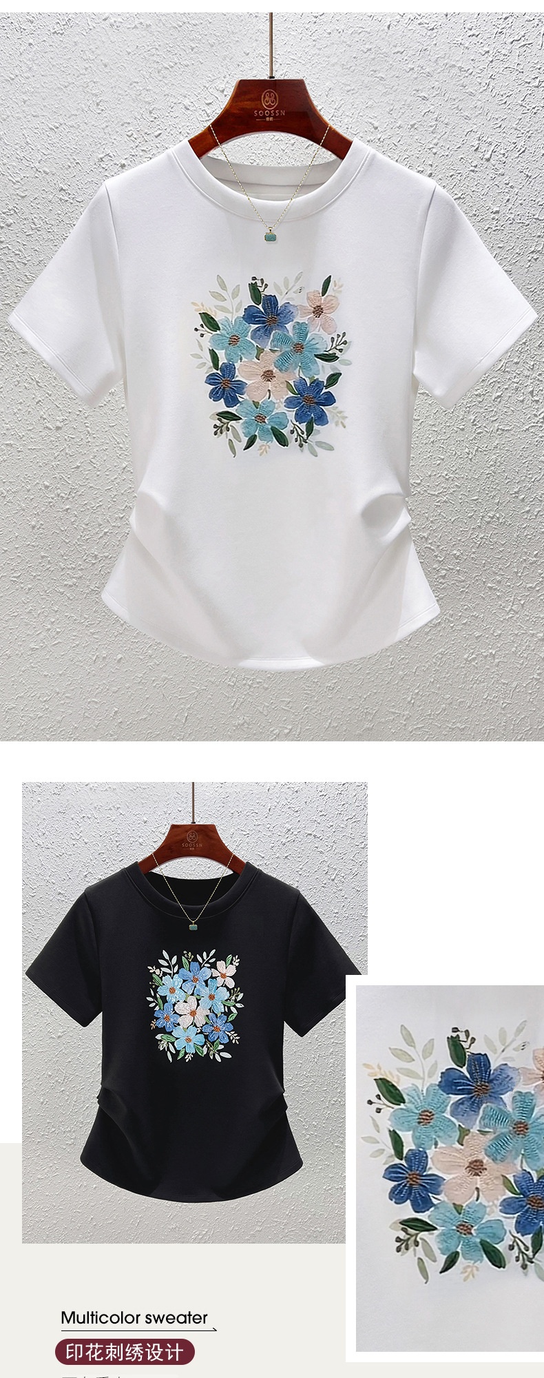「自」全新升级【铂金会员109/天猫139/差价30】(71101)洛诗琳重工刺绣花T恤2025夏季复古收腰显瘦百搭印花上衣女