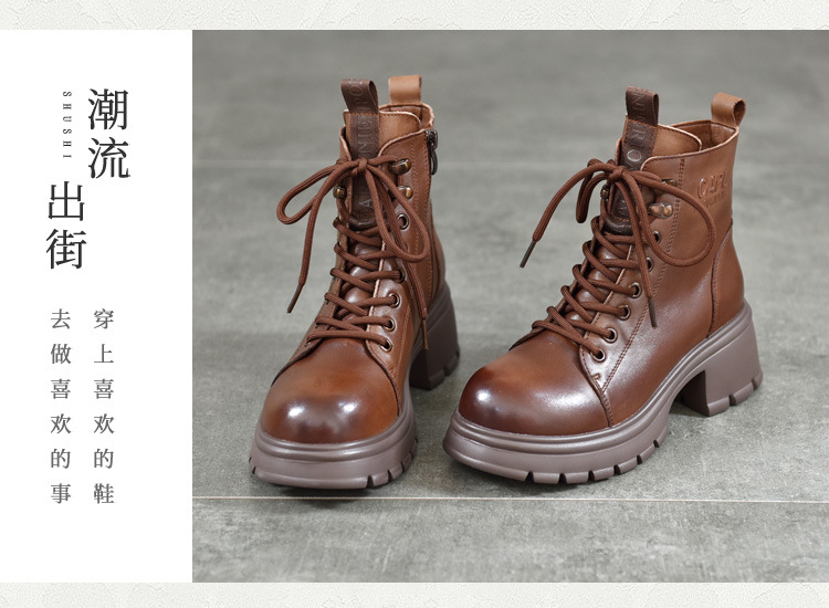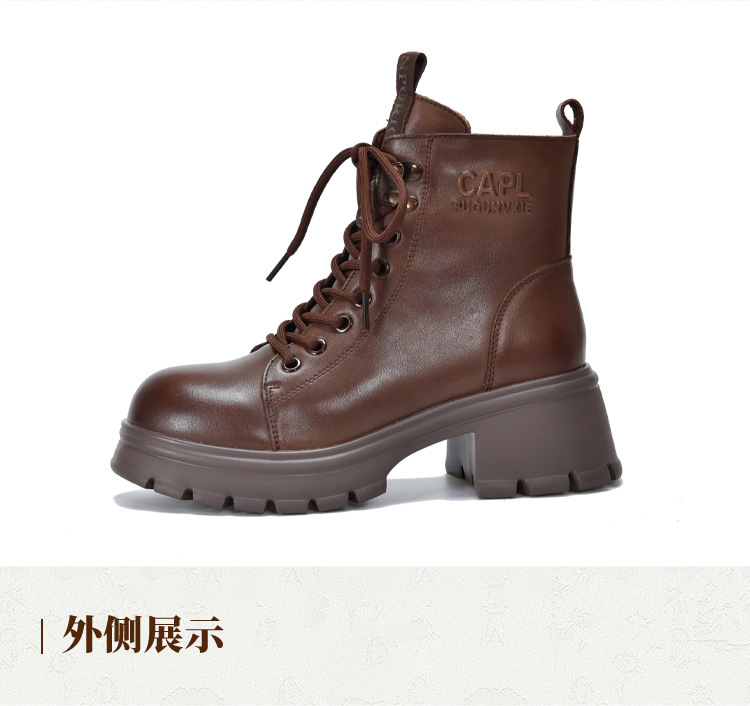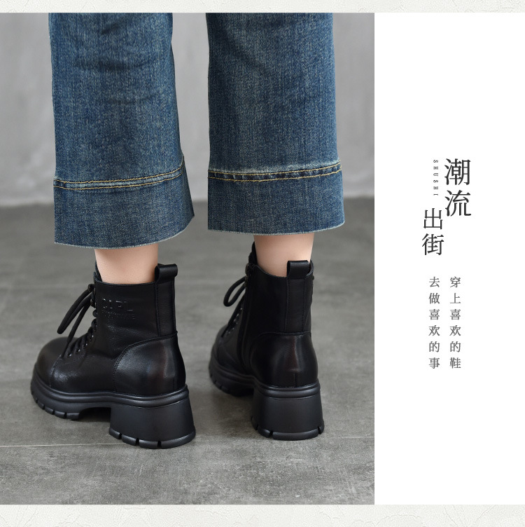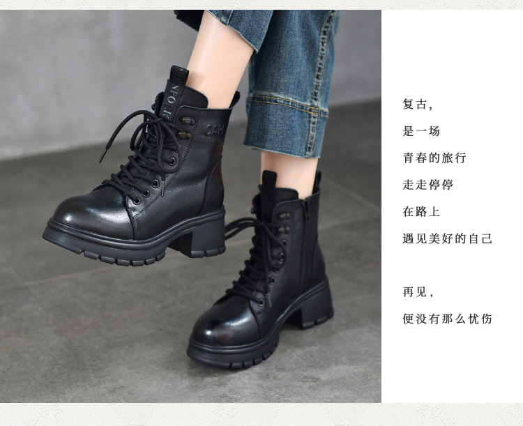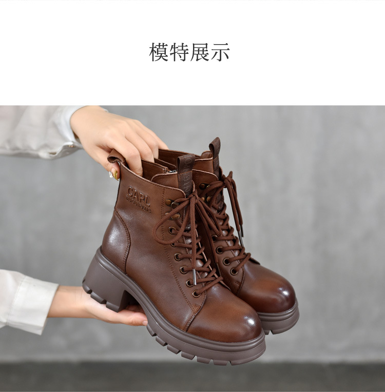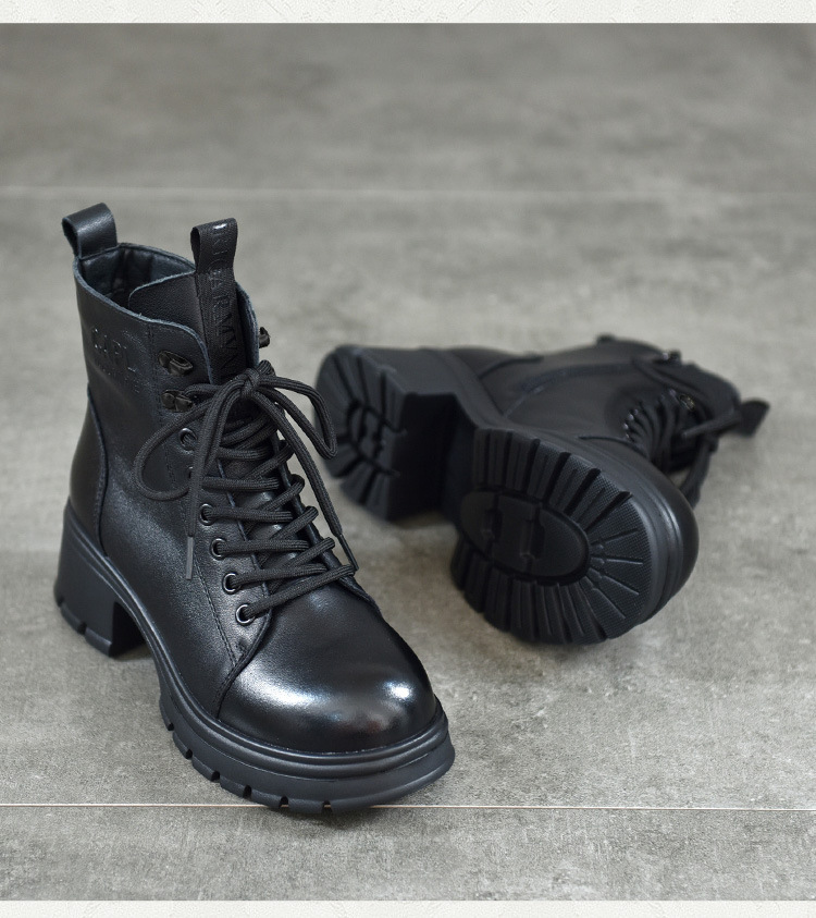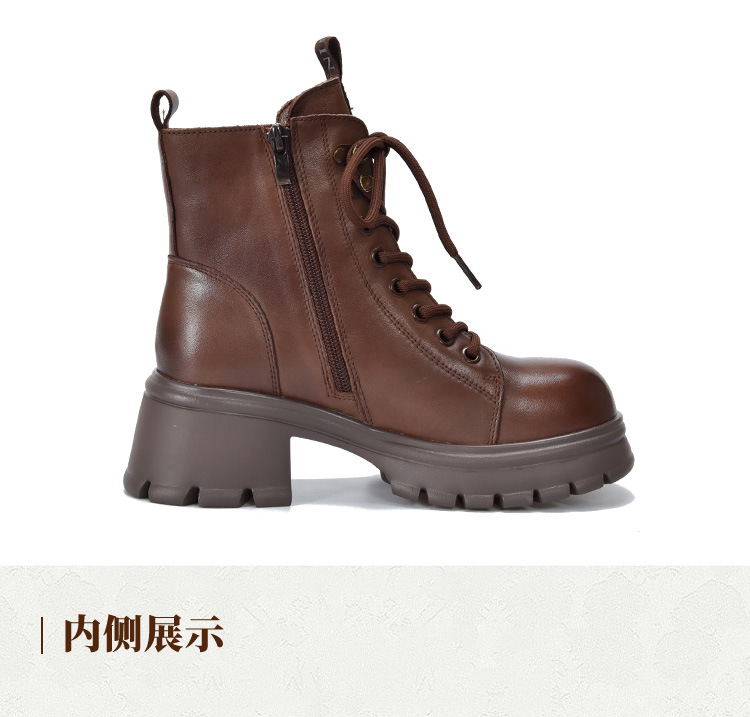 T886-52头层牛皮厚底系带马丁靴侧拉链短靴秋冬新款真皮单靴加绒女棉靴子