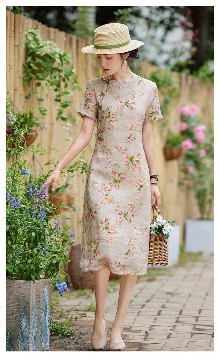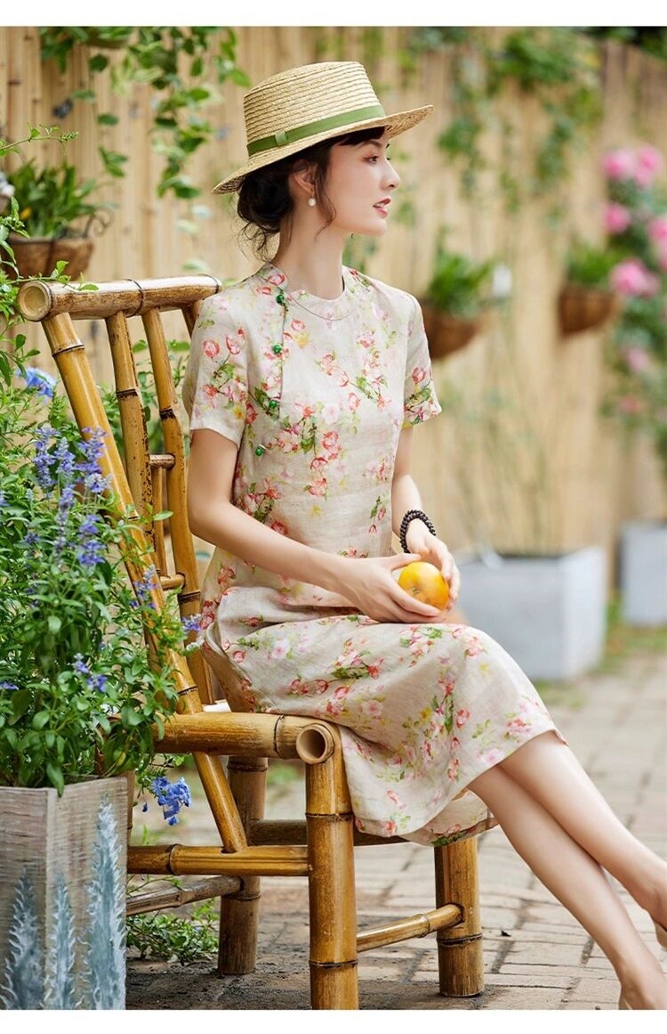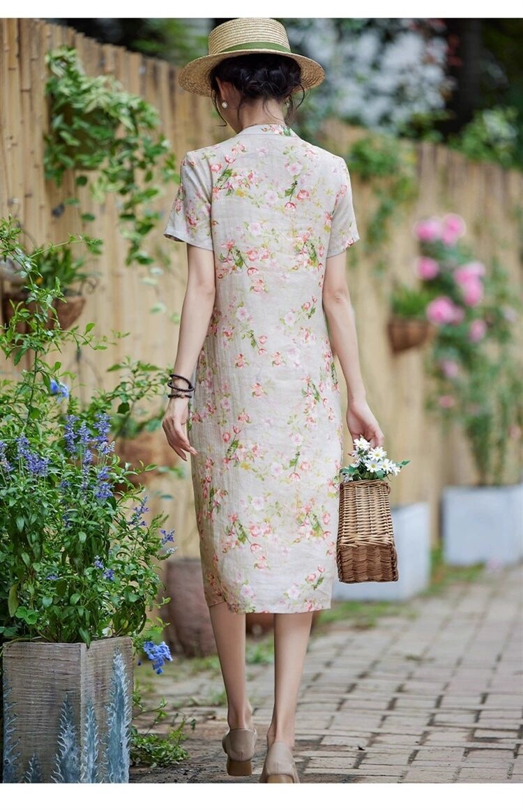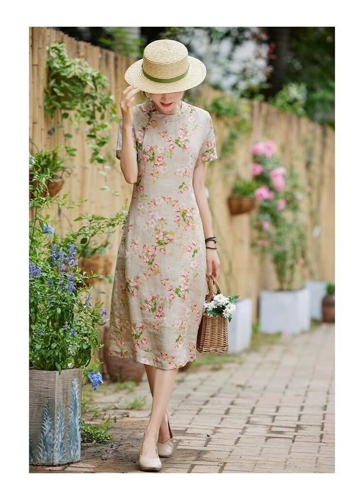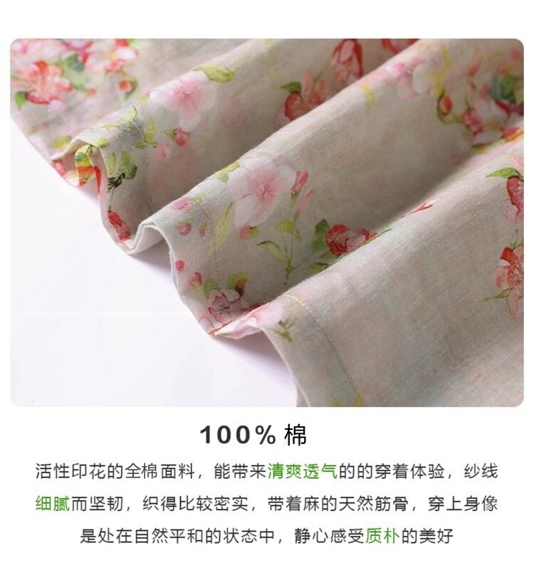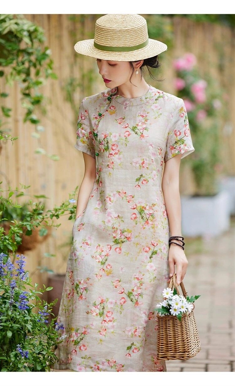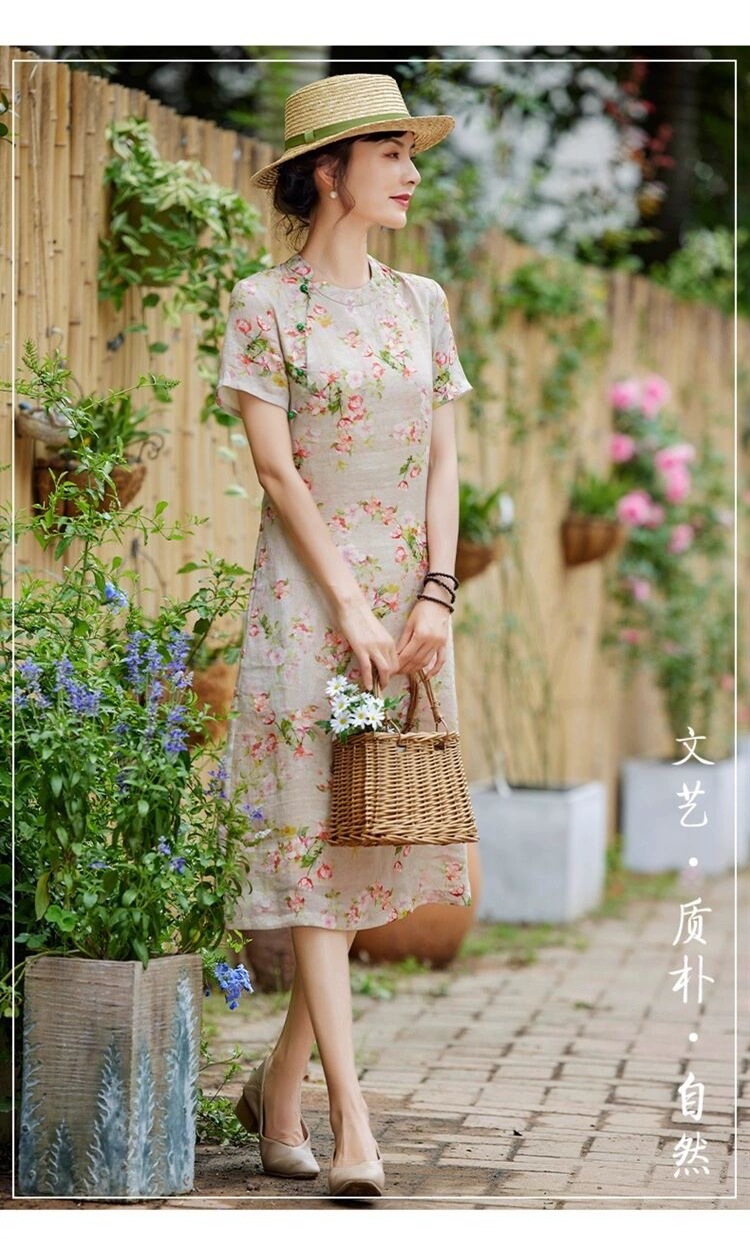 雀说新中式文艺国风宽松大码女装印花斜襟立领改良旗袍连衣裙AL1666