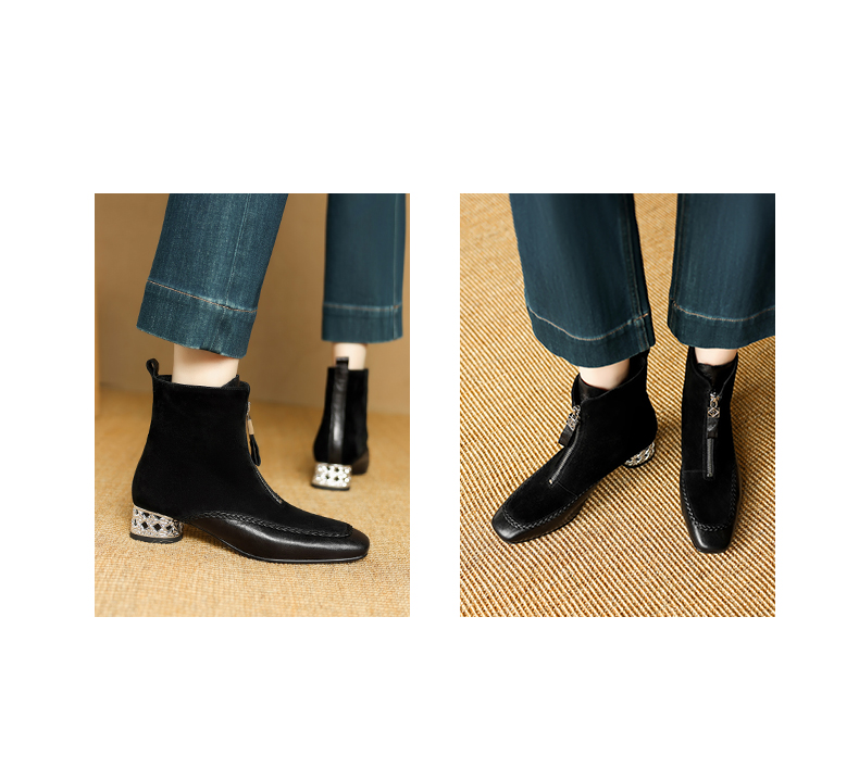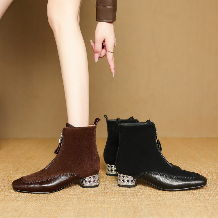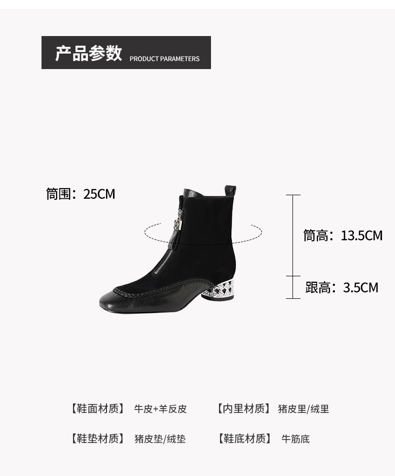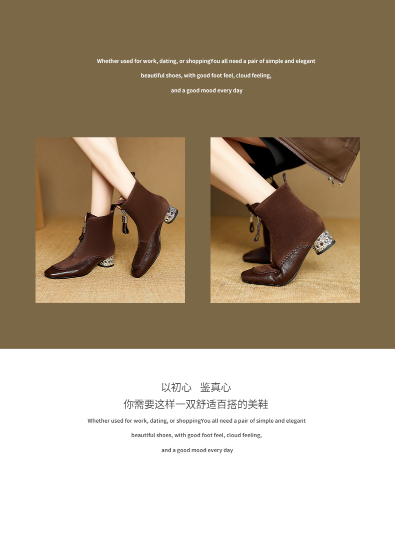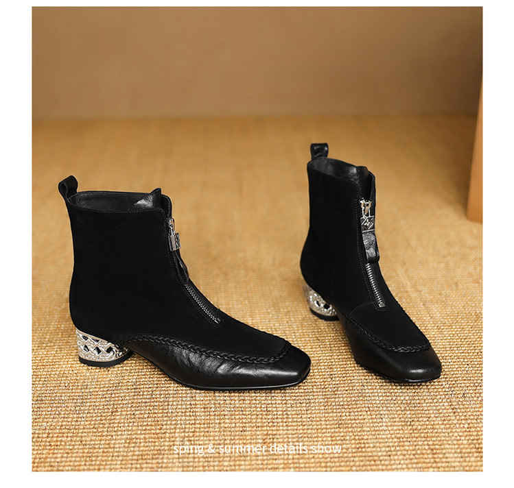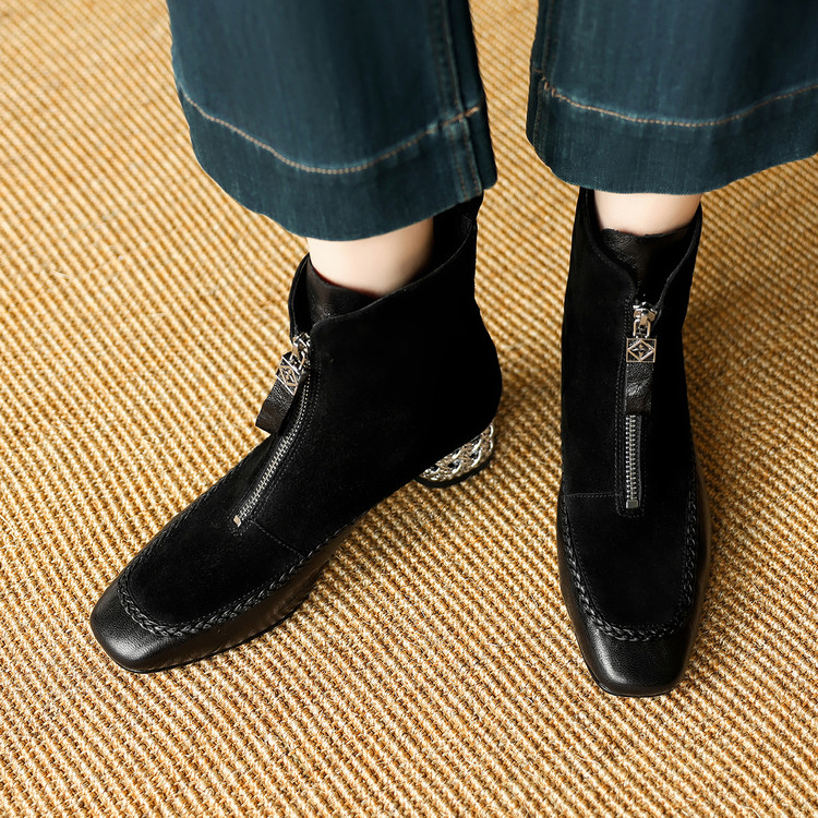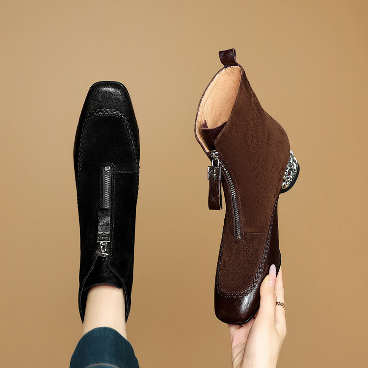 【预售5天】复古方头真皮粗跟短靴女秋冬新款前拉链软底骑士靴百搭单靴中跟靴NJMK&K1763
