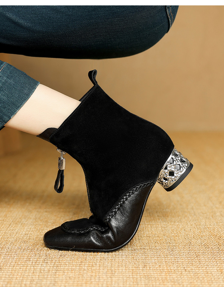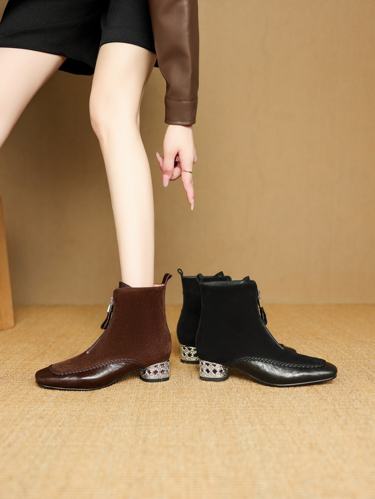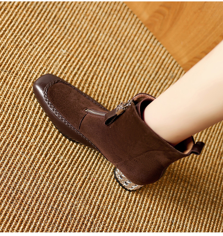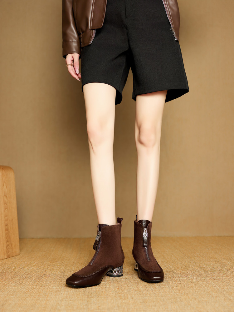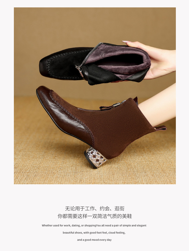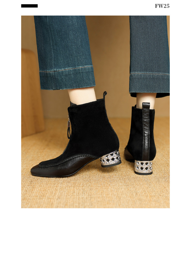 【预售5天】复古方头真皮粗跟短靴女秋冬新款前拉链软底骑士靴百搭单靴中跟靴NJMK&K1763