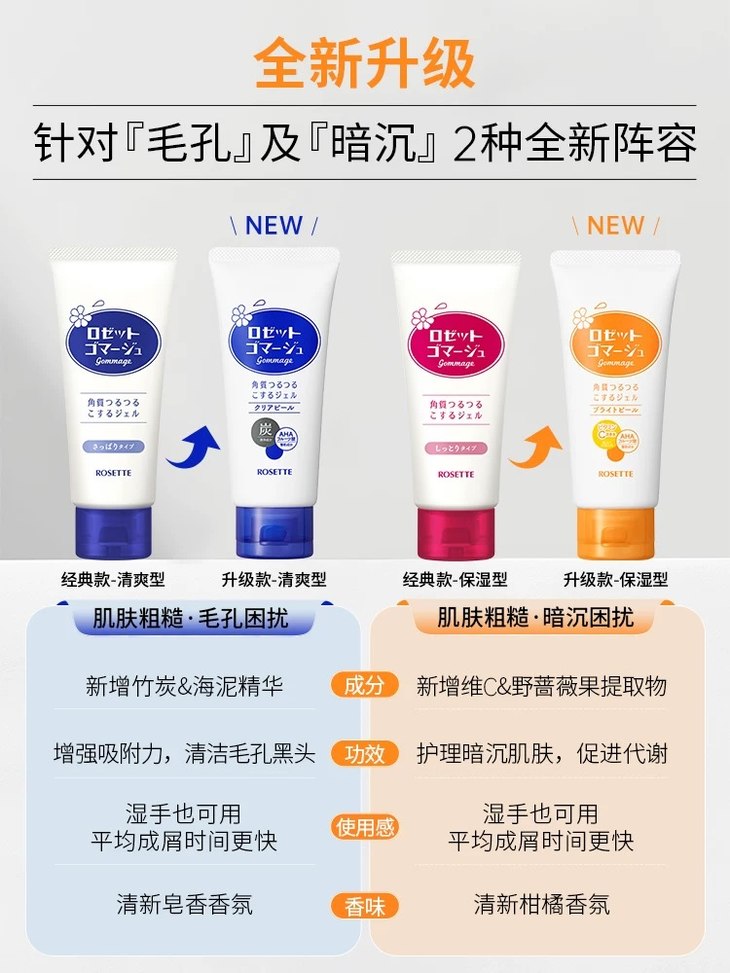 👑Rosette詩留美屋去角質凝膠120g 🌳#蓝色:新增炭黑精华+海泥精华,增强吸附能力,清洁毛孔黑头 🌻#黄色:新增维C诱导体+野蔷薇果提取物,护理暗沉肌肤,促进代谢 ⭐温润凝胶质地,不含磨砂颗粒,安心0添加! 💙蓝色清爽型: 油性肌肤/毛孔粗大肌肤 ❤黄色新版(旧版粉色)保湿型 :干性/暗沉肌肤
