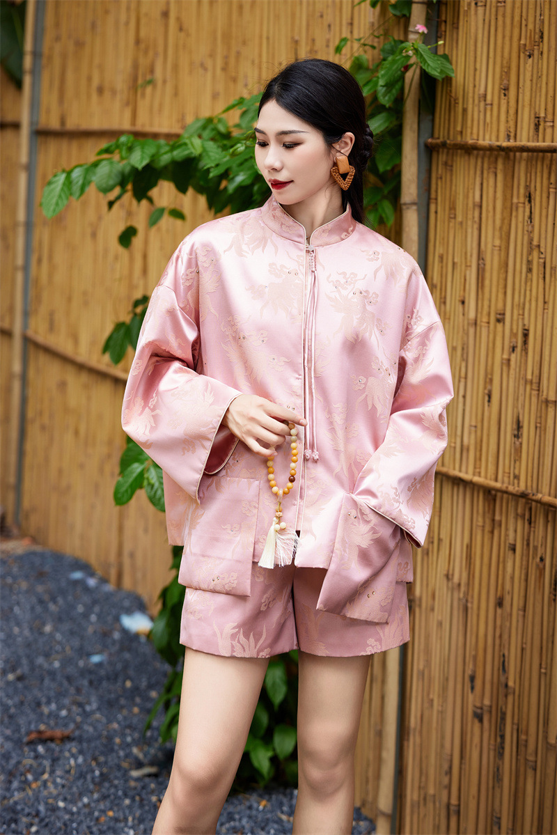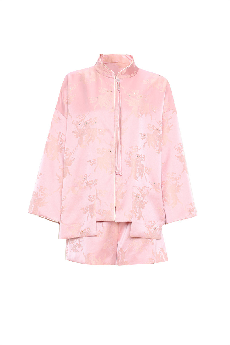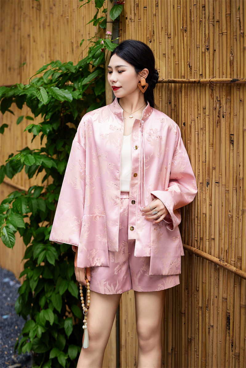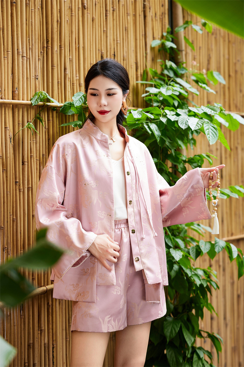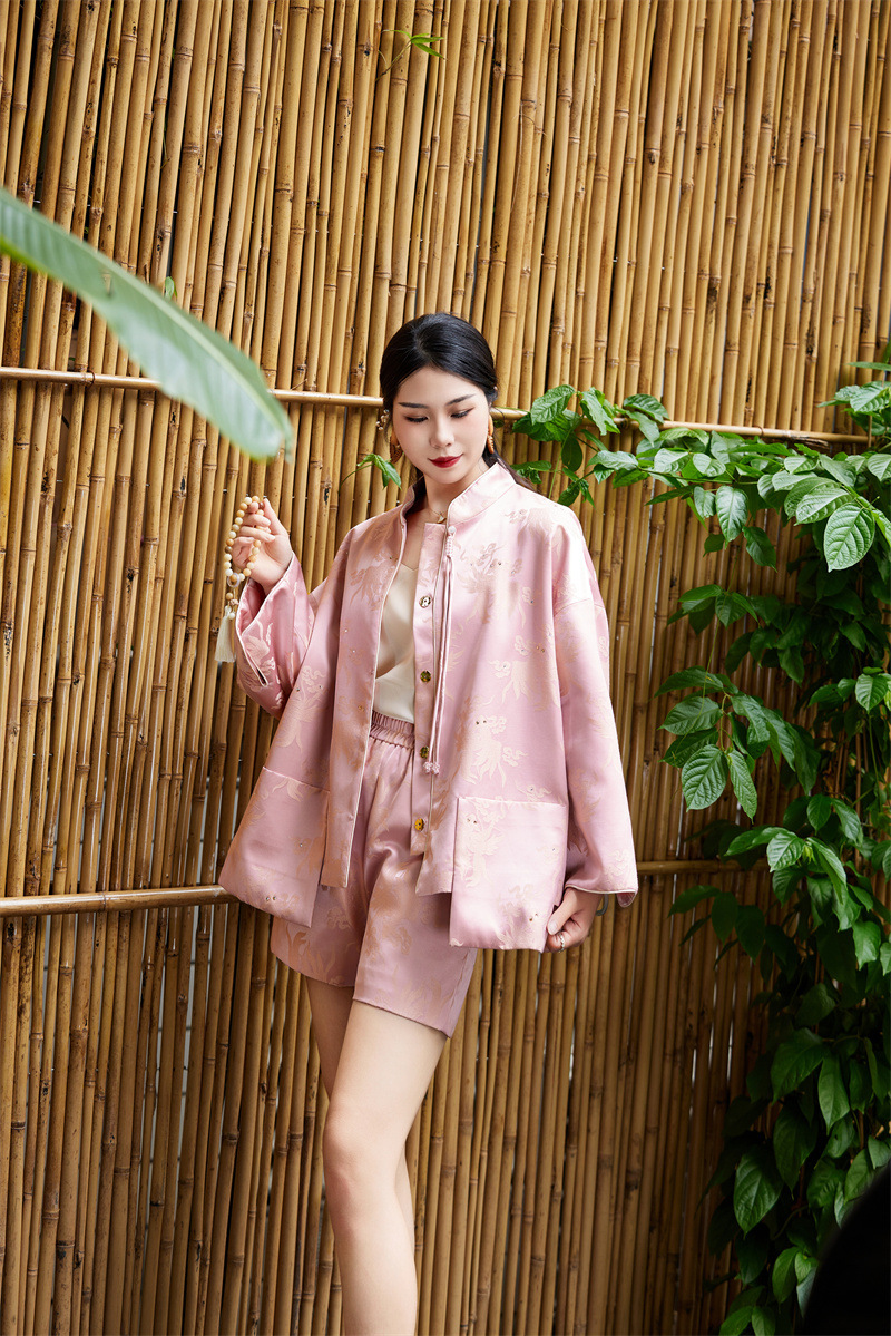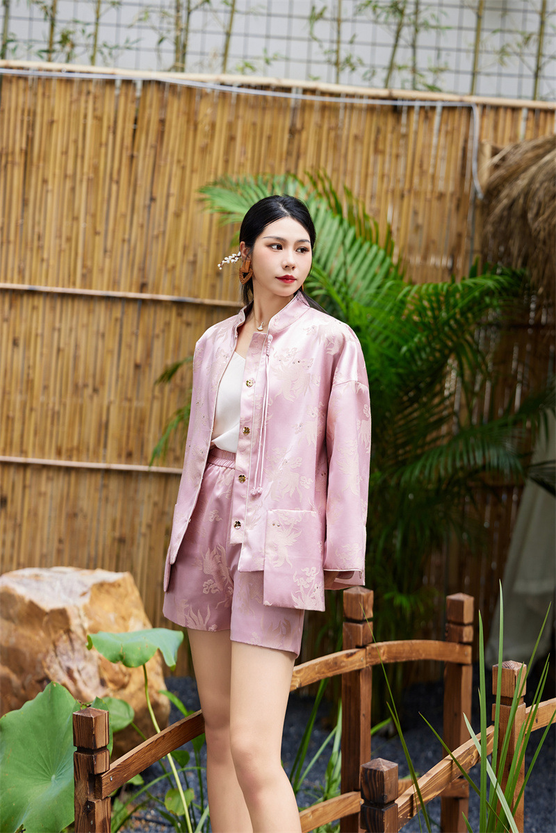 FLZD-A9433粉色小香风提花套装女秋季巨显瘦气质感小个子休闲短裤两件套