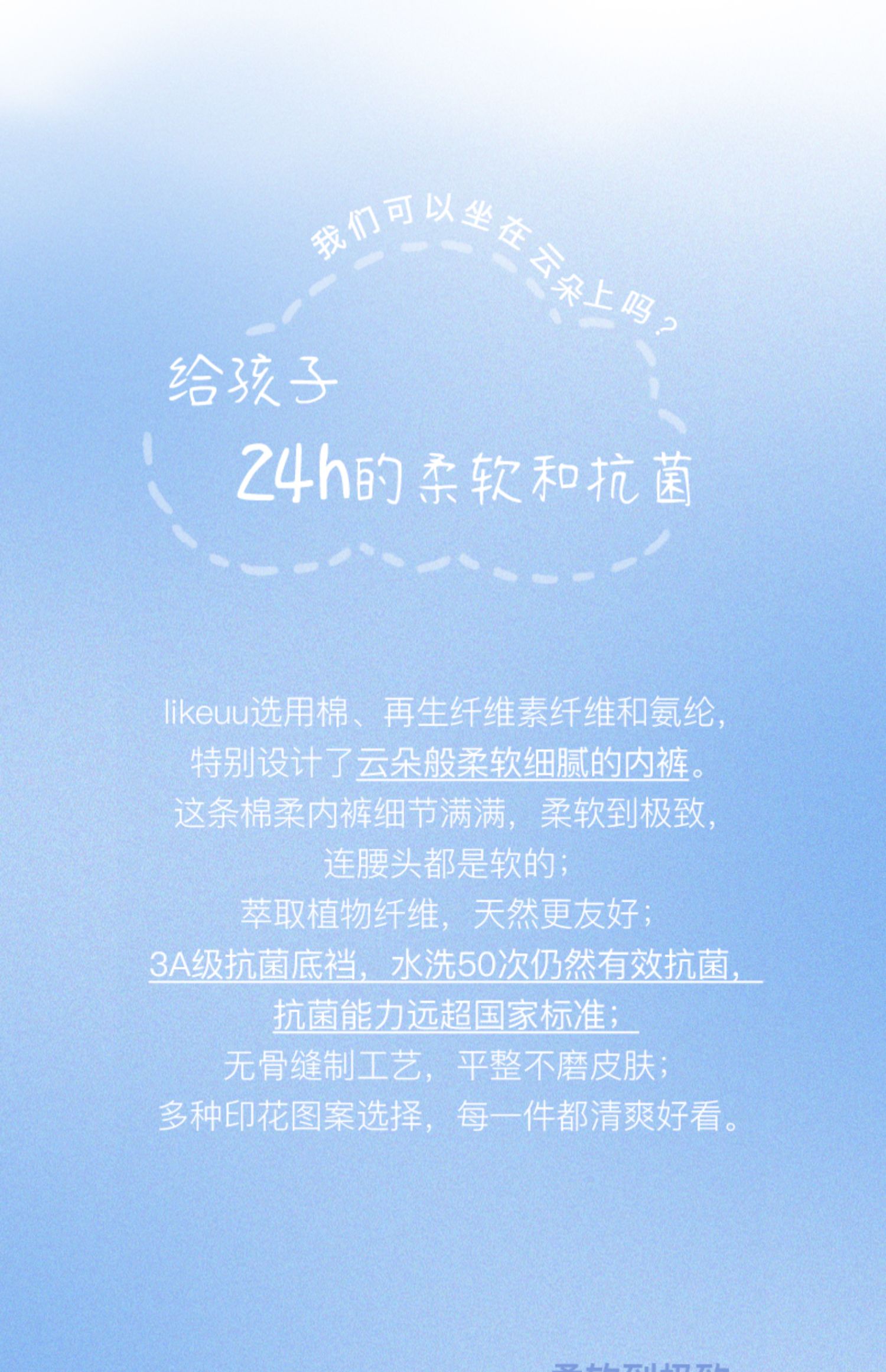 - likeuu是专注于为6~15岁的青少年创造柔软、无束缚的成长体验,以好奇心为灵感的成长发育期贴身衣物品牌。likeuu的产品覆盖内衣、内裤、保暖衣、家居服、运动等品类。