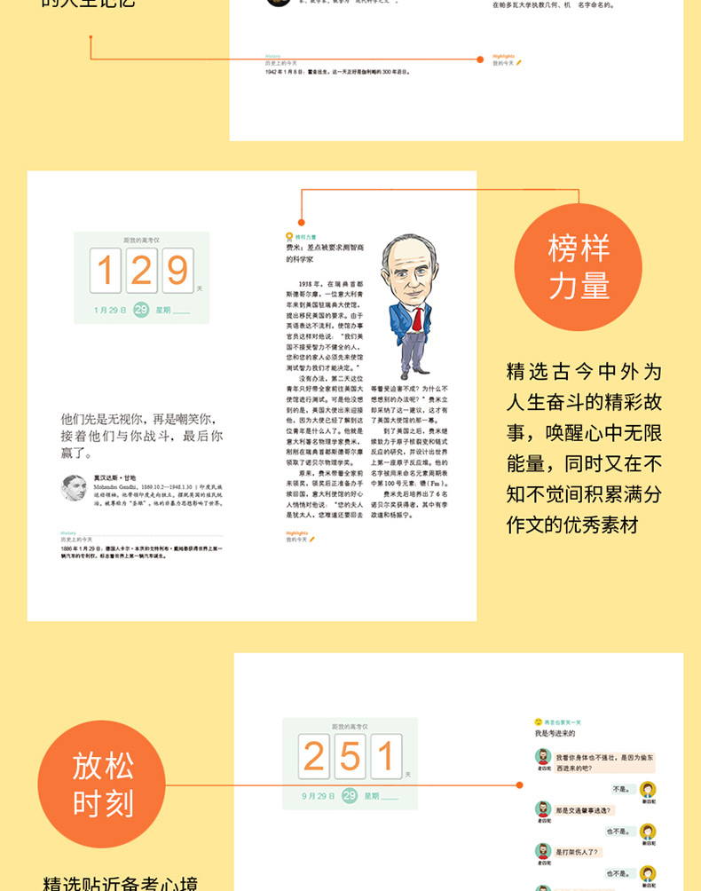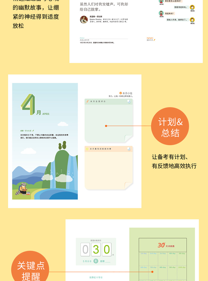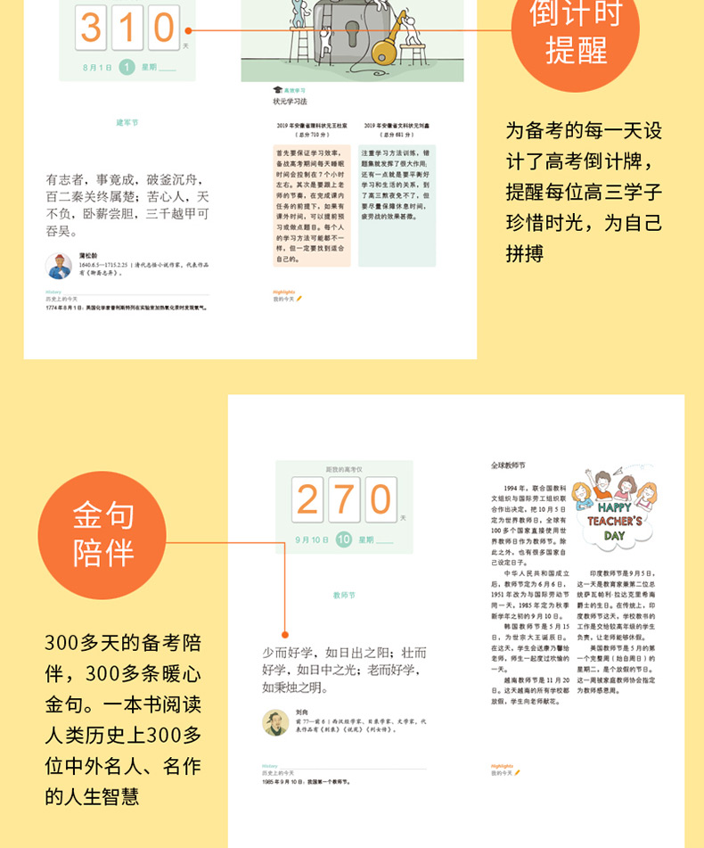 根据高三学子逐渐临近高考,每月每周每天的情绪变化,精心选取300多条贴心金句,温暖高三学子的每一分钟;另有状元经验、名校速览、榜样力量、减压笑话、志愿无忧等高三学子必需的知识和资讯内容;设置了月度目标、一周计划、本月小结等栏目,方便高三学子高效备考;设计了“历史上的今天”“ 我的今天”等栏目,鼓励高三学子记录下高考奋斗的“美时美刻”。许多年后,拿起它将是满满的美好记忆。