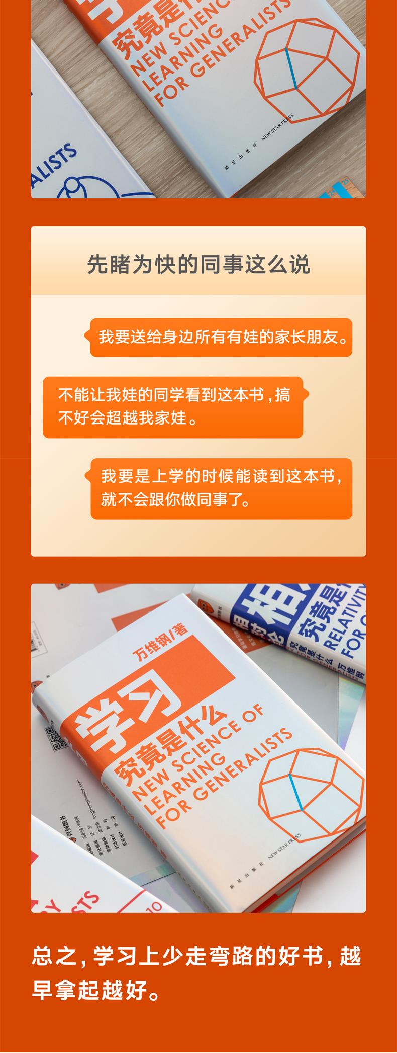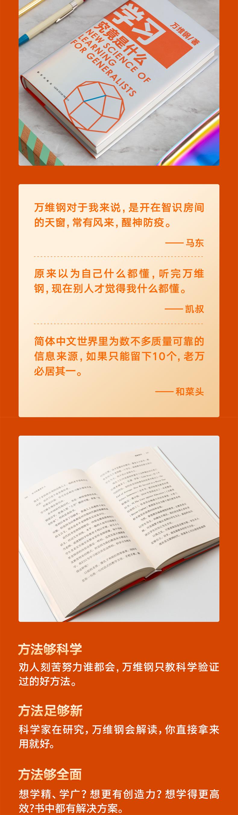 很多人虽然多年坚持学习,却往往是按部就班地读书、记忆、写作……没有摸索出一套科学高效的学习方法。本书层层深入,把科学家们通过实验研究和对学习高手的观察,结合心理学及脑科学总结出一套系统、科学、高效的学习理论分享给我们,配合操作性很强的学习建议,帮助我们成为更有章法、更有智慧、真正的学习者。韩愈本人曾说:“学海无涯苦做舟。”他说的是1200多年前。最近几十年,全世界科学家结合心理学和脑科学,已经进一步发现学习的秘密。只有世界上少数一流的脑力工作者,在用这些方法学习。跟随万维钢,你将成为知道这些重大学习秘密的人之一。优选学习效率=15.87%、秘密项目、修炼文化自觉……连这些学习方法都知道的你,一定会成为学习高手。