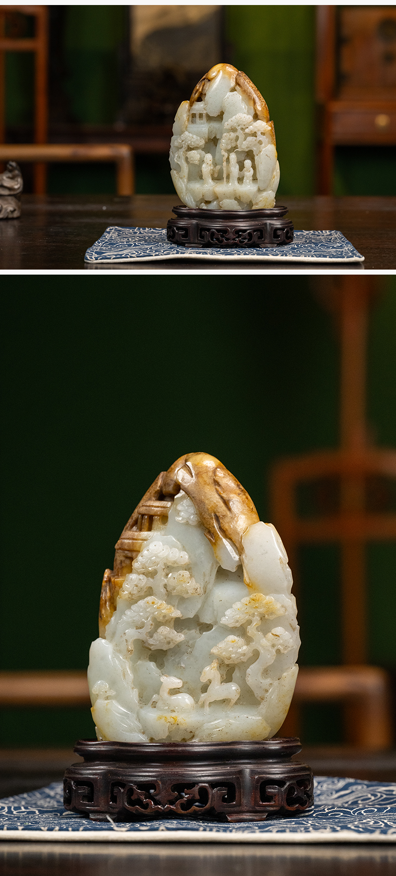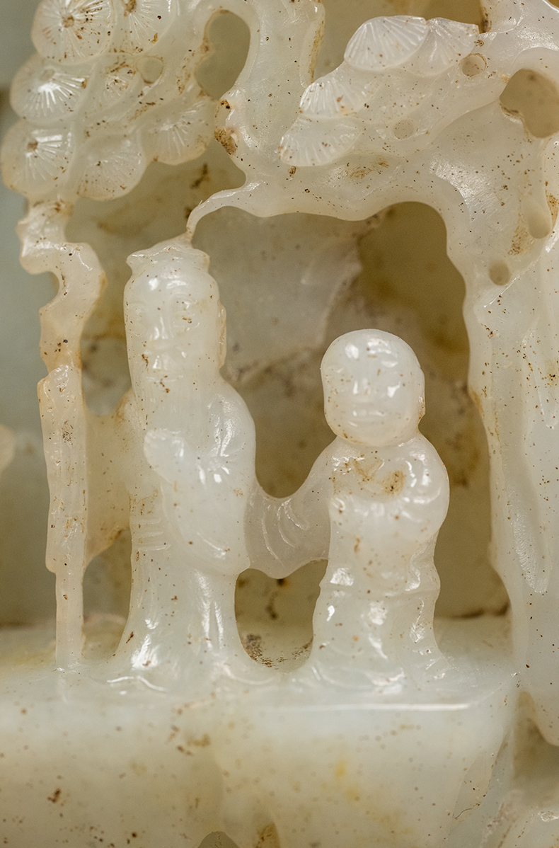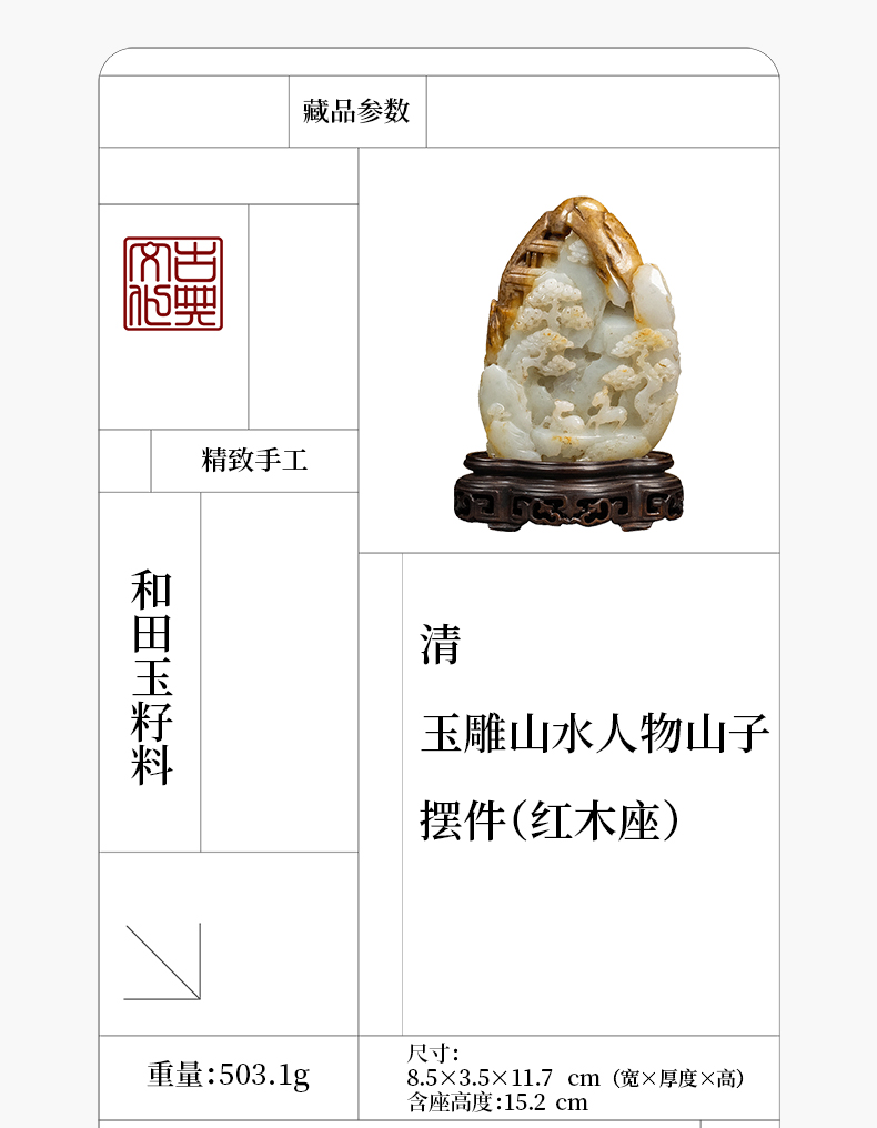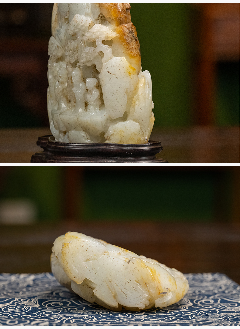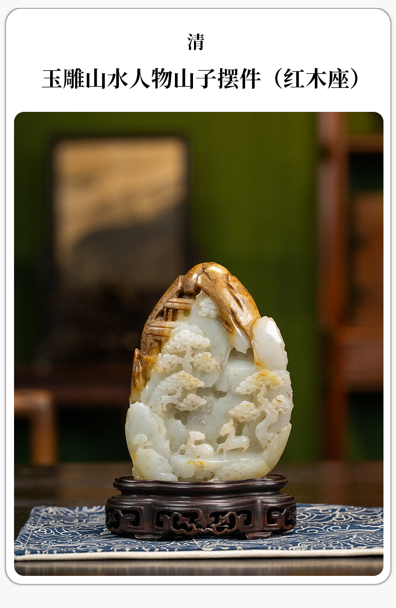清 玉雕山水人物山子摆件(红木座)