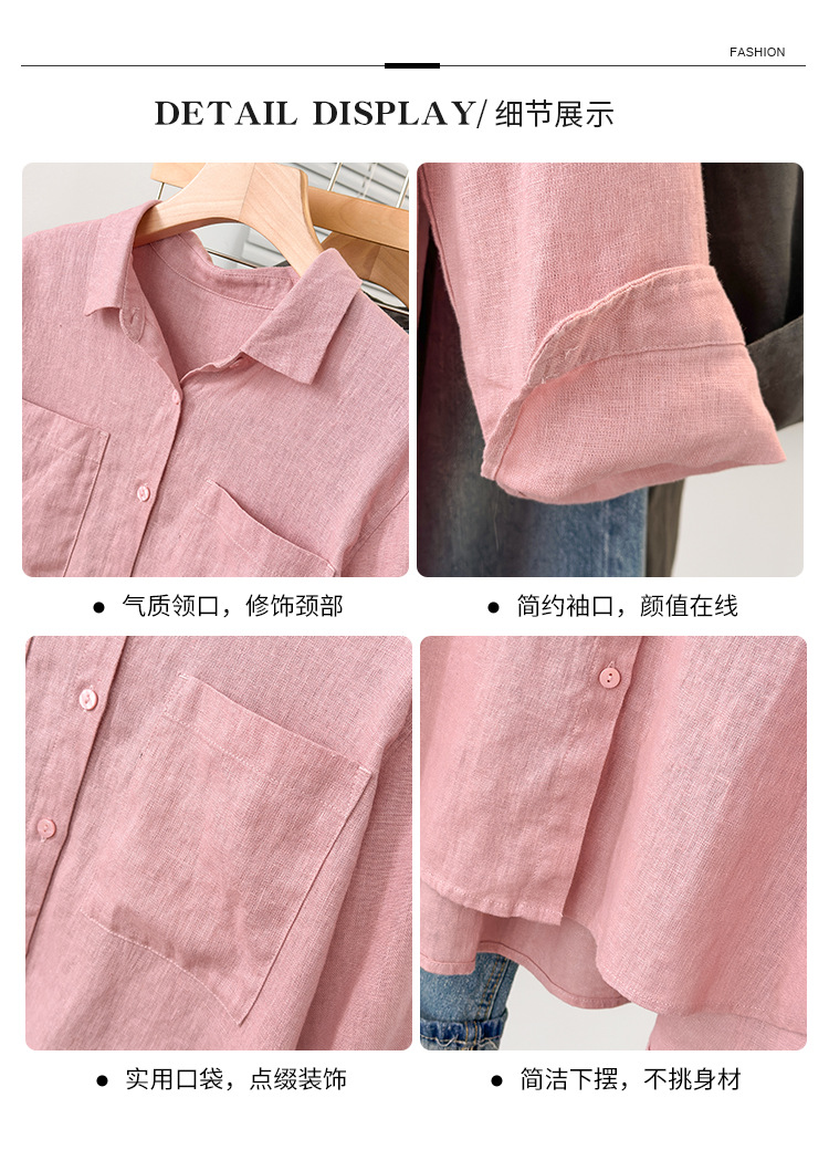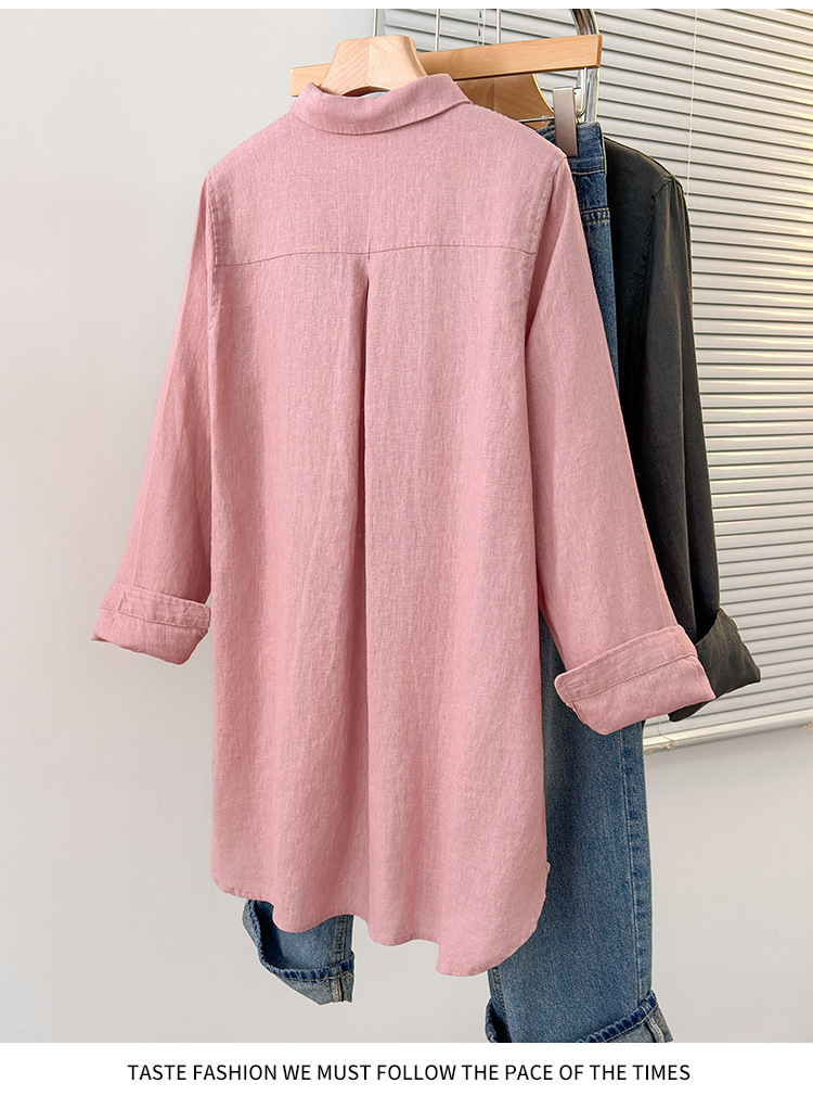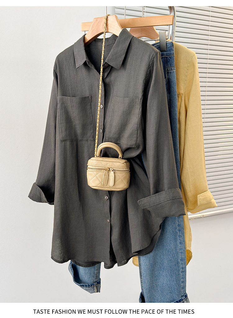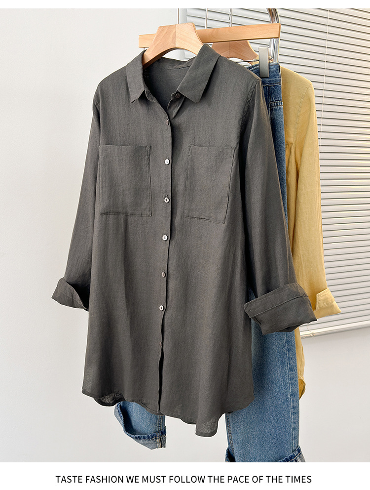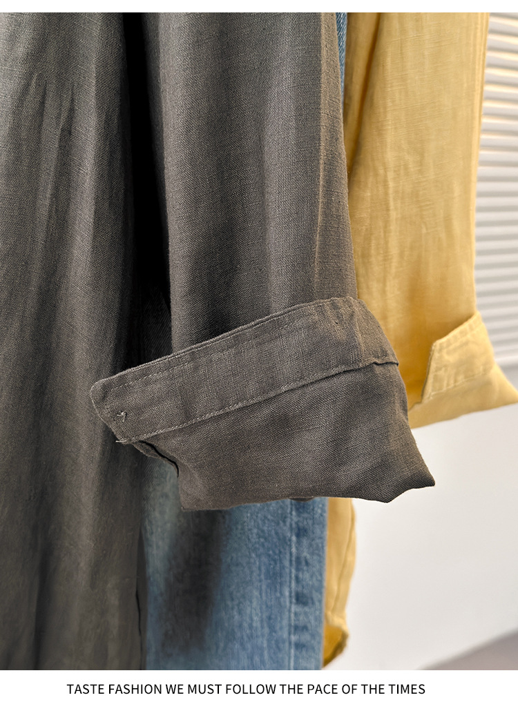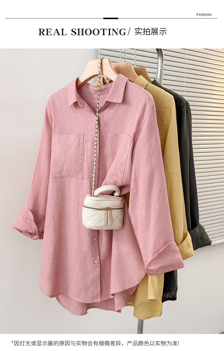 2025初秋纯亚麻长袖翻领衬衫文艺宽松大贴袋中长款上衣棉麻薄外套