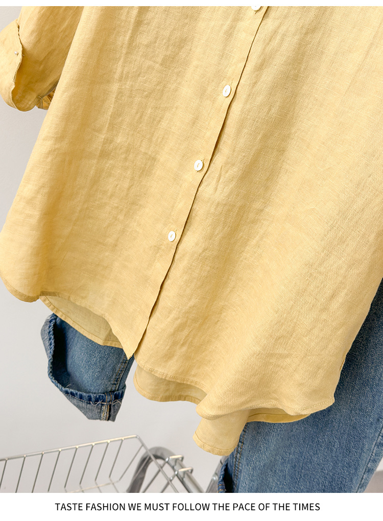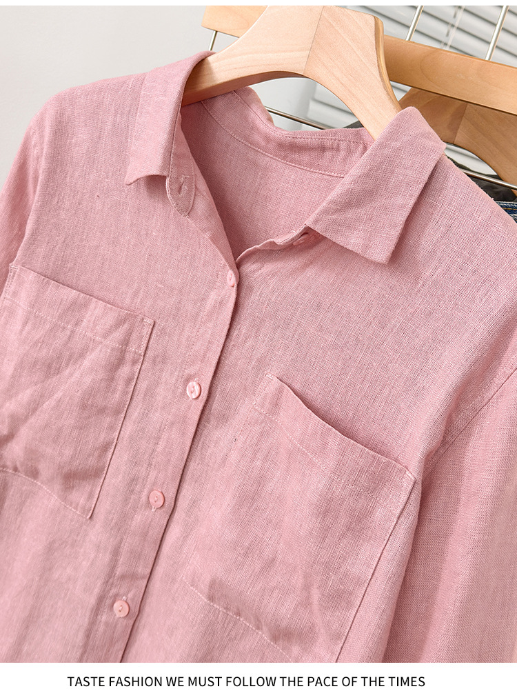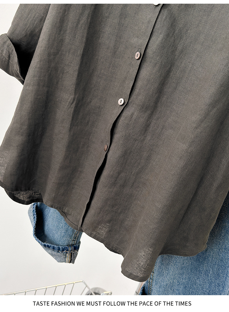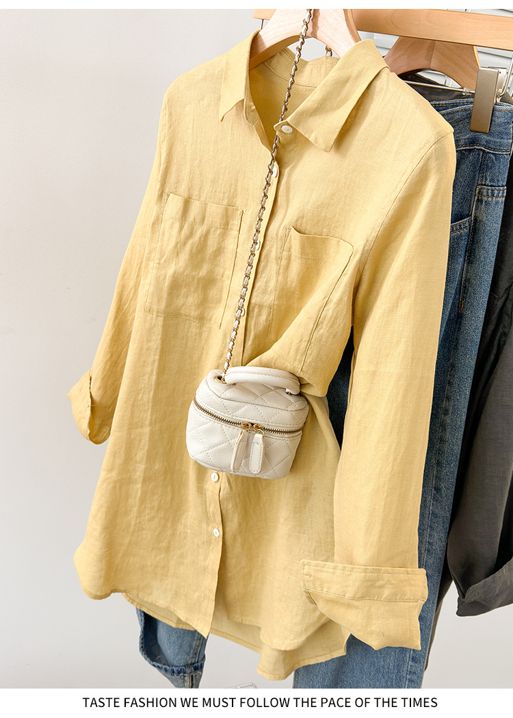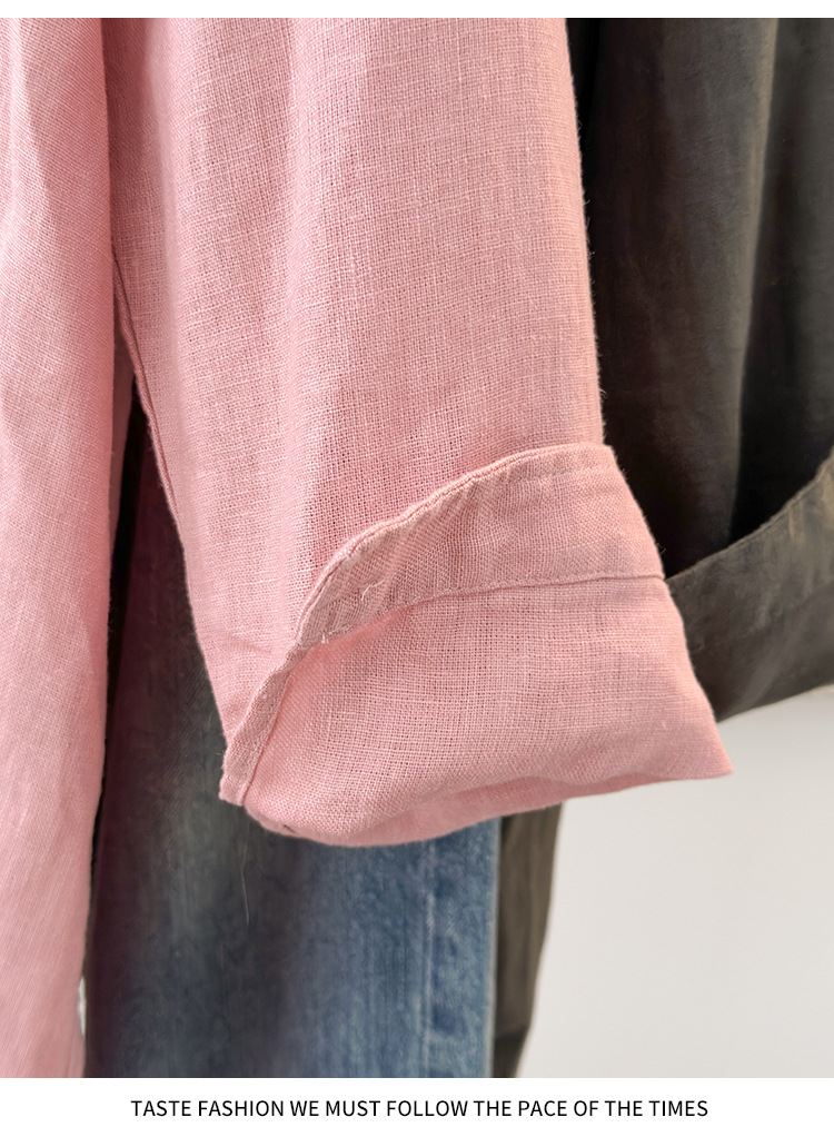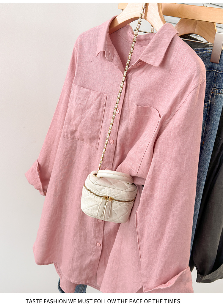 2025初秋纯亚麻长袖翻领衬衫文艺宽松大贴袋中长款上衣棉麻薄外套