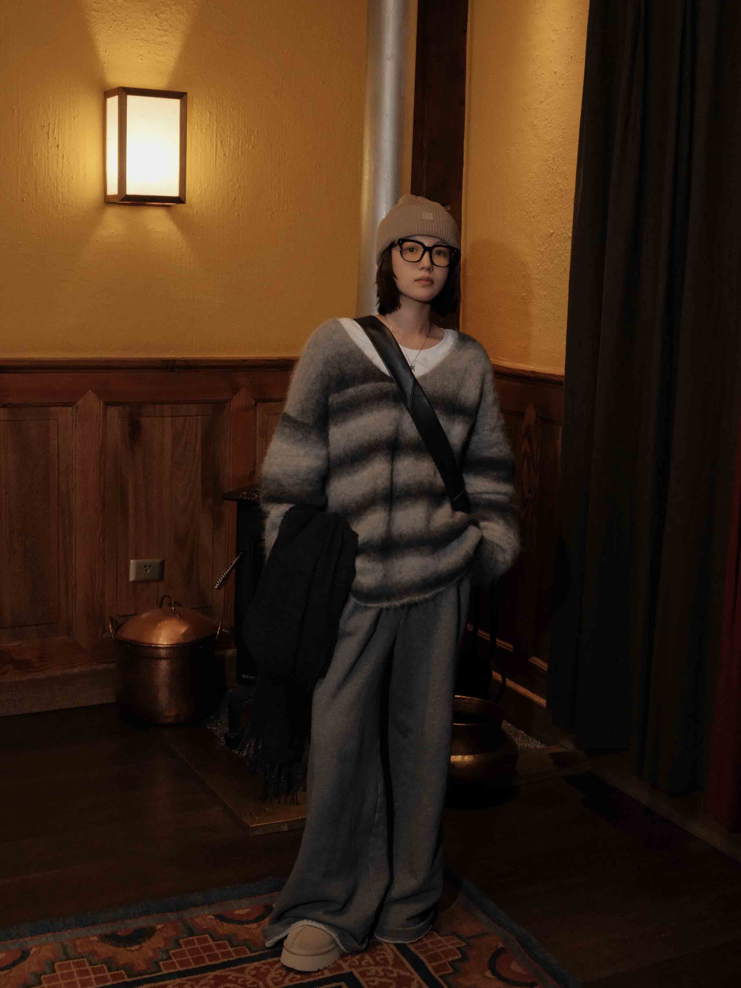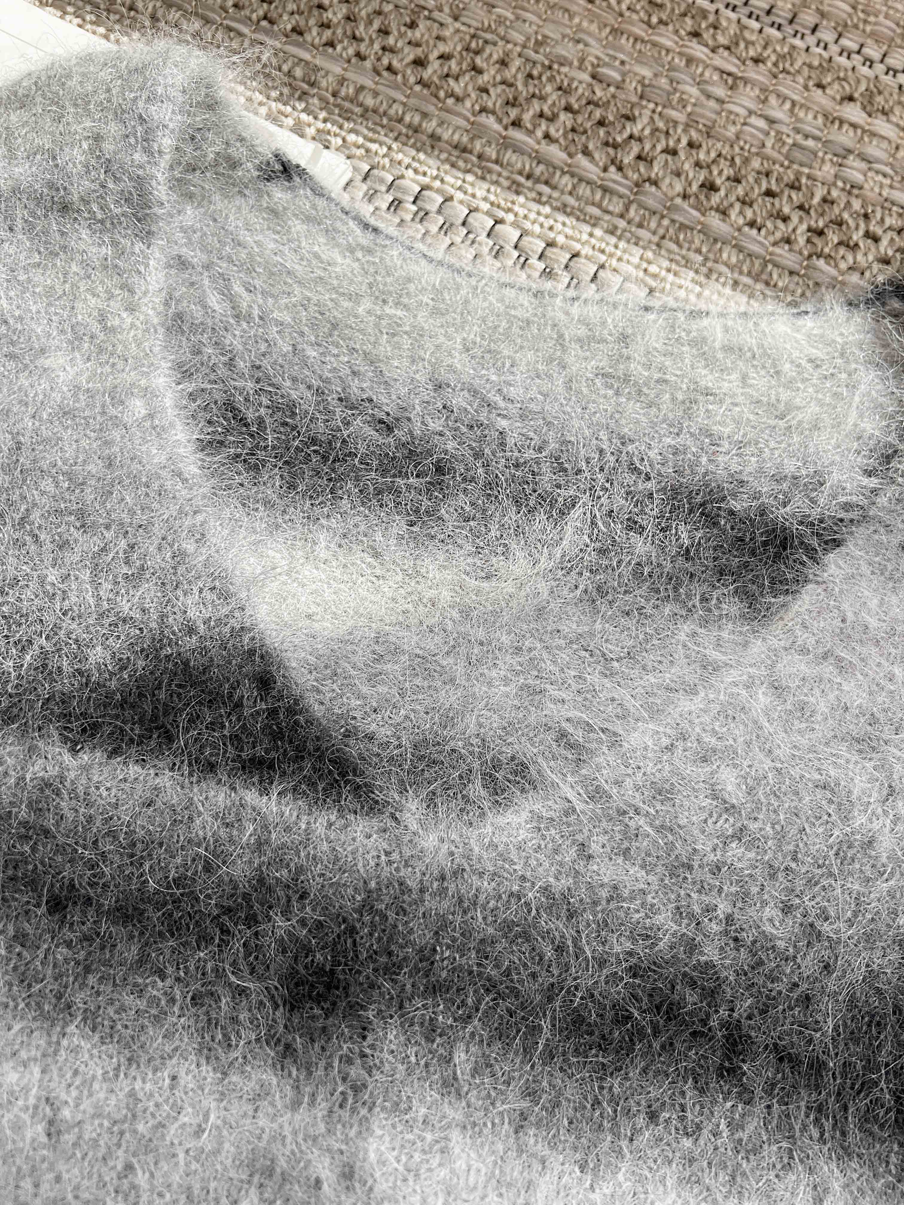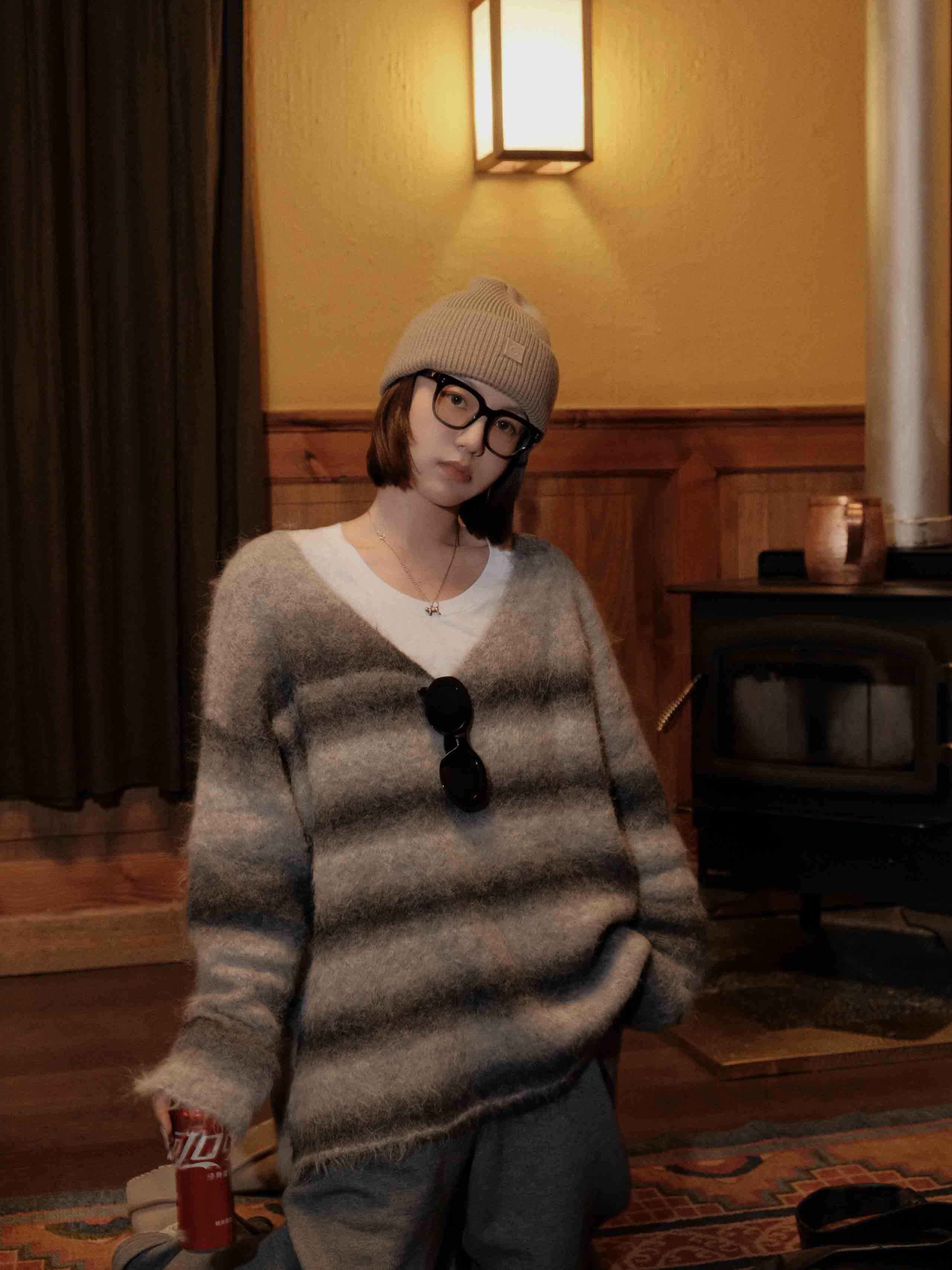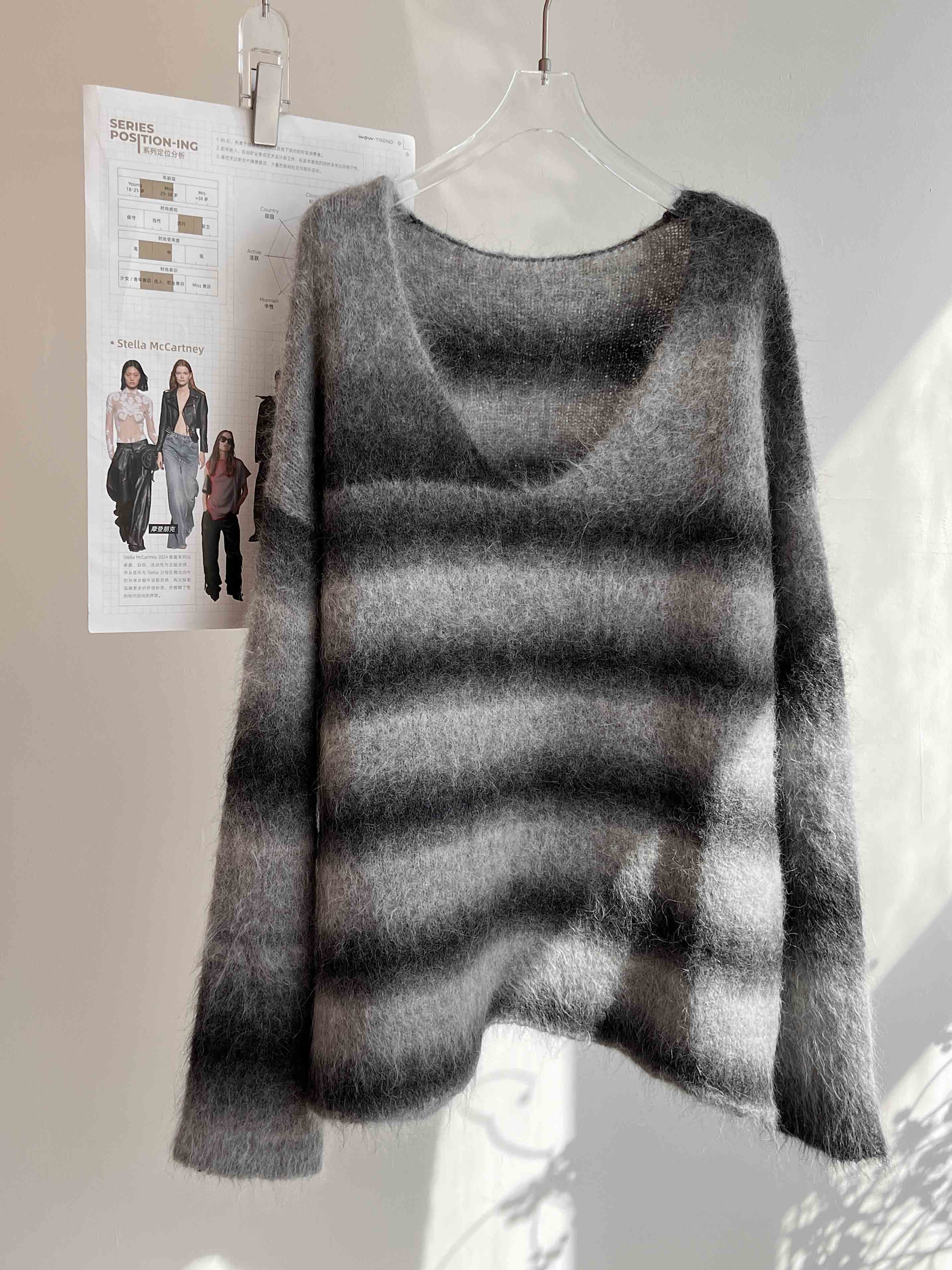 羊驼混纺渐变灰色条纹V领毛衣,绒感丰满✔️蓬松轻盈