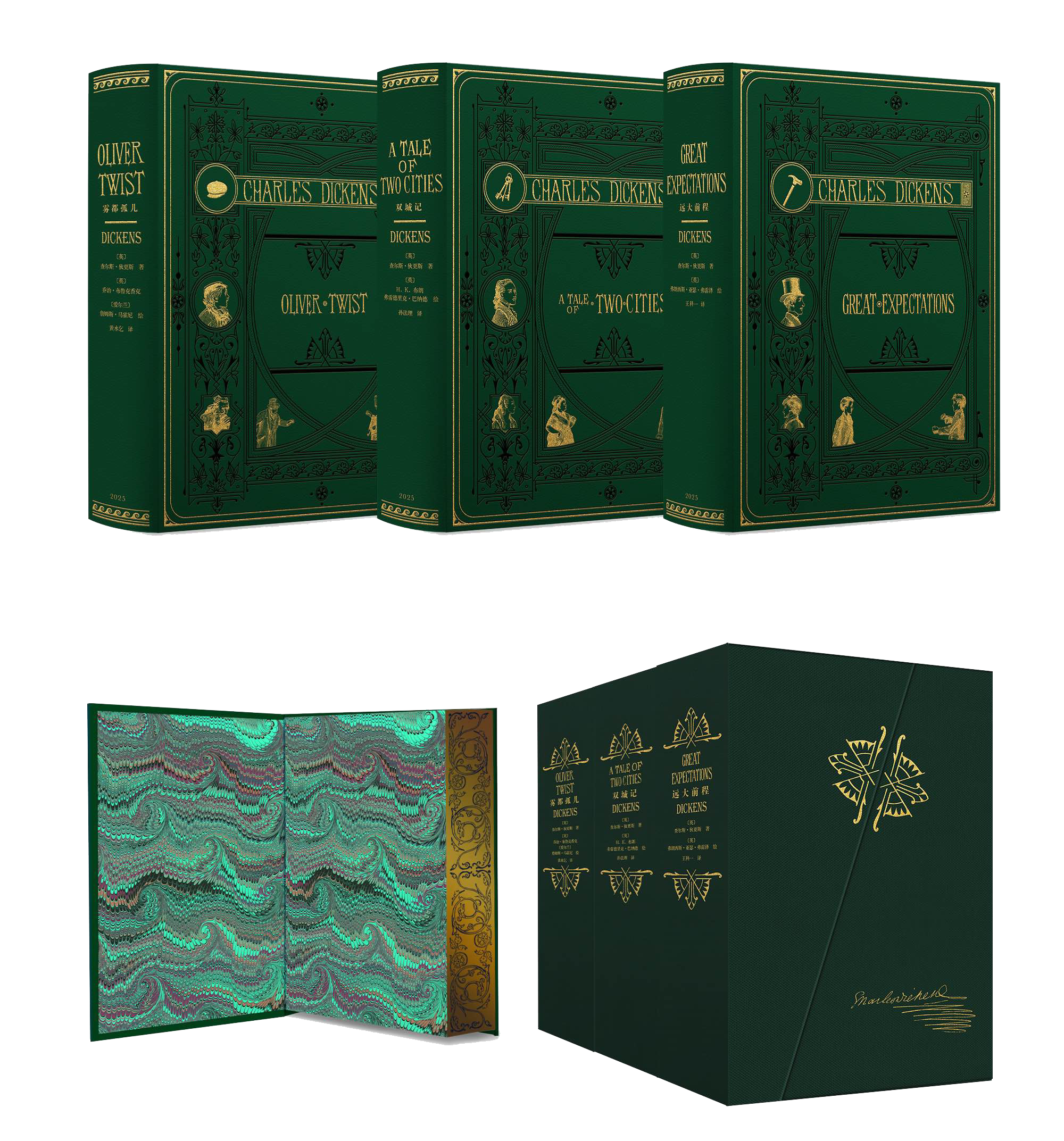 【限量真皮定制】狄更斯三部经典套装《雾都孤儿》《双城记》《远大前程》,致敬经典套装,绿色牛皮,书口三面鎏金+丝印图案