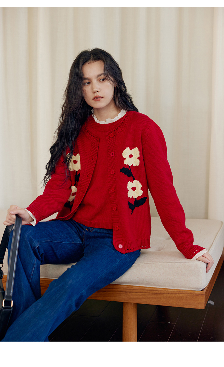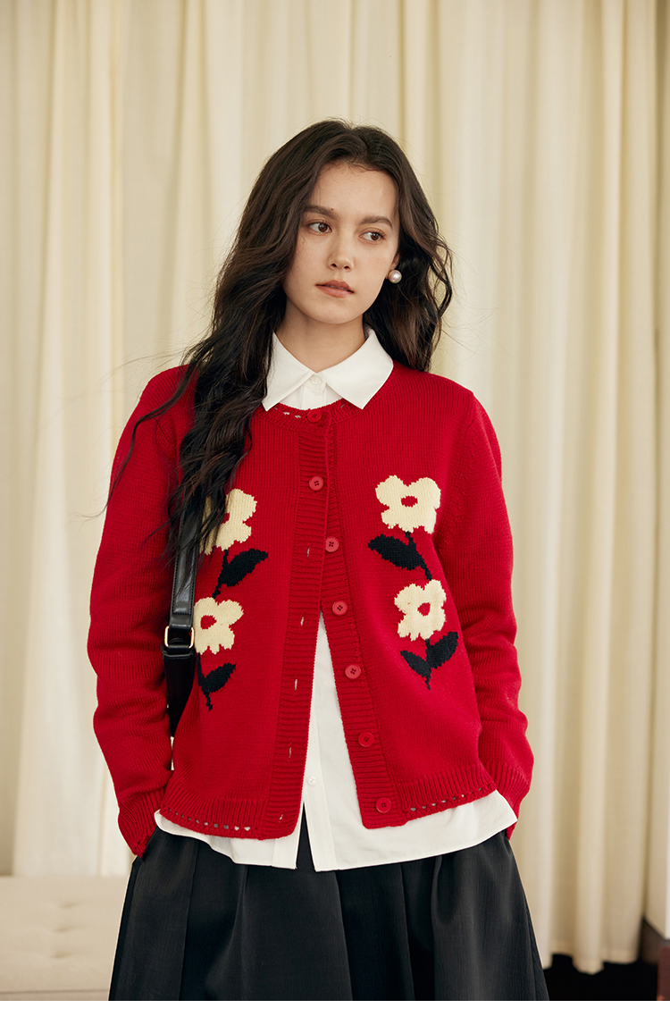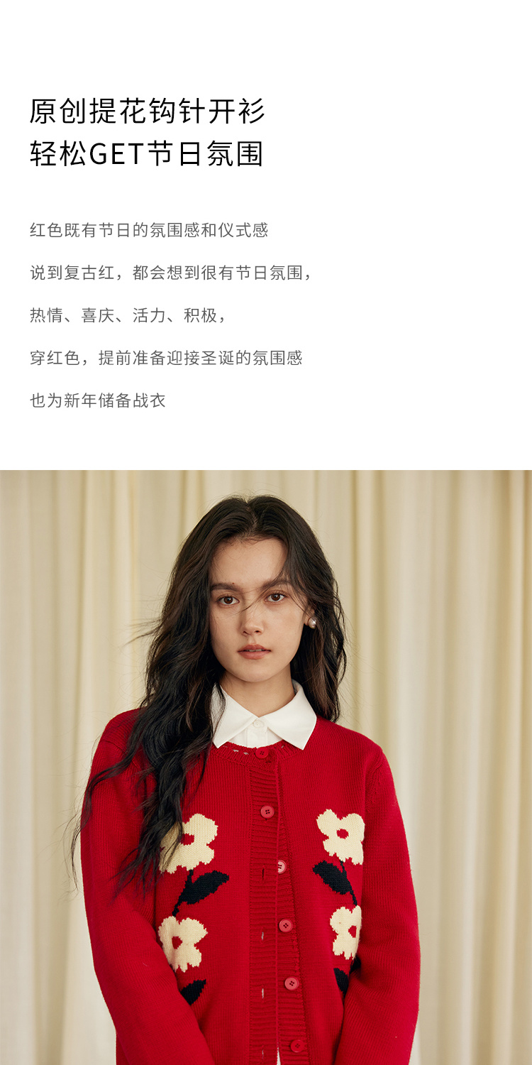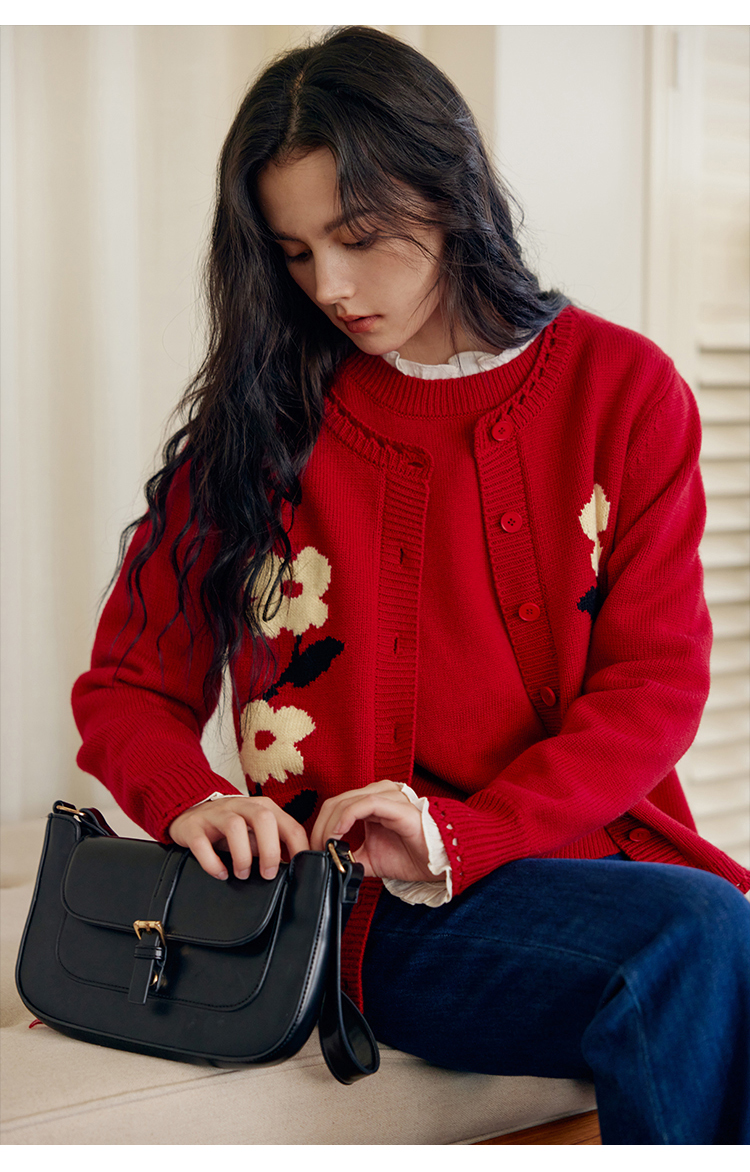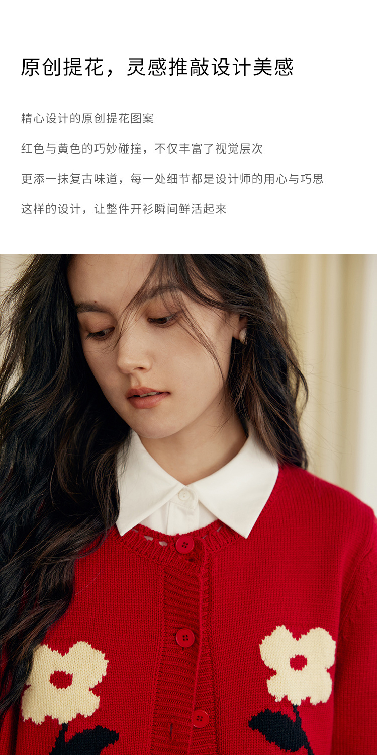HeyDress原创提花针织开衫女秋冬法式宽松红色毛衣软糯羊毛上衣