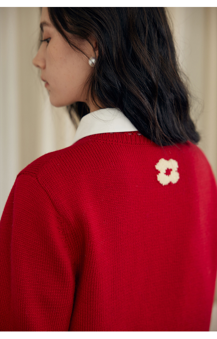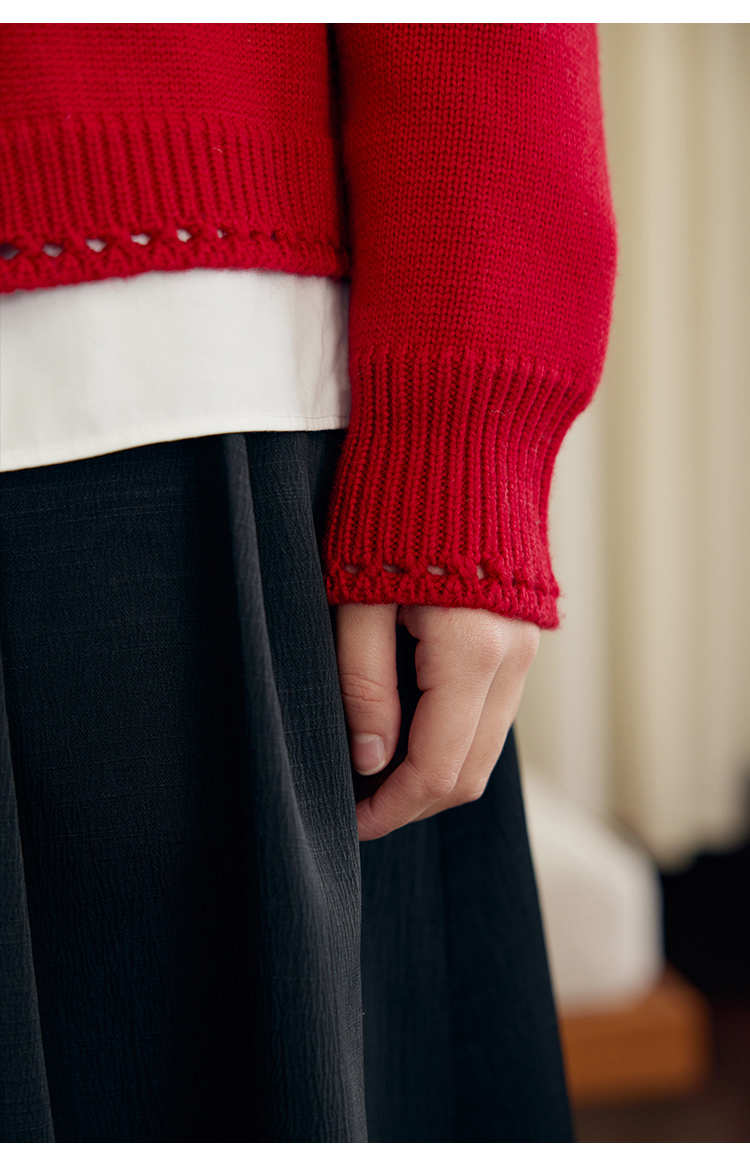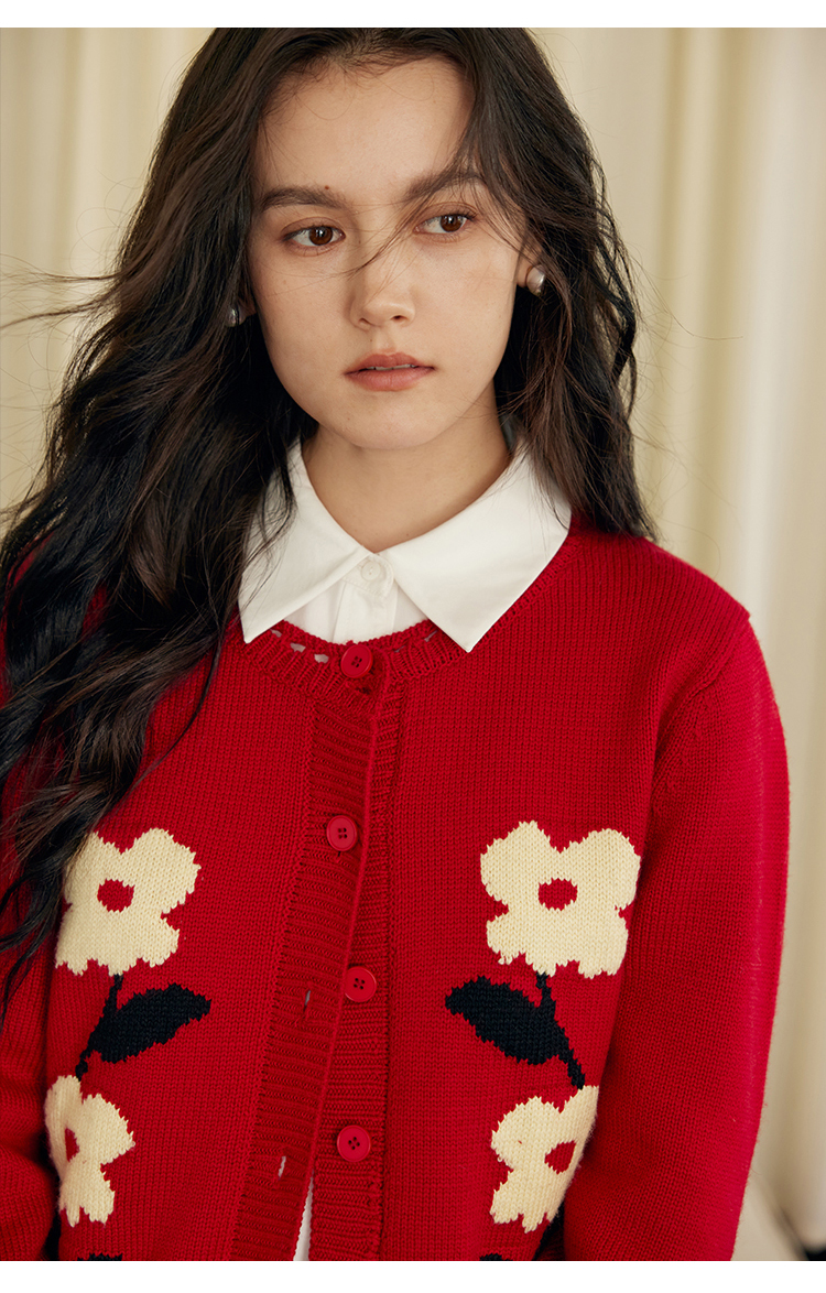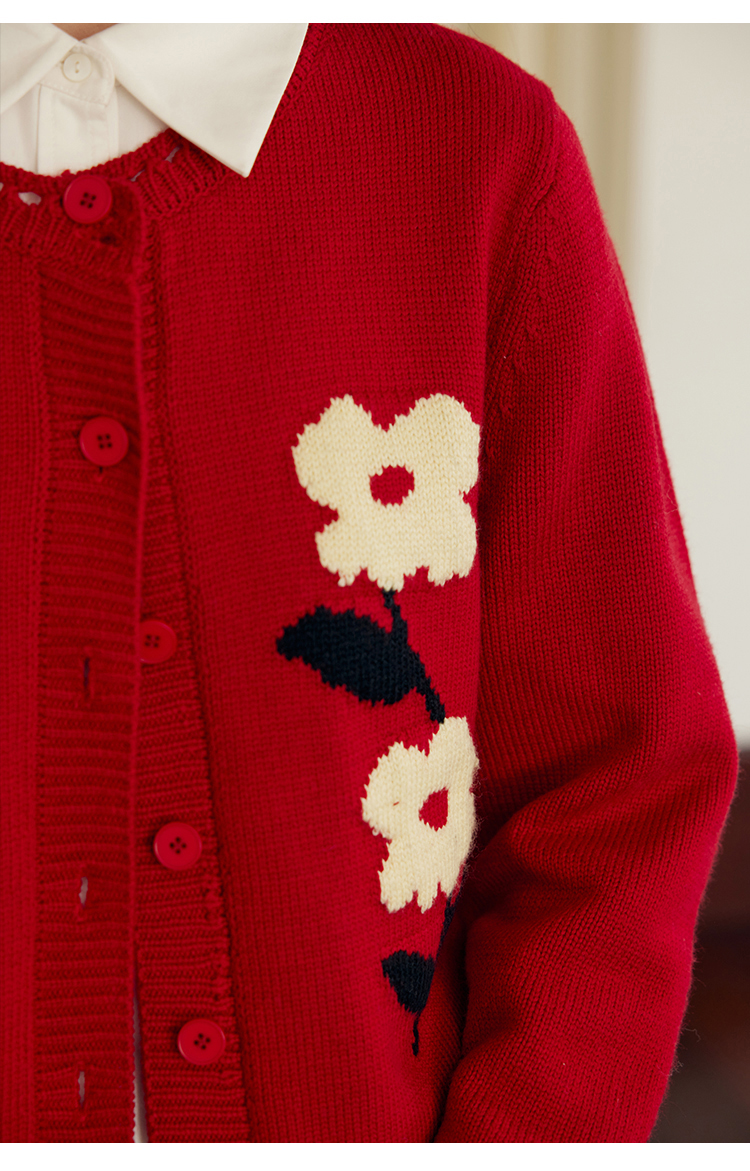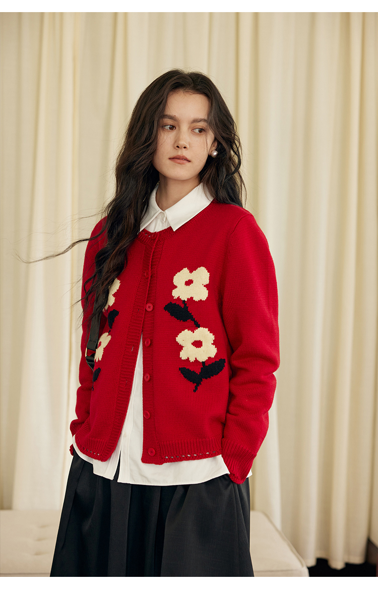 HeyDress原创提花针织开衫女秋冬法式宽松红色毛衣软糯羊毛上衣