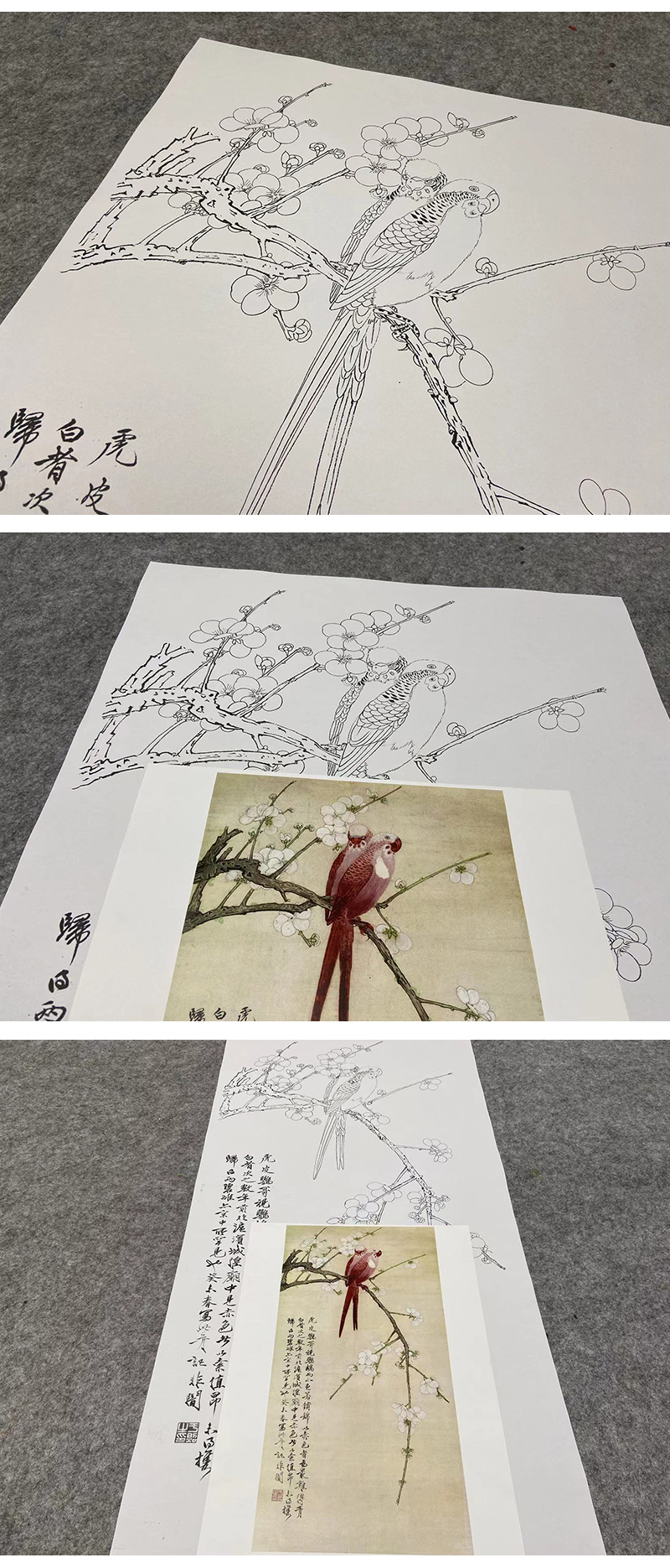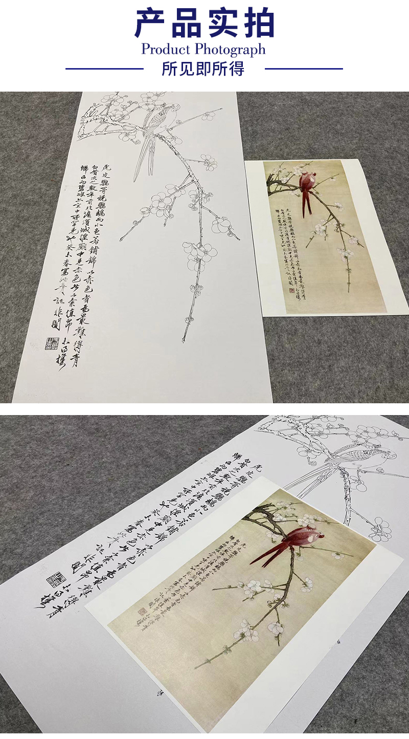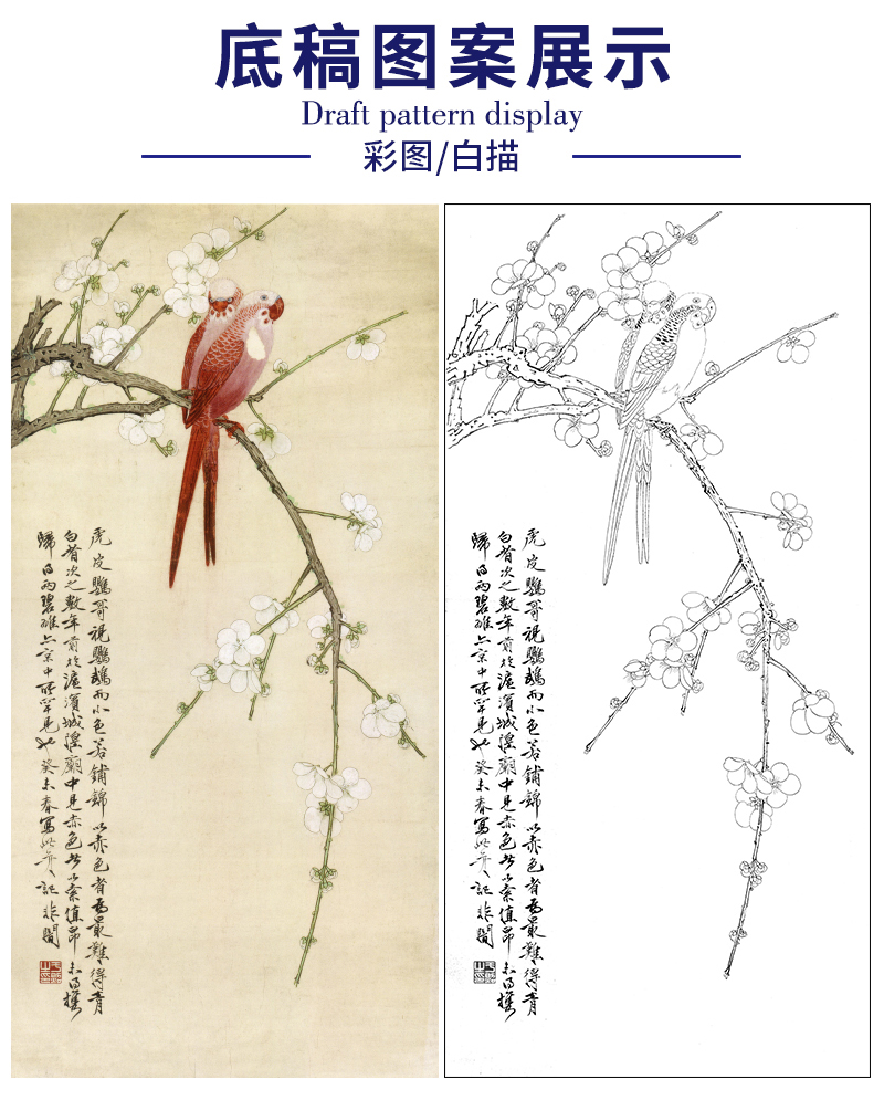 于非闇竖幅工笔花鸟白描底稿-鹦鹉梅花-红鹦白梅-YF50