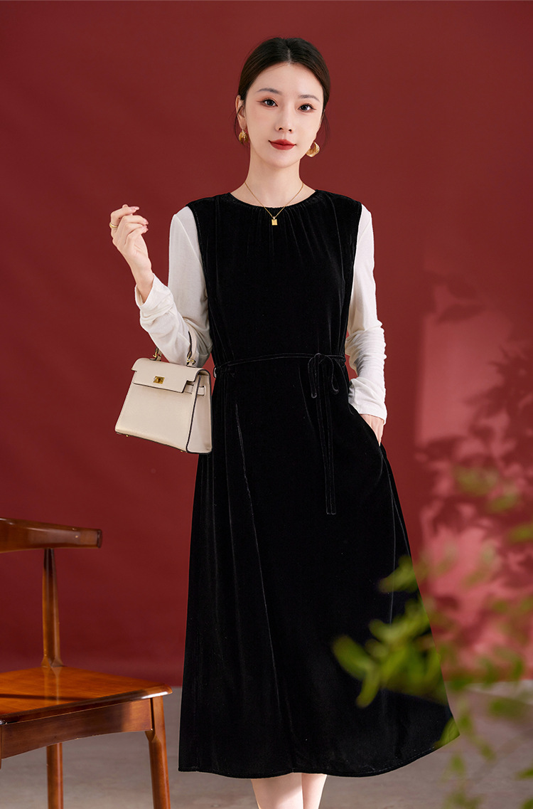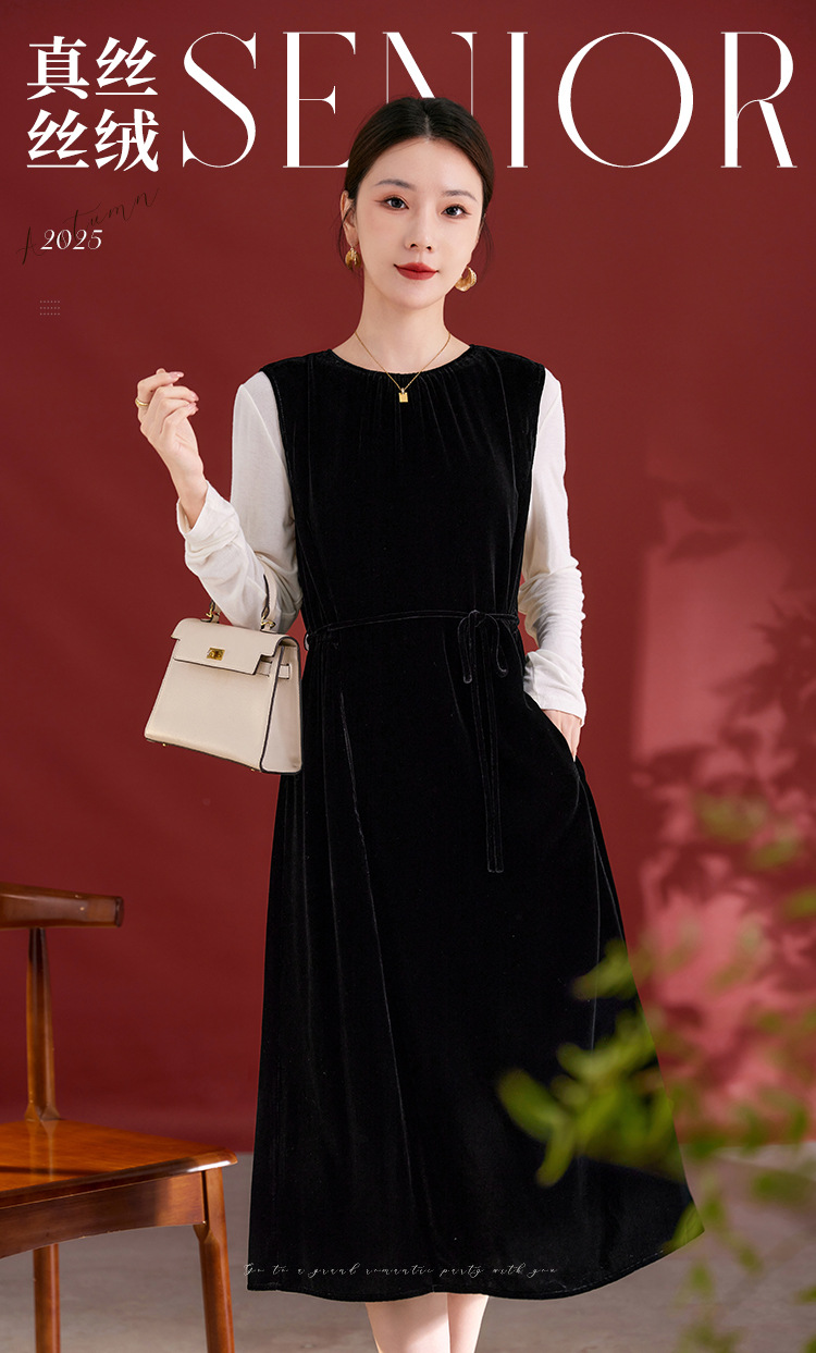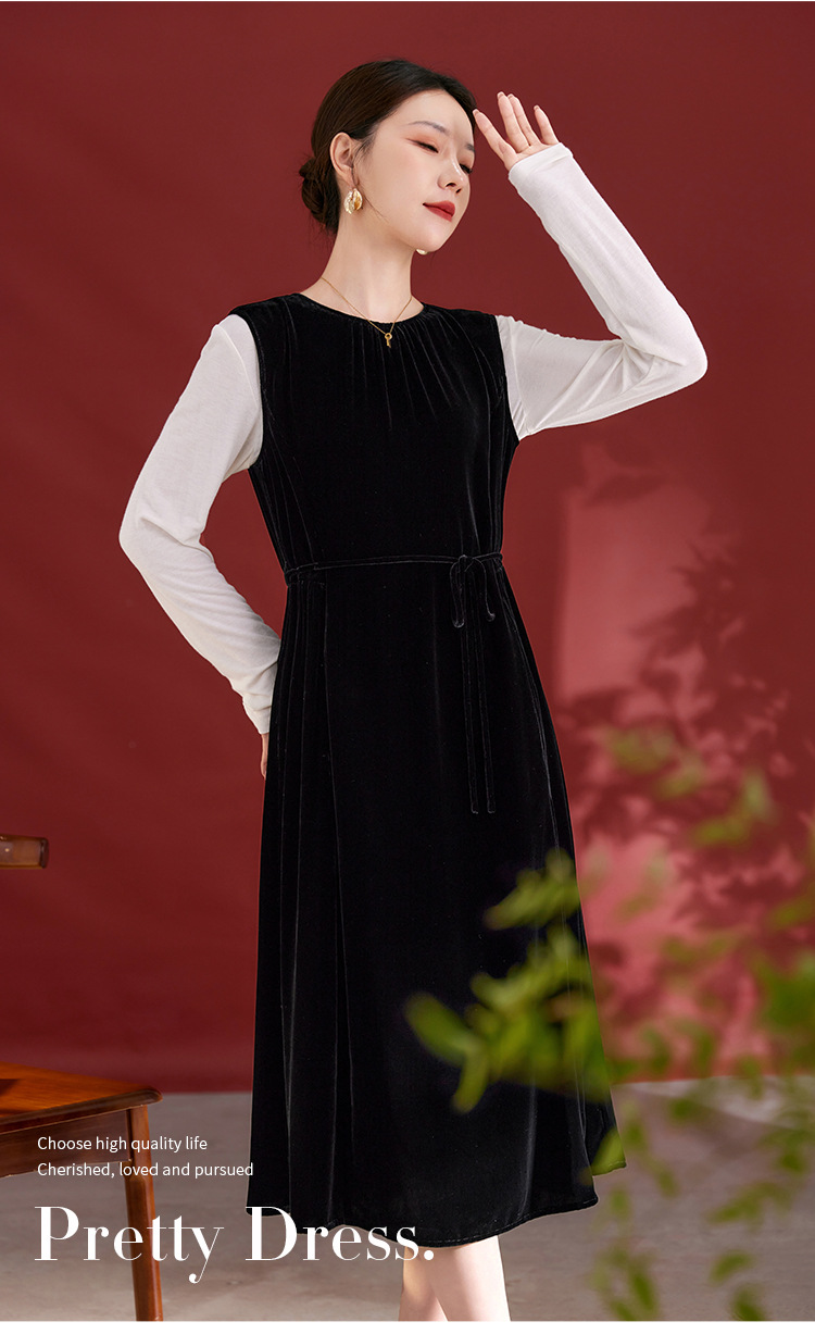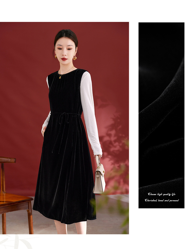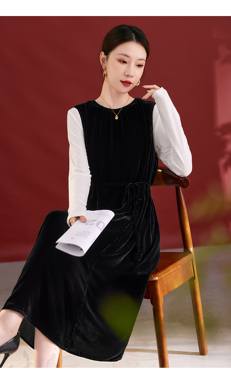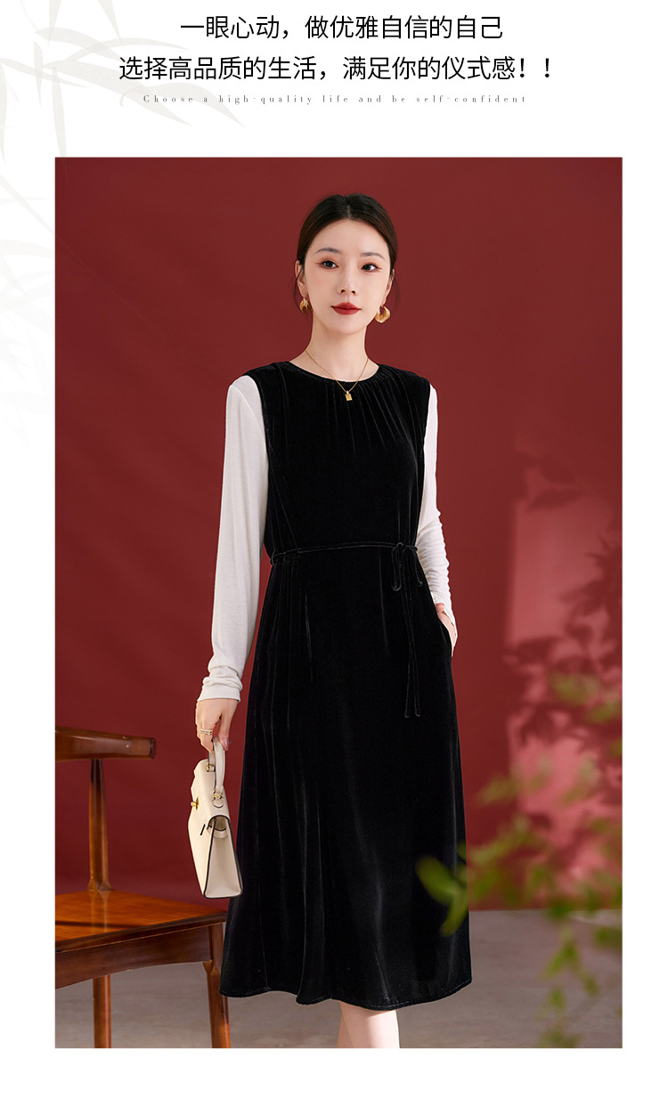 QS秋冬新款真丝丝绒背心连衣裙收腰气质日常通勤圆领中长款女1393