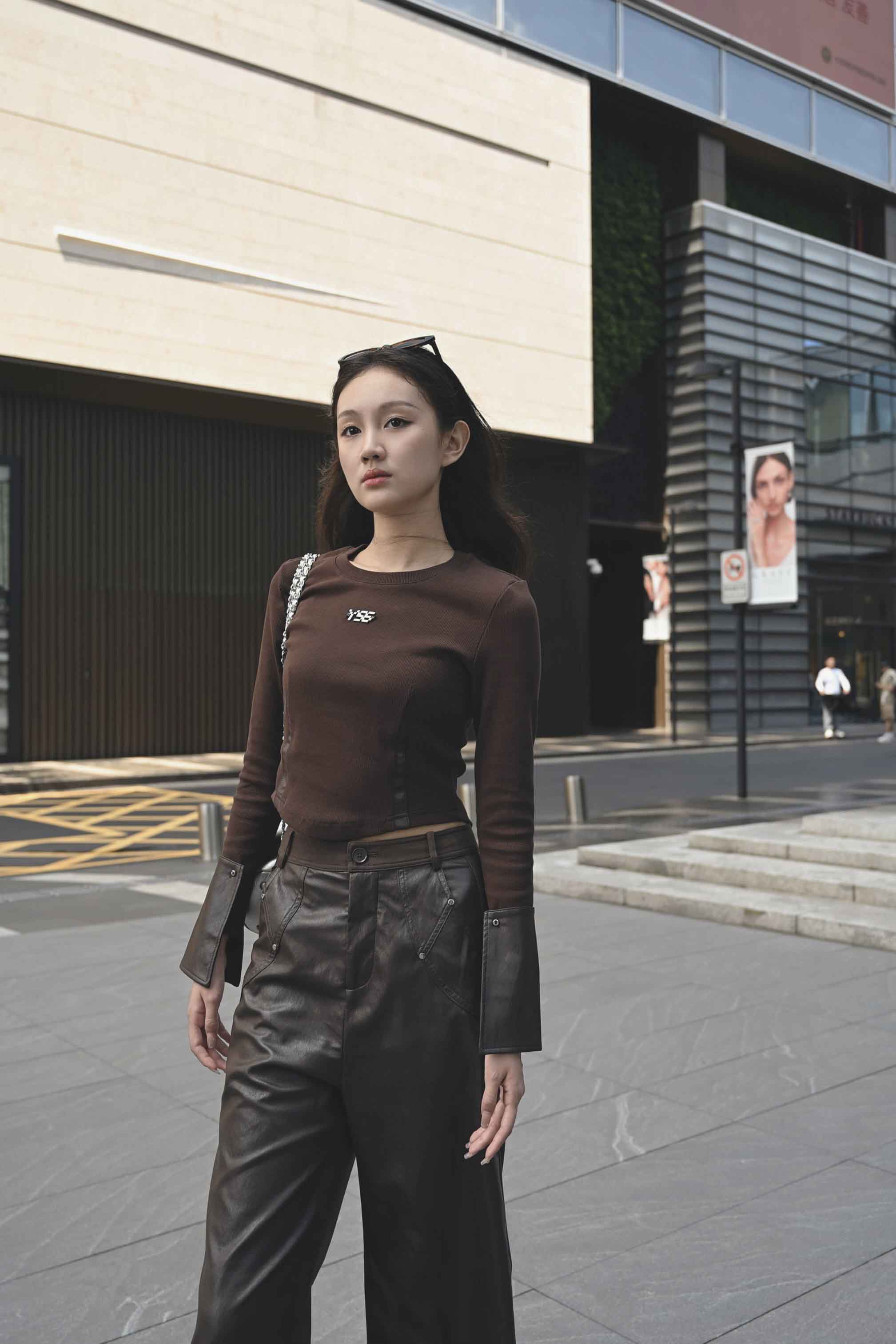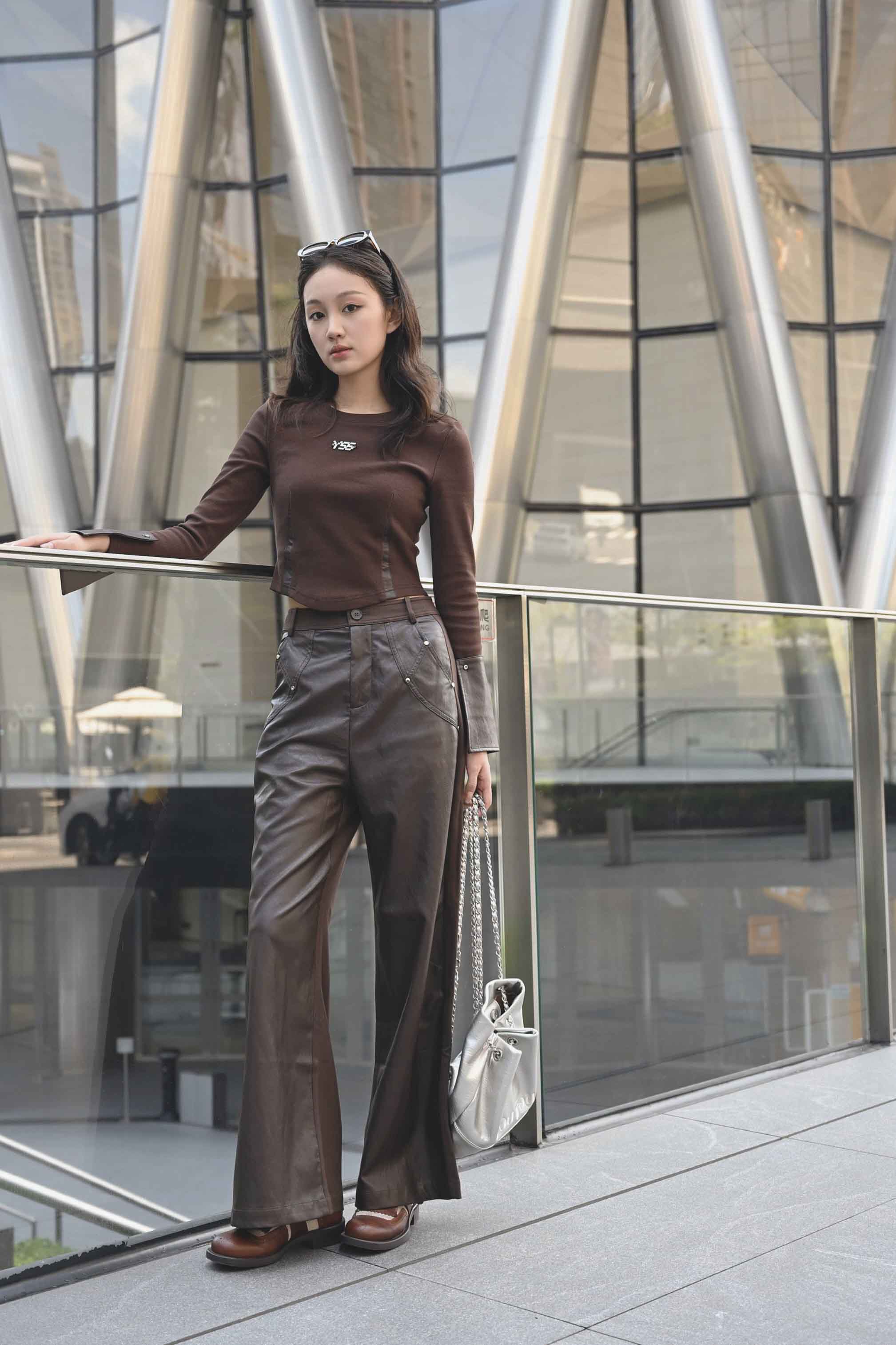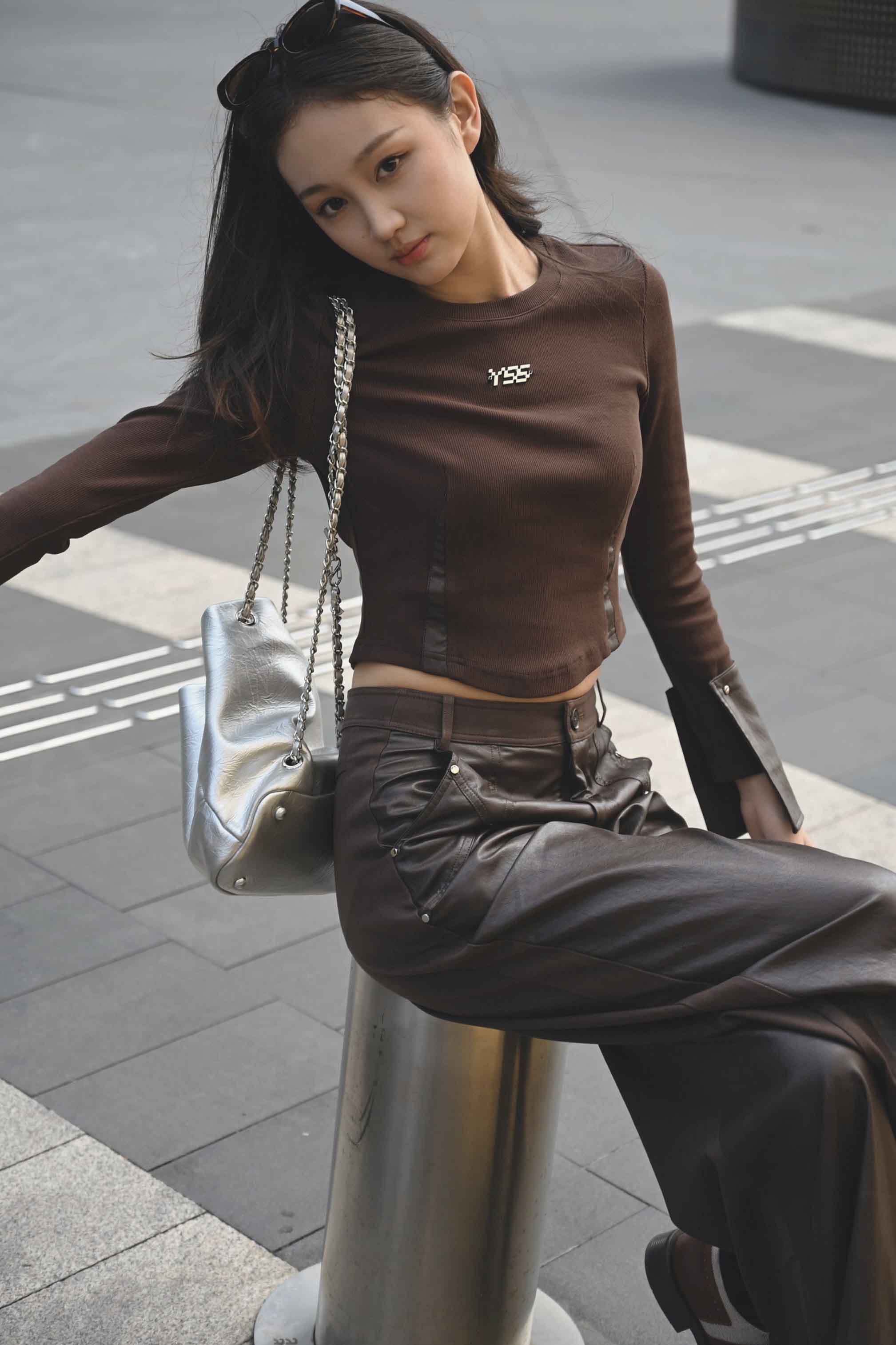 这条橡子灰棕的皮裤,有着明显的视觉收缩效果,可以收缩我们的腿围,视觉显瘦