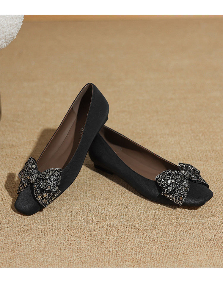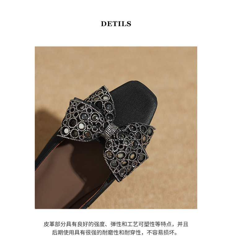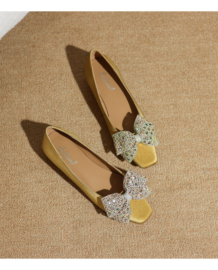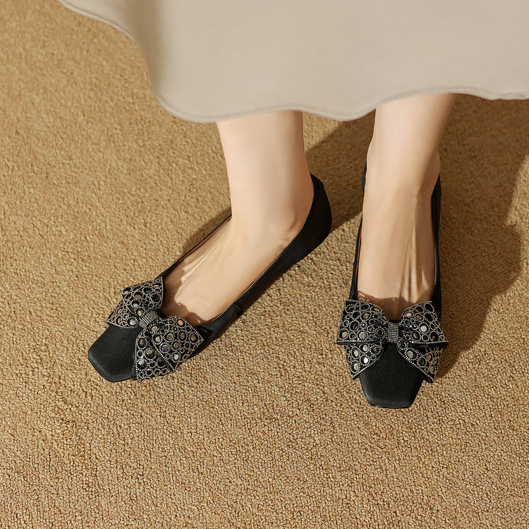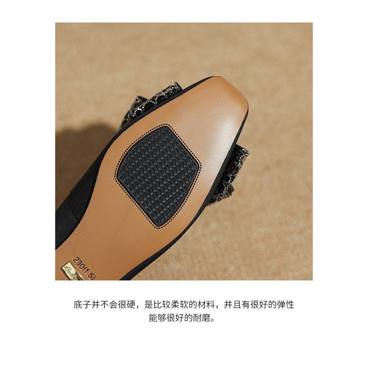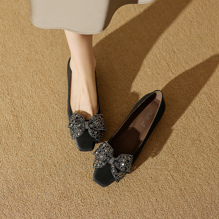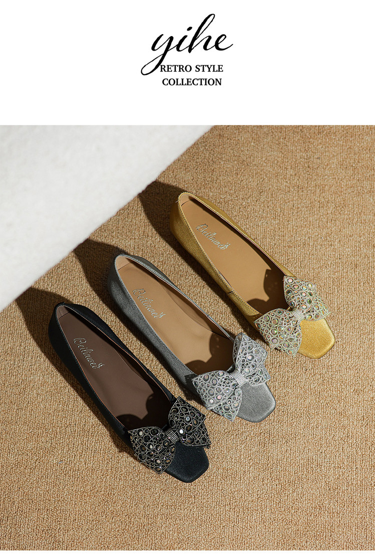 【预售5天】头层皮水钻蝴蝶结拼色时尚新款方头粗跟低跟浅口单鞋ZF&25191