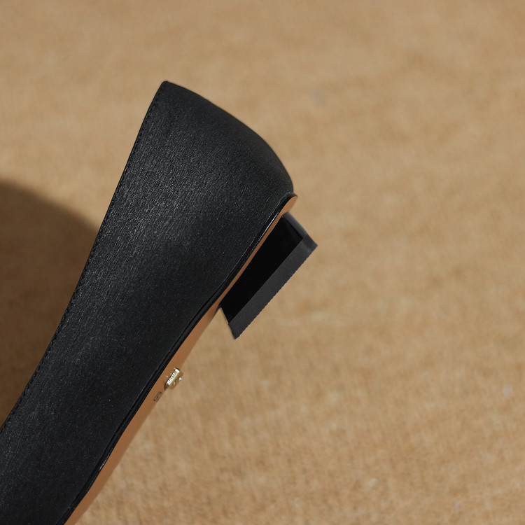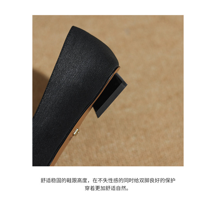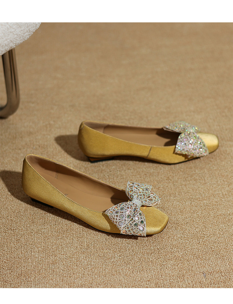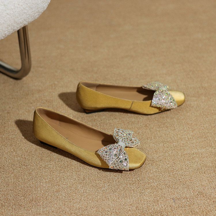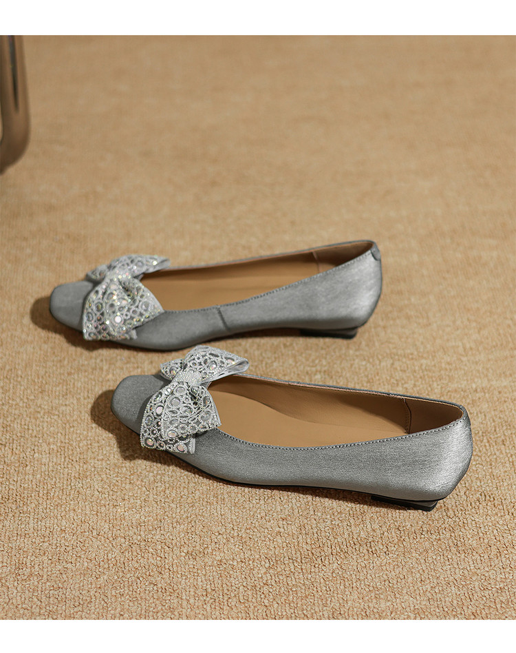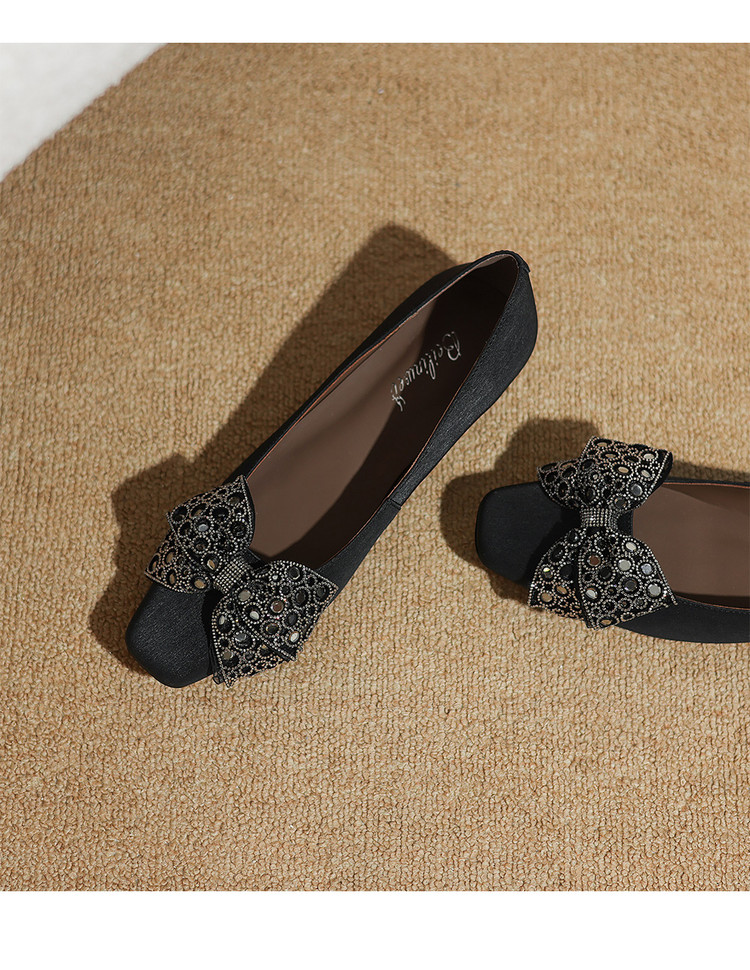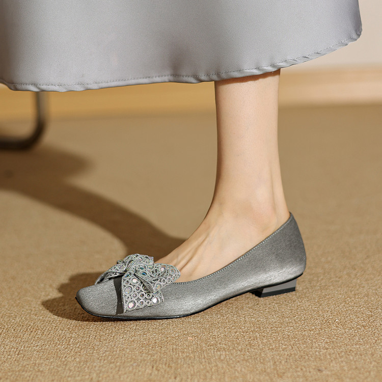 【预售5天】头层皮水钻蝴蝶结拼色时尚新款方头粗跟低跟浅口单鞋ZF&25191
