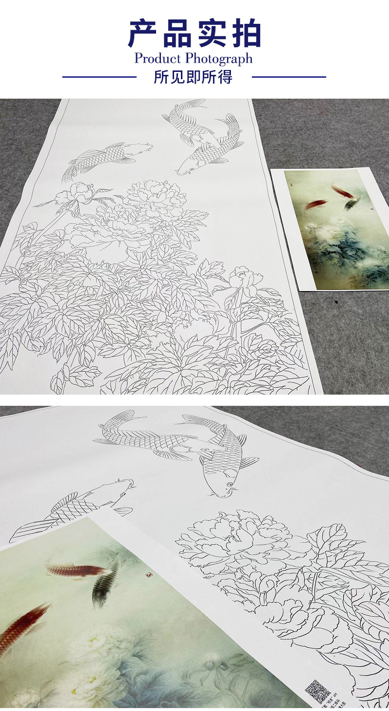 【大彩图】龚雪青工笔画白描底稿《三仙戏瑶池》牡丹鲤鱼临摹勾线花鸟线稿XQ58