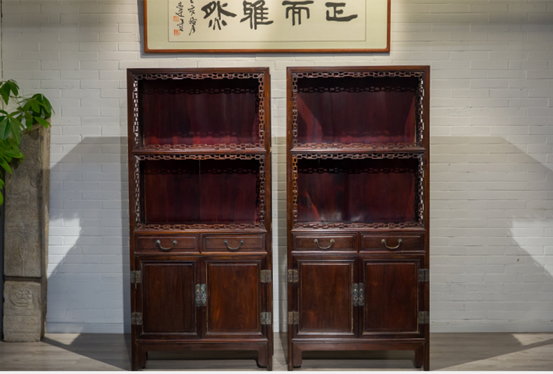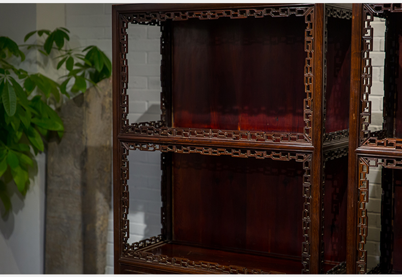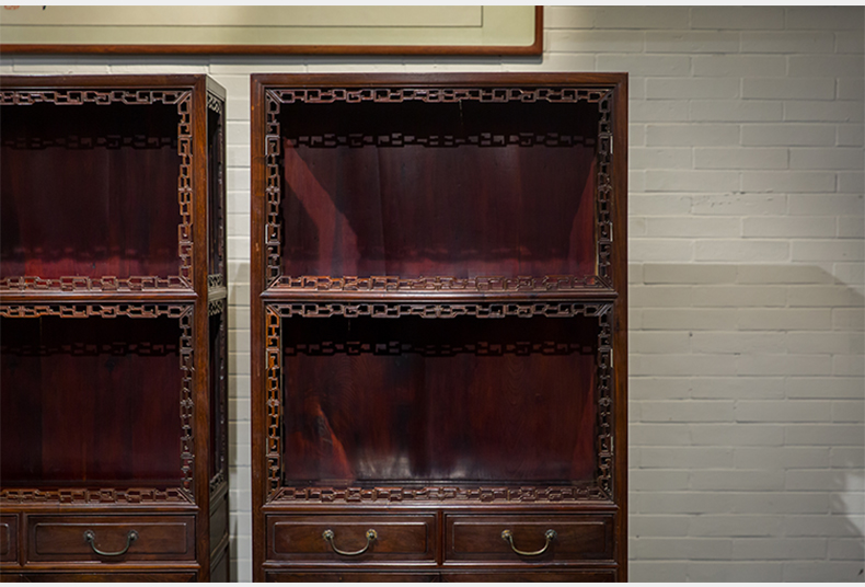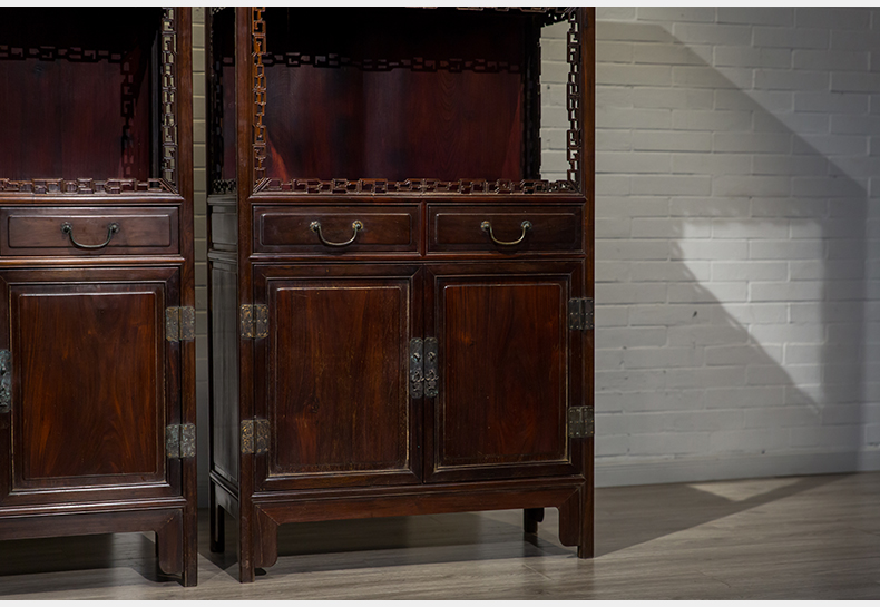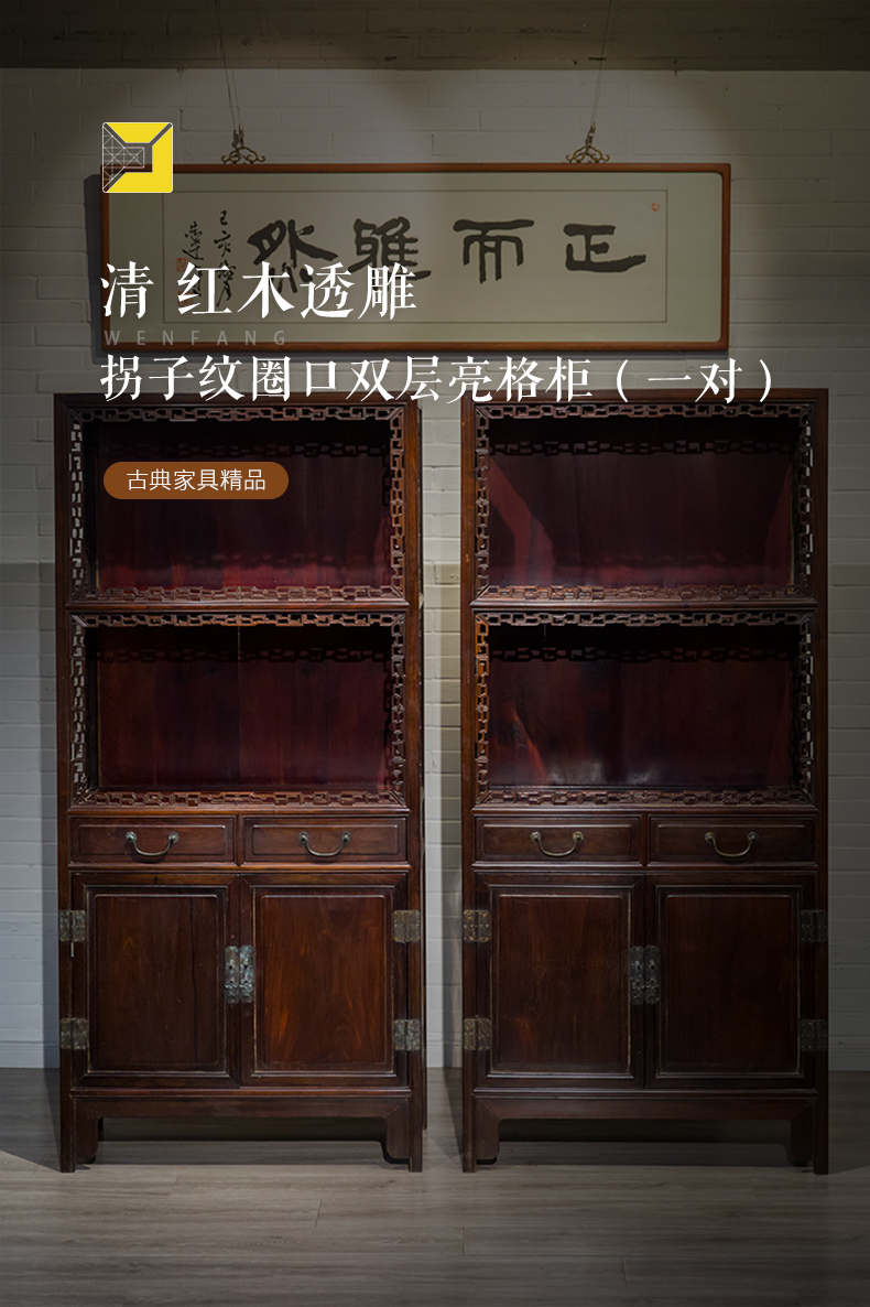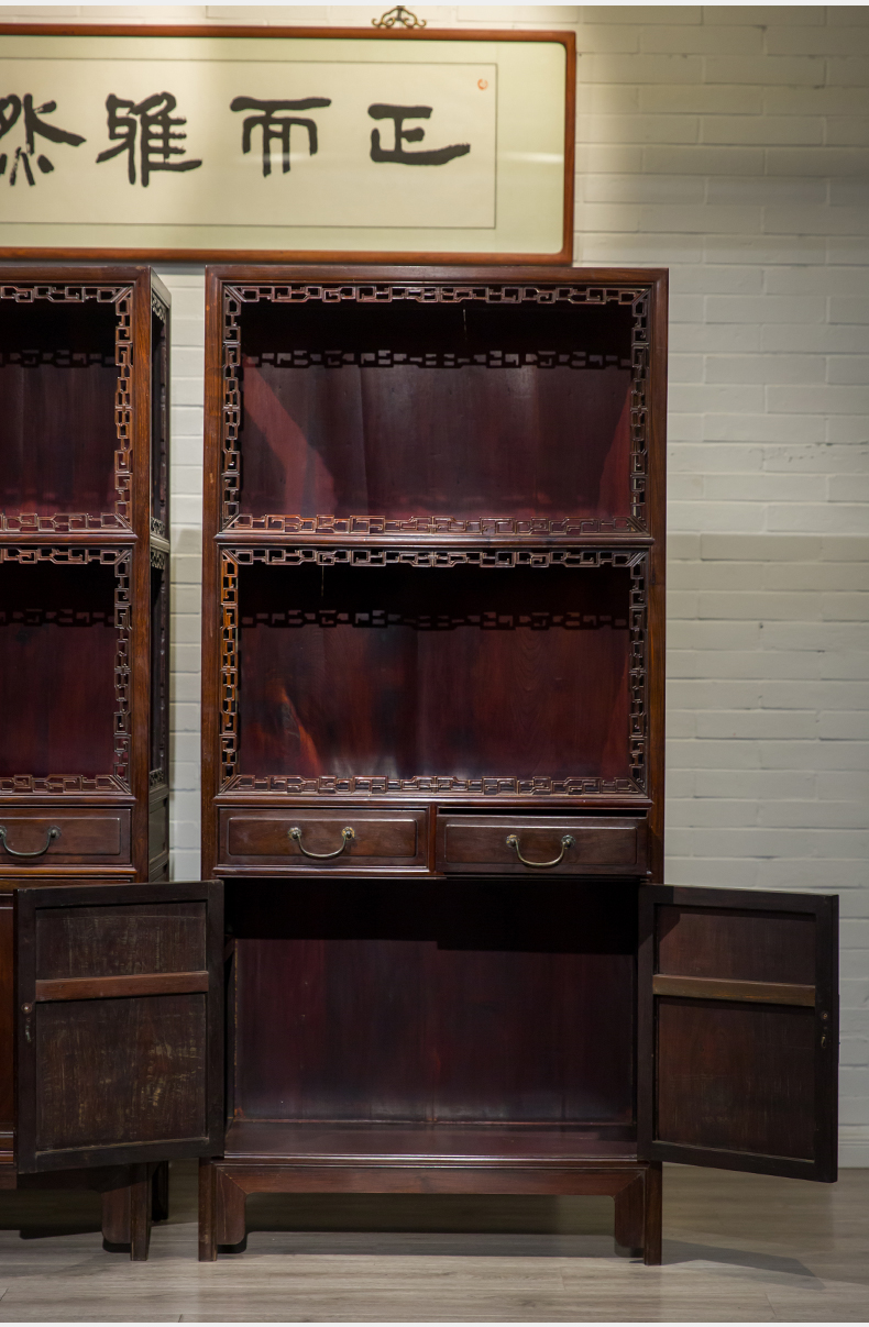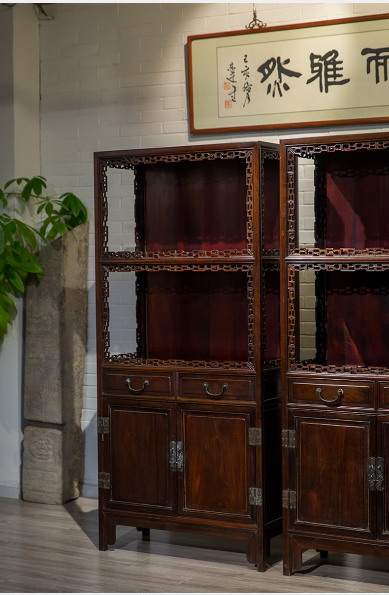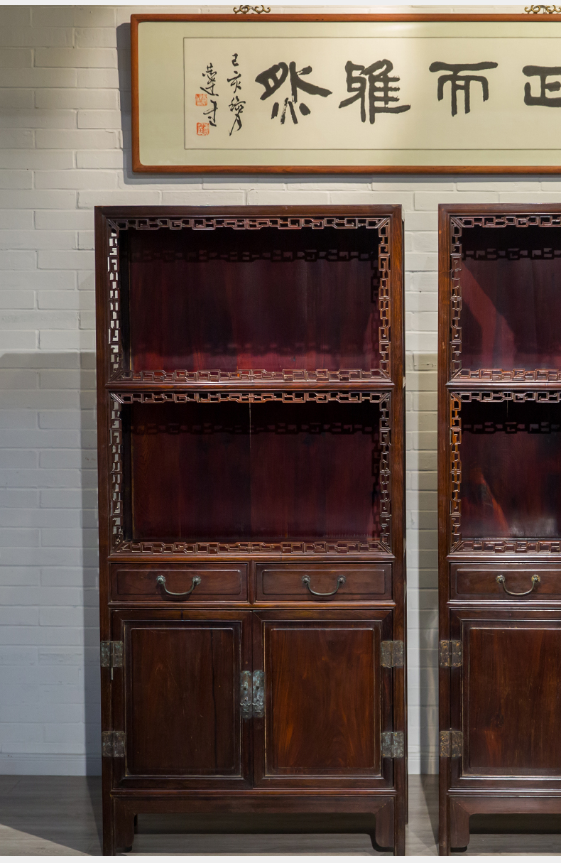 清 红木透雕拐子纹圈口双层亮格柜(一对)