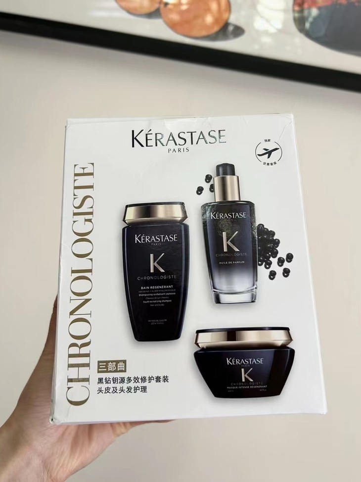 👑卡诗黑钻鱼子酱三件套 👍高级洗护套装 💥洗发水:修受损、减缓头皮老化、强韧发丝,适合所有发质。 🔥精油:能够直接闭合毛鳞片,柔顺效果明显,修复毛躁干枯效果好 💎发膜:亮泽秀发、改善干枯、毛躁顺滑、密集滋养 ✅使头发恢复健康,达到满分水润状态100% ✨中性淡雅的木质香味 🙌所有发质都适合,特别是容易毛躁干发、染烫受损发质 【套盒包括】:洗髮水250ml+精油100ml+髮膜200ml