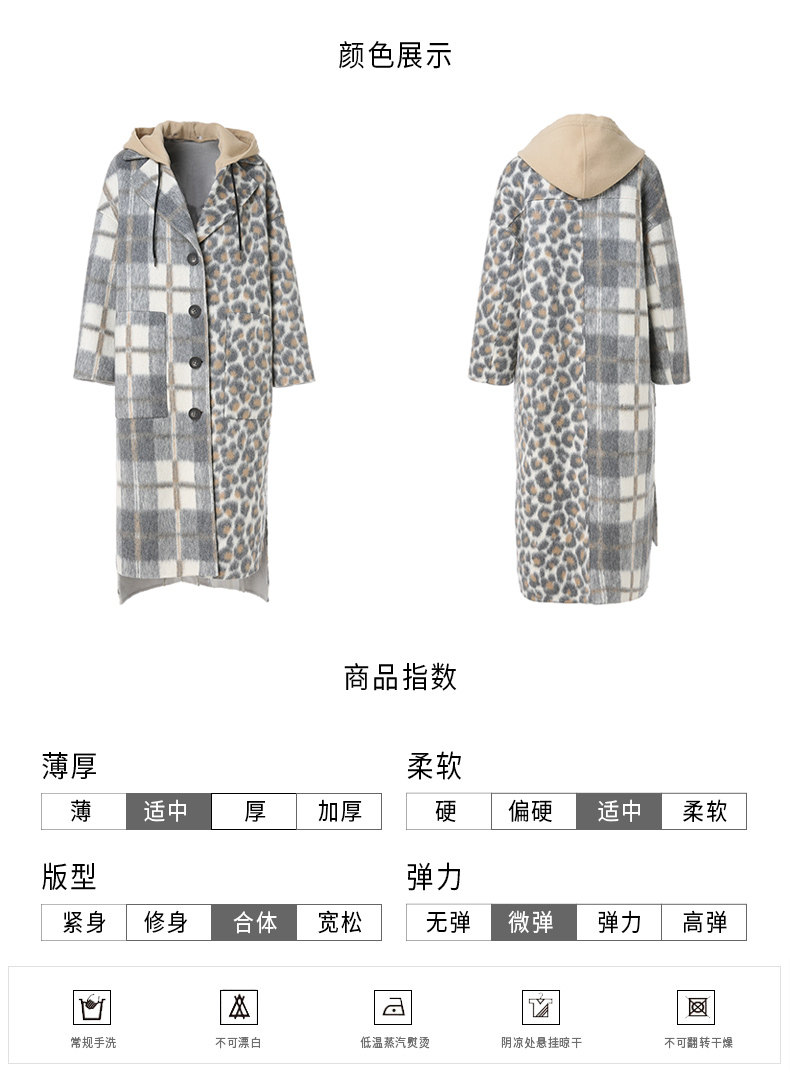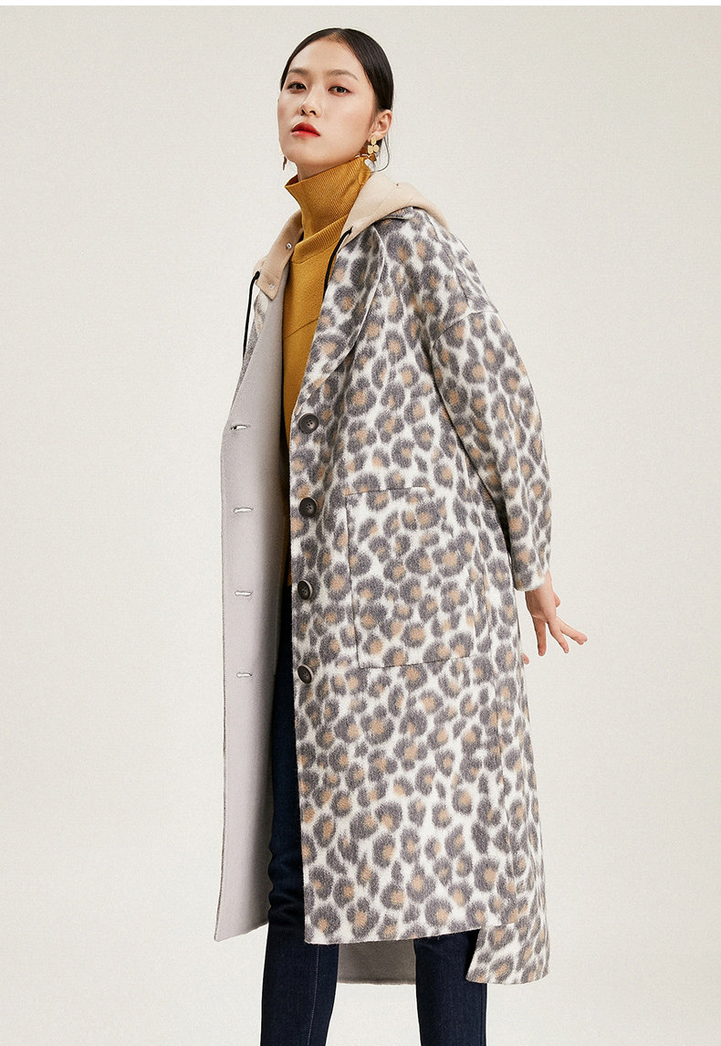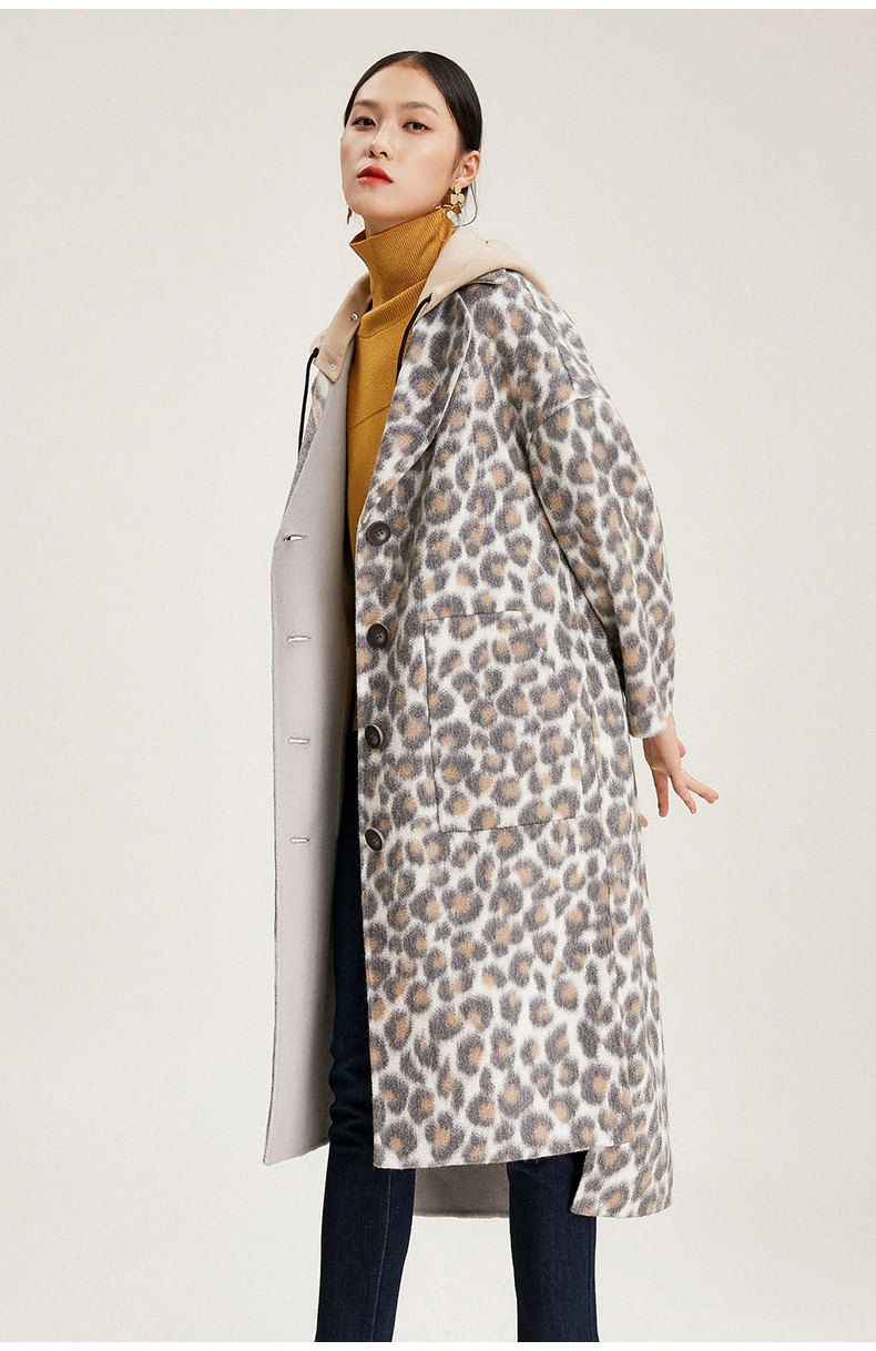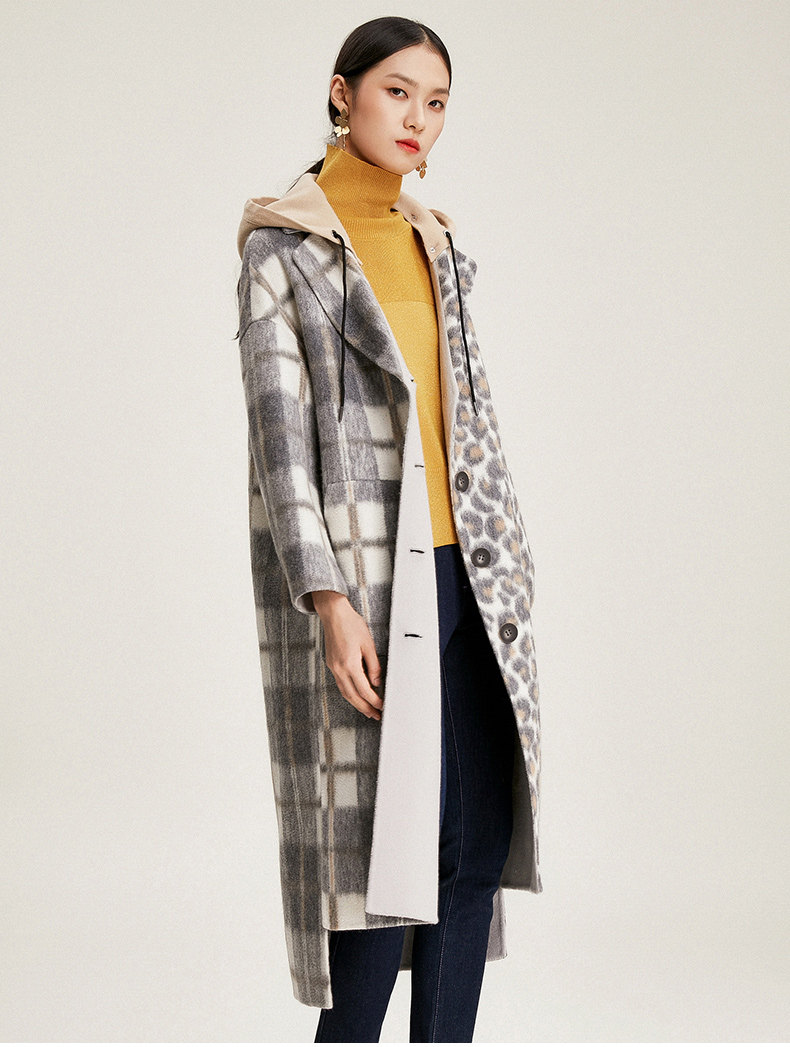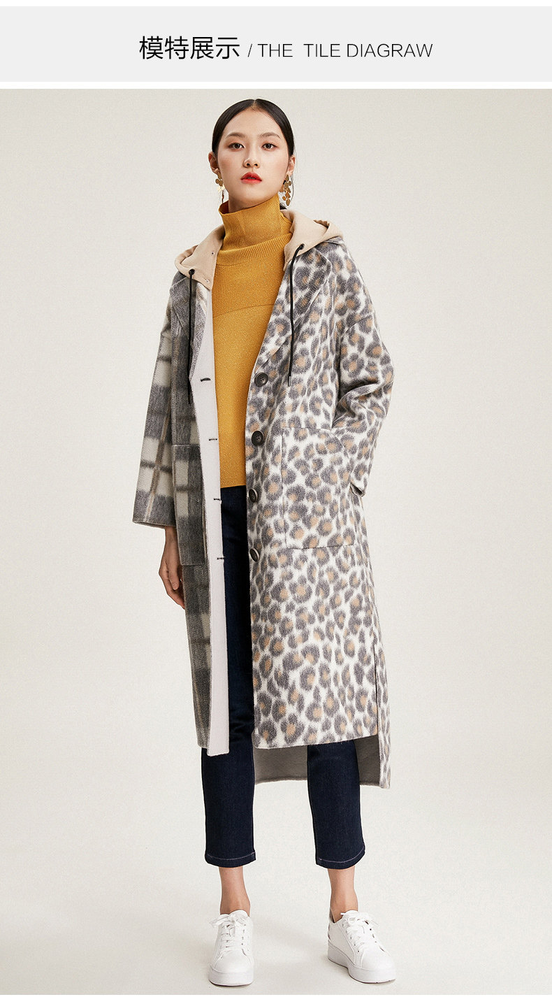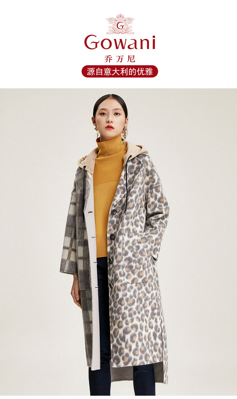 【绵羊毛】乔万尼秋冬大衣中长款毛呢大衣连帽外套时尚格子豹纹大衣EN4A789
